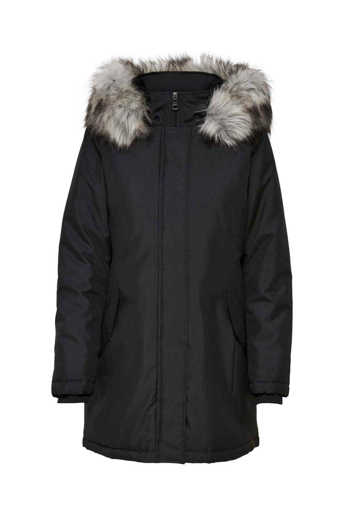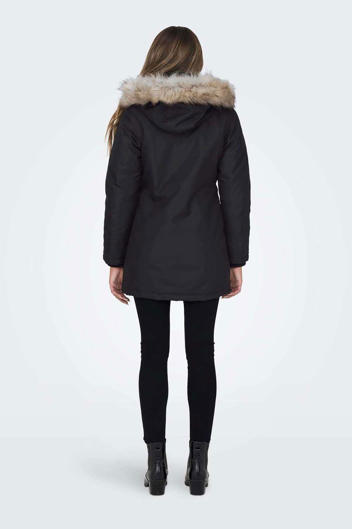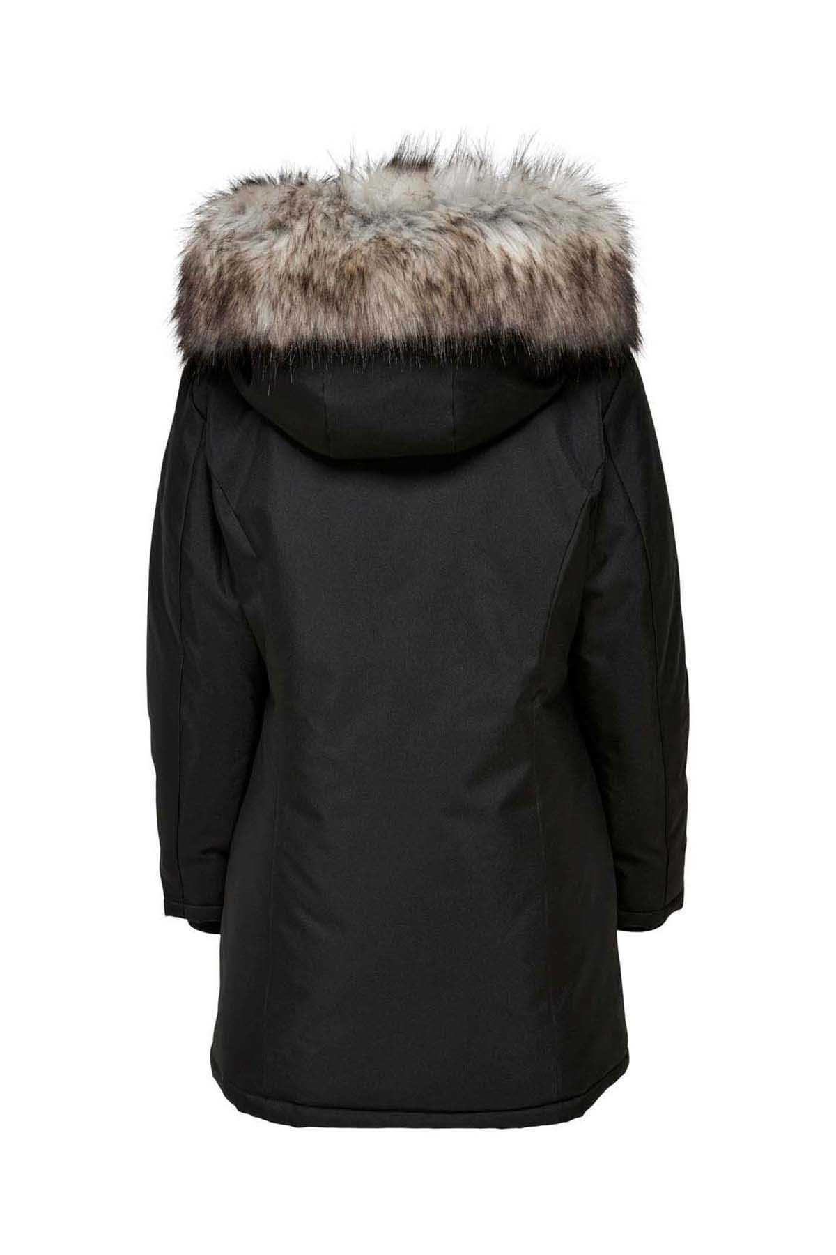 Detay: Suni çıkarılabilir kürk, yan cepli, midi boy mont;