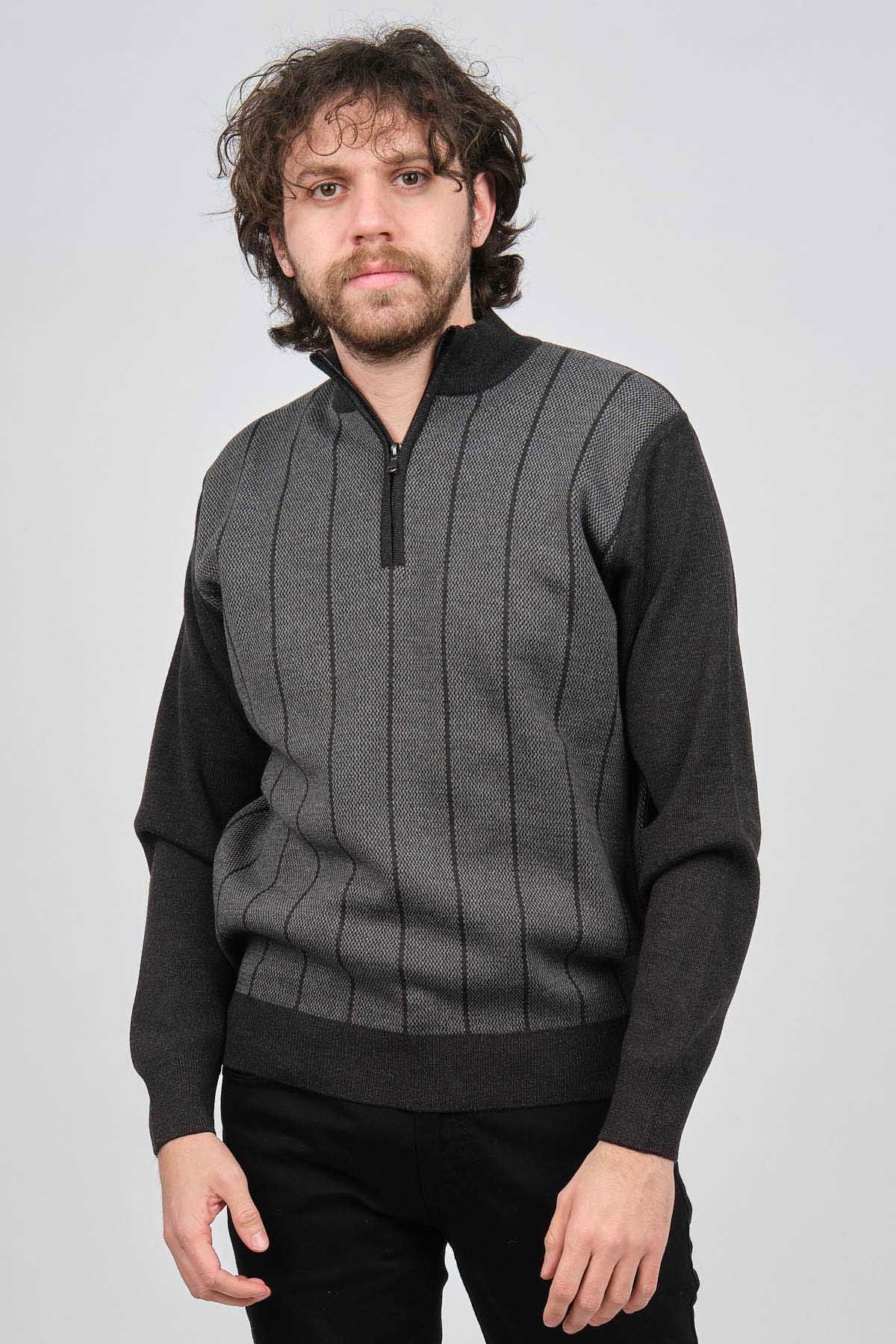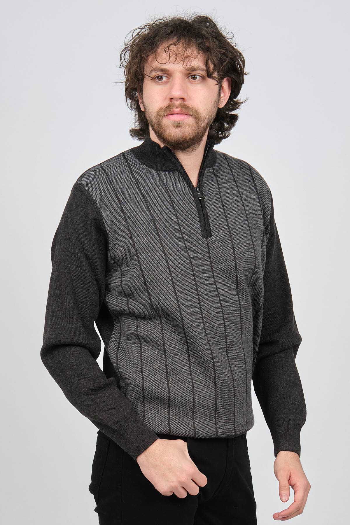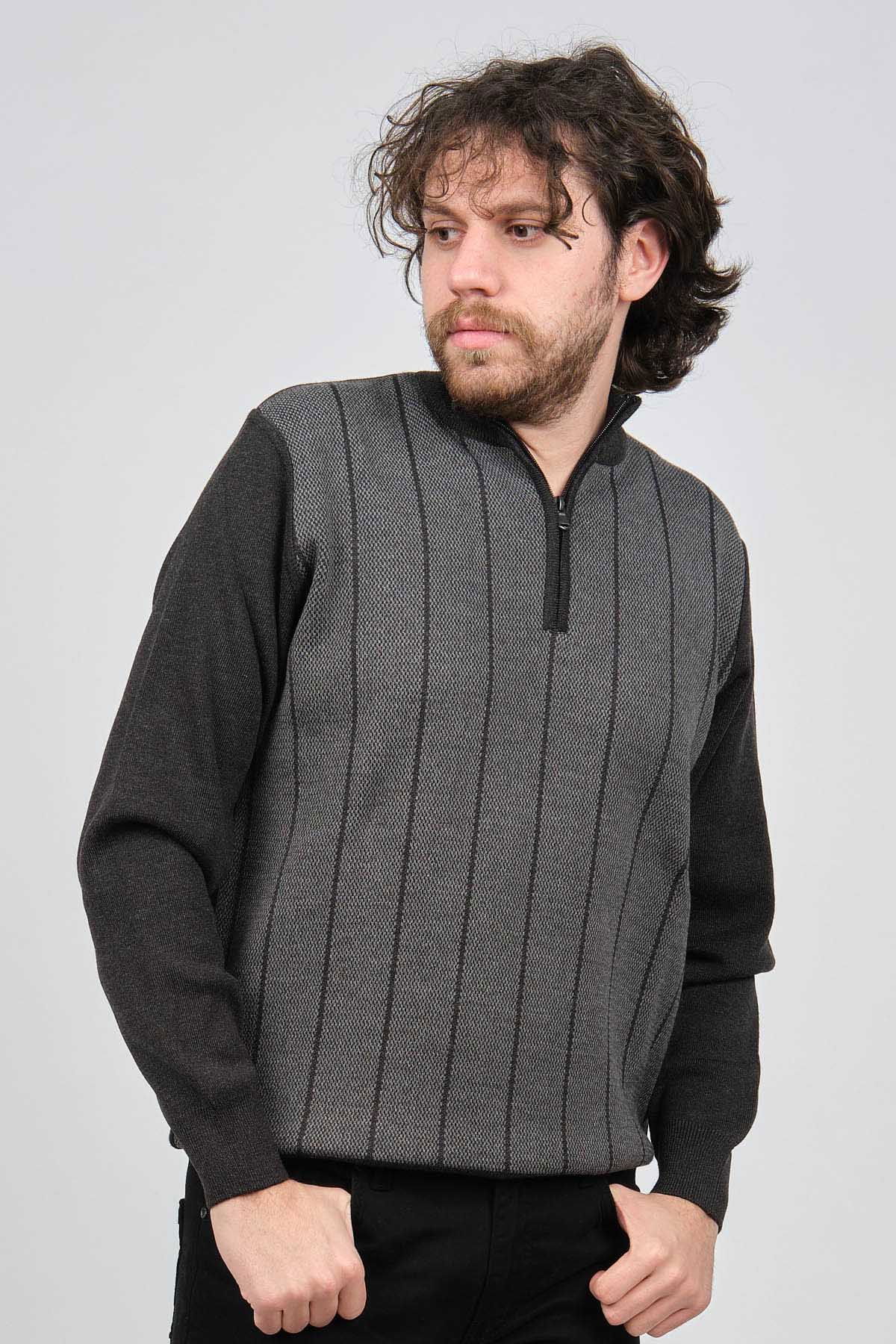 Pave Erkek Çizgi Desenli Fermuarlı Yün Kazak 4539190 Füme