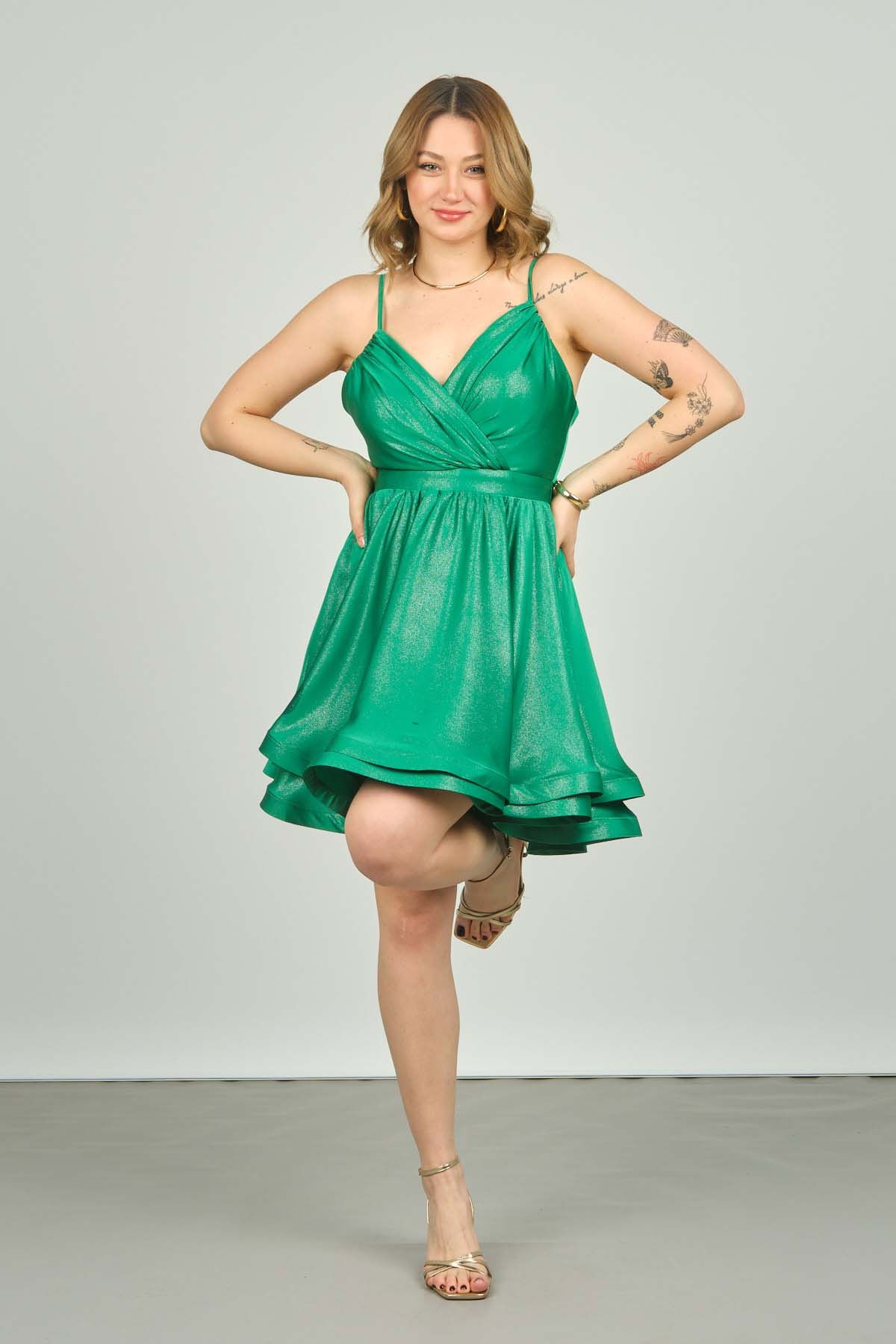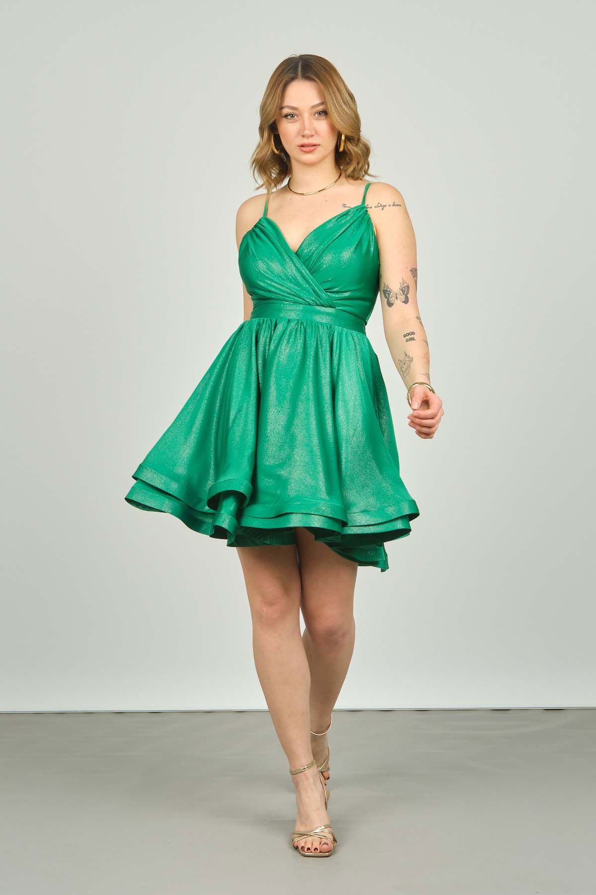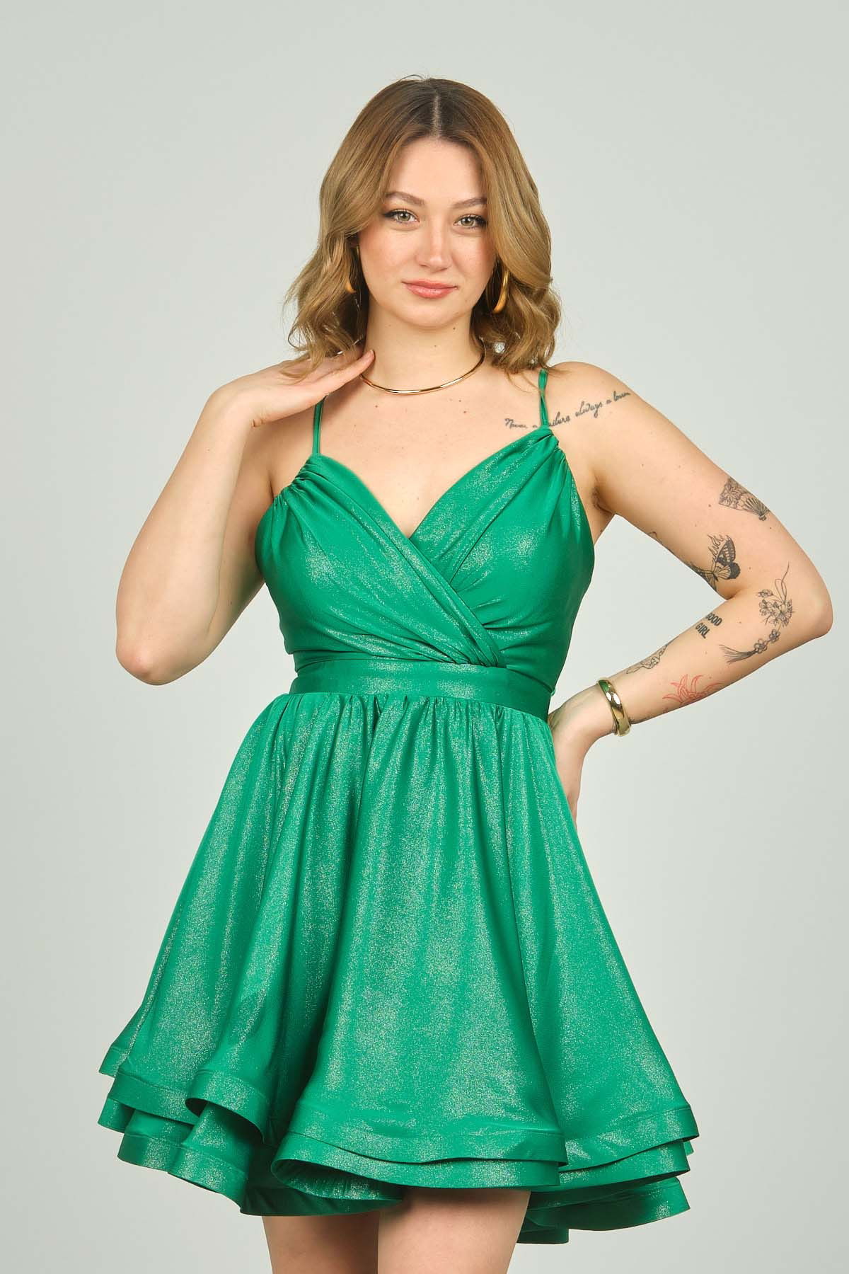 Detay: Sırt detaylı, eteği katlı, mini abiye elbise;