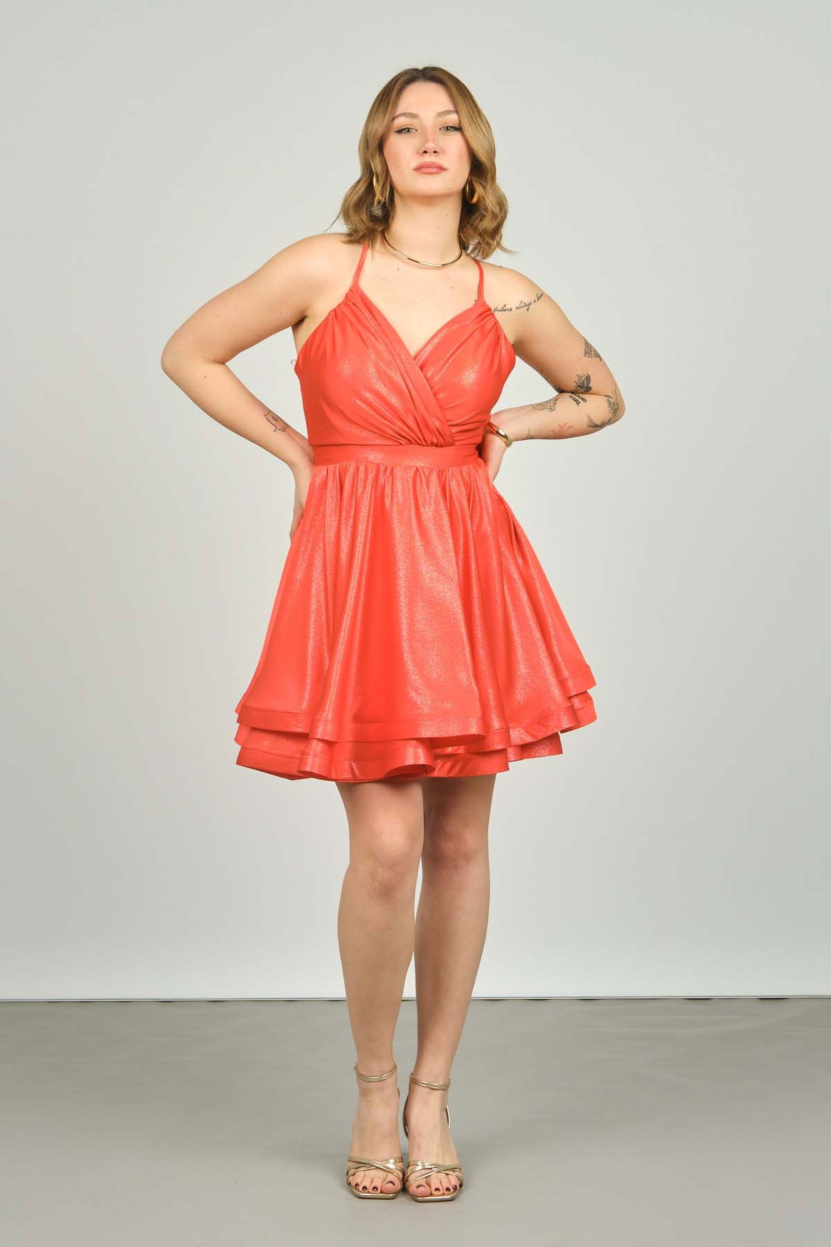Saygın Kadın Askılı Eteği Kat Detaylı Mini Abiye Elbise 3509 Mercan