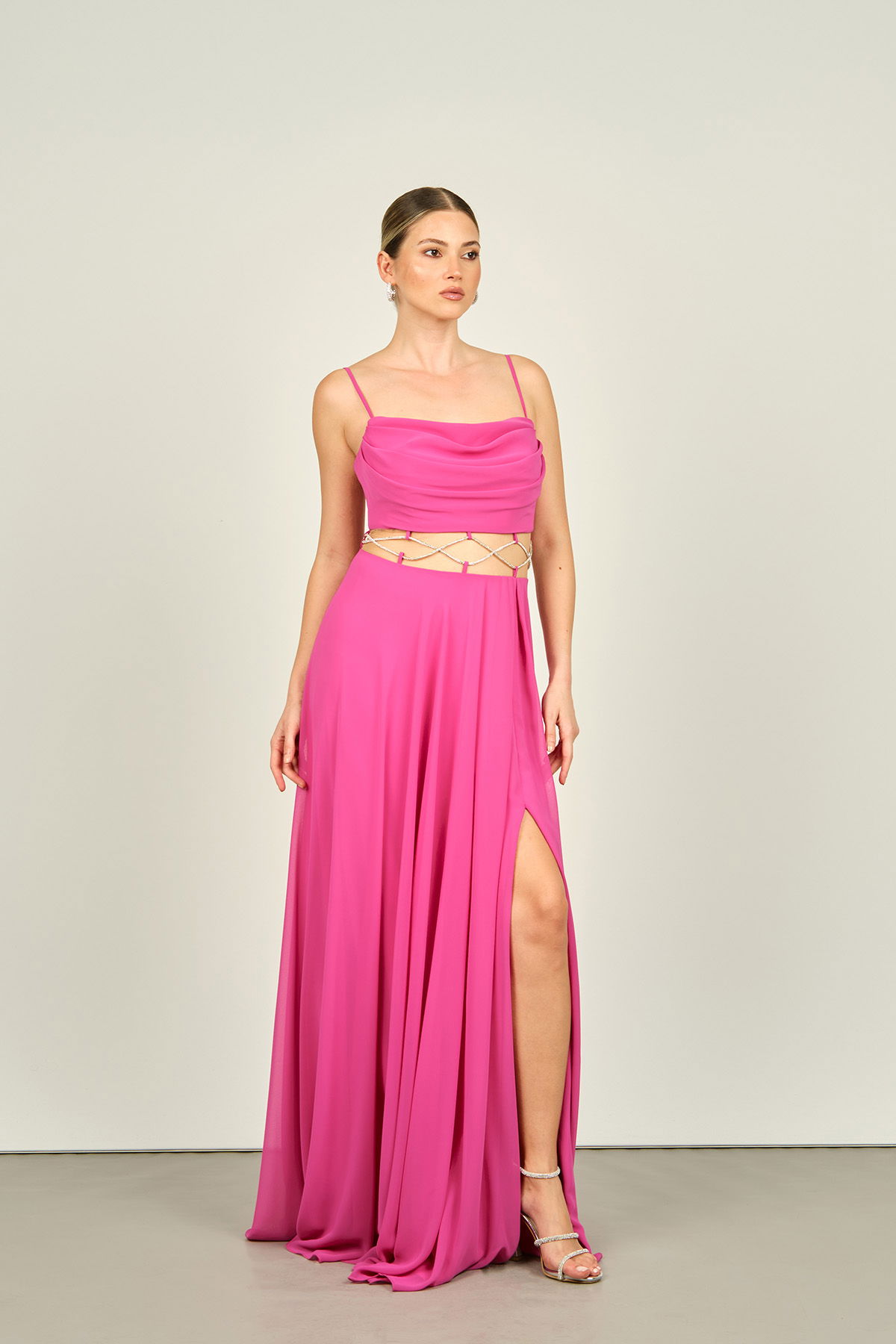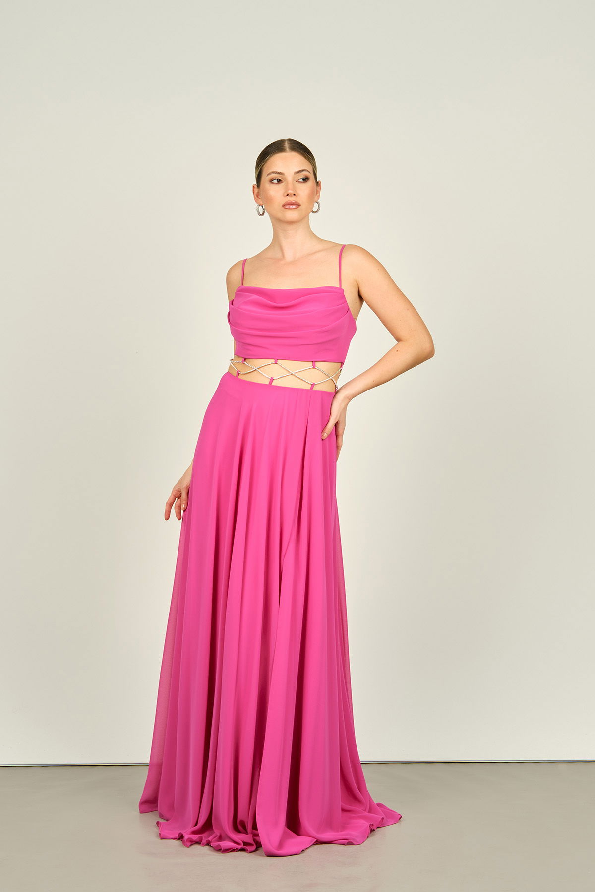 Saygın Kadın Askılı Göbek Tranparan ve Taş Detaylı Şifon Abiye Elbise 4584 Fuşya