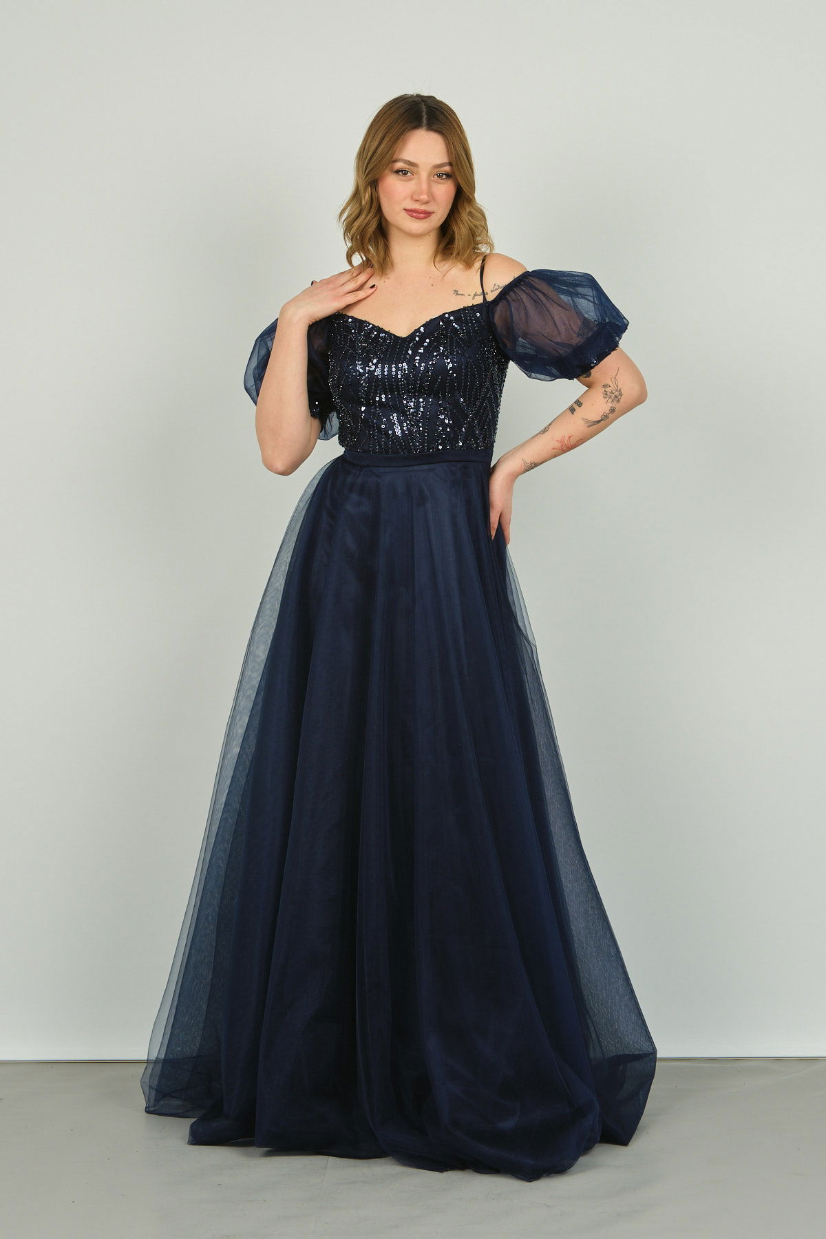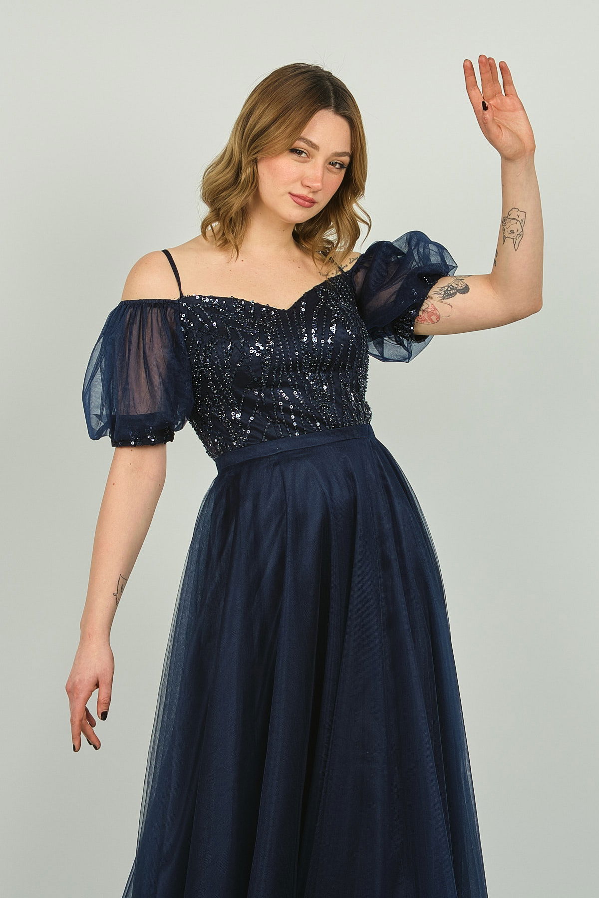 Saygın Kadın Balon Kol Askılı Pul Payetli Tül Uzun Abiye Elbise 3488 Lacivert