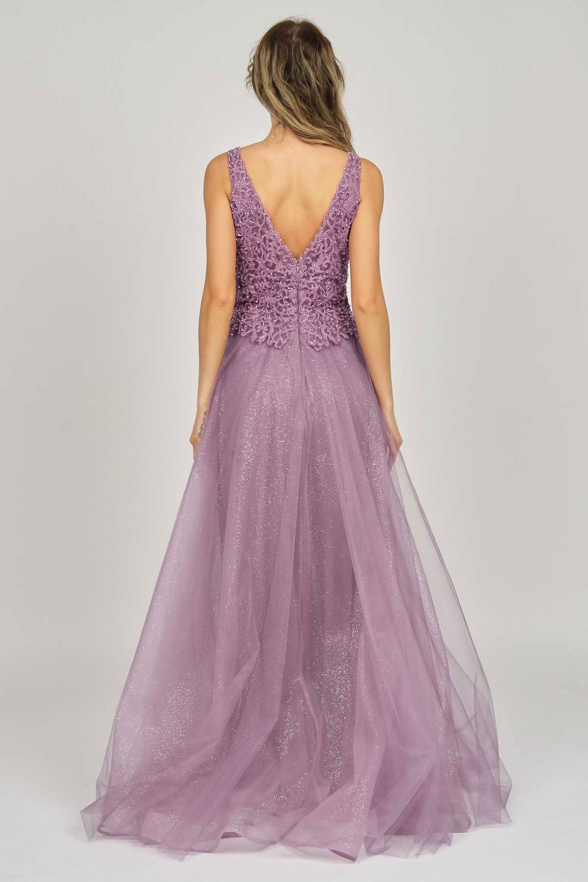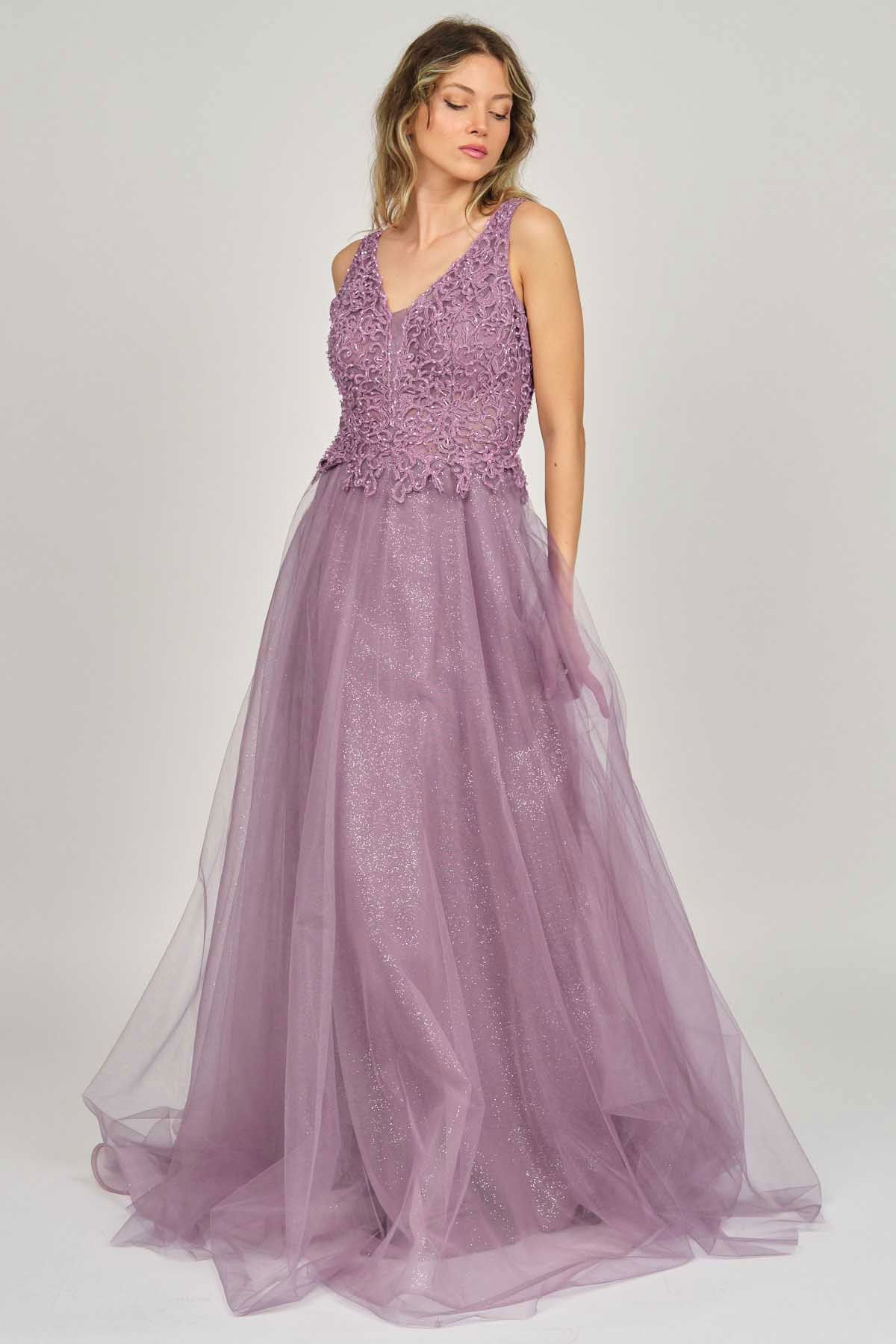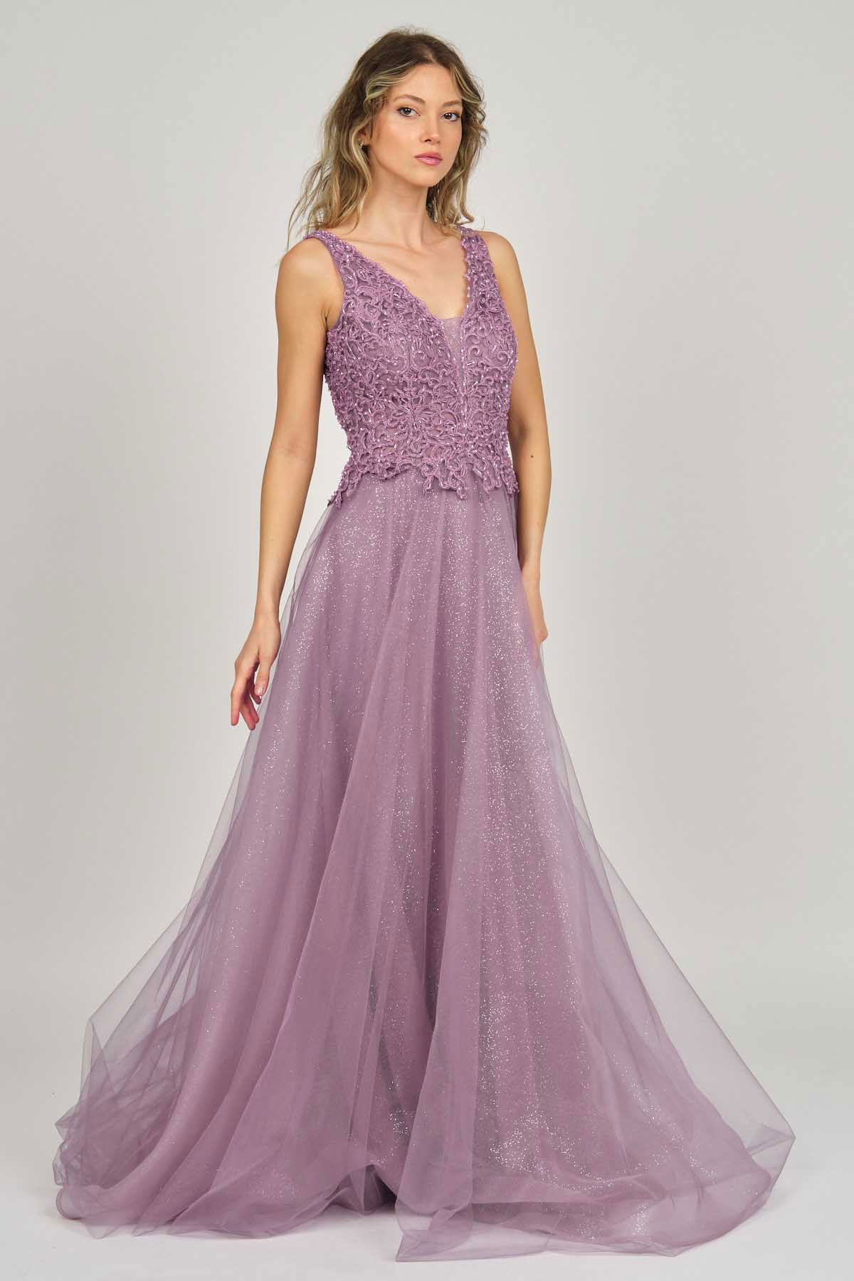 Detay: Uzun, işlemeli, astarlı abiye elbise;