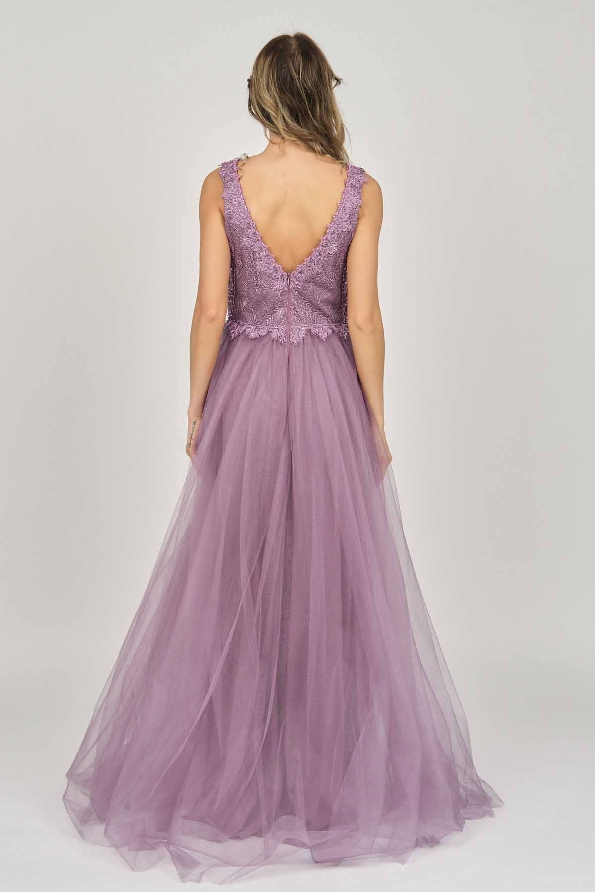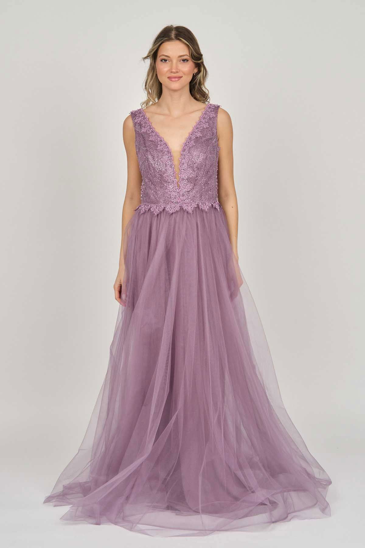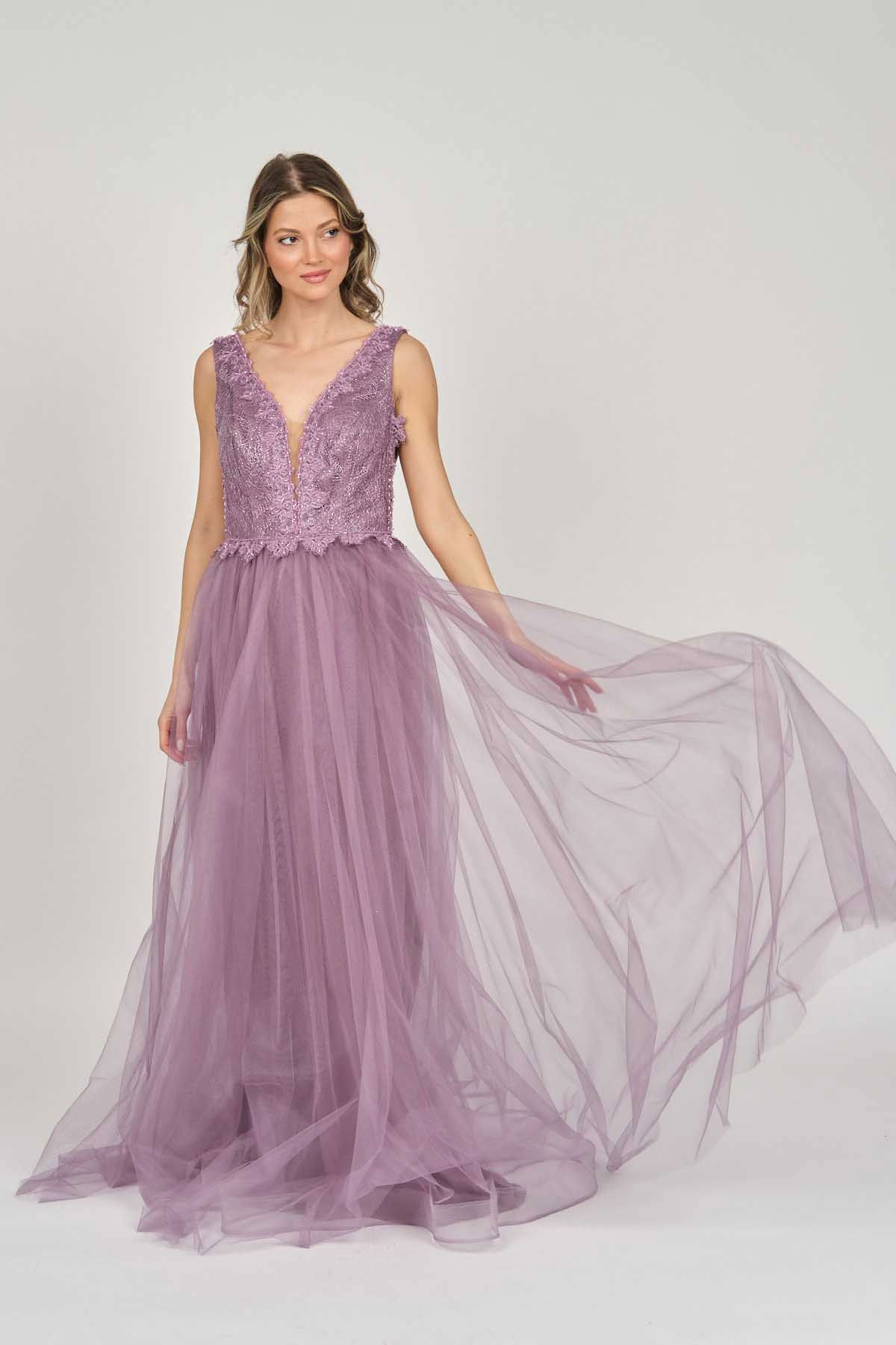 Detay: Ön-arka V yaka, göğüs kısmı tül, uzun, astarlı abiye elbise;