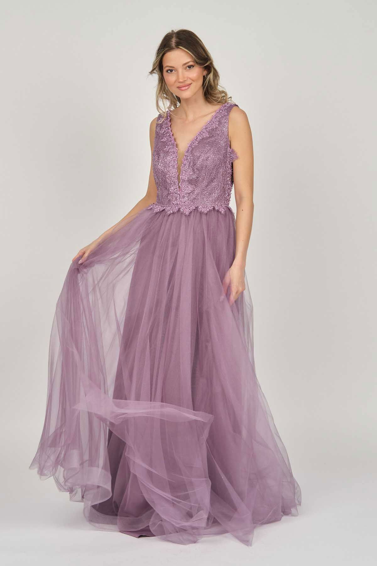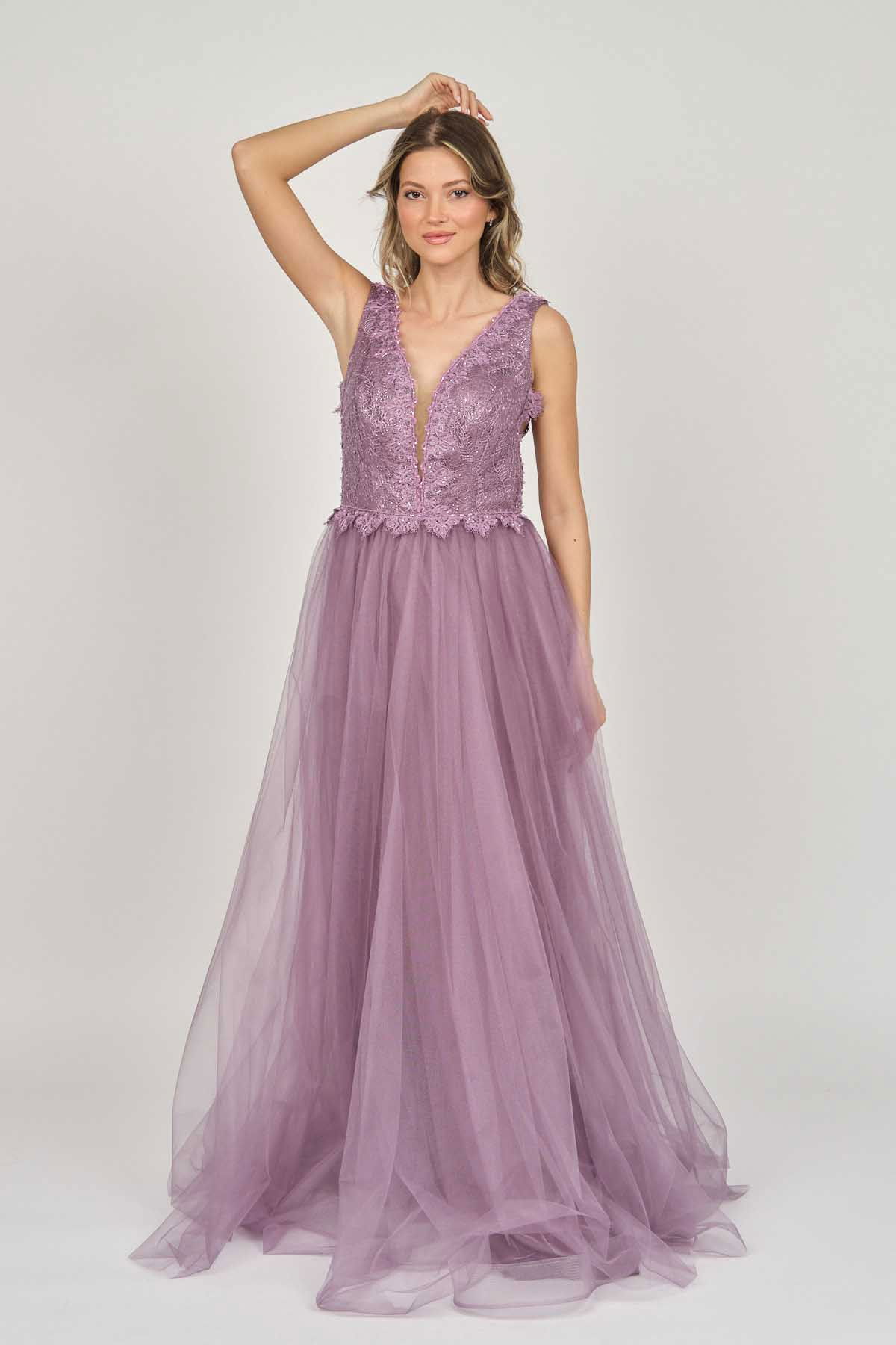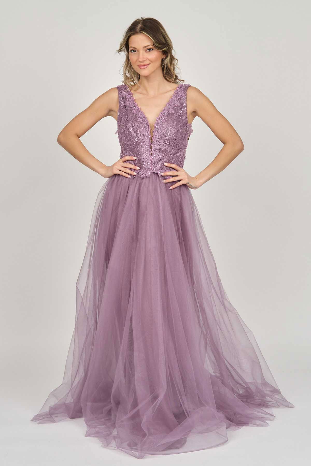 Detay: Ön-arka V yaka, göğüs kısmı tül, uzun, astarlı abiye elbise;