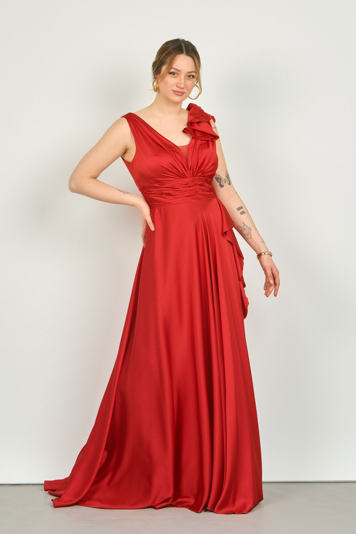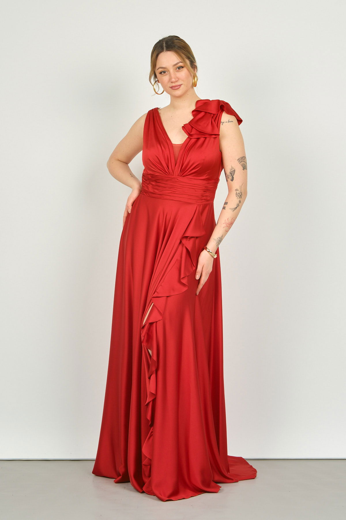 Detay: Askılı, kloş, fırfırlı, yırtmaçlı, astarlı abiye elbise;
