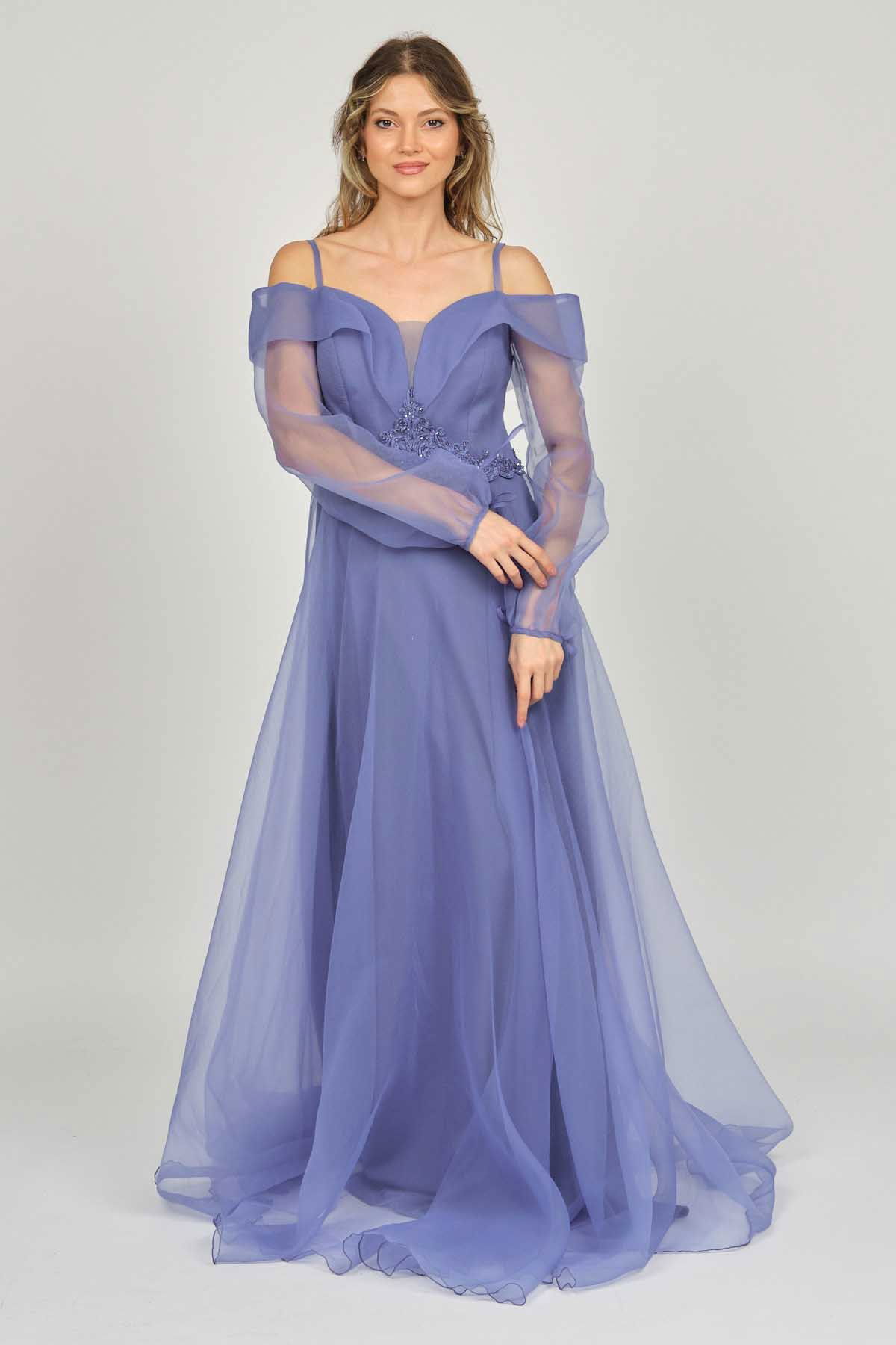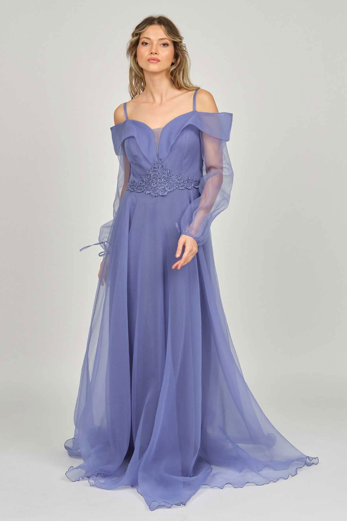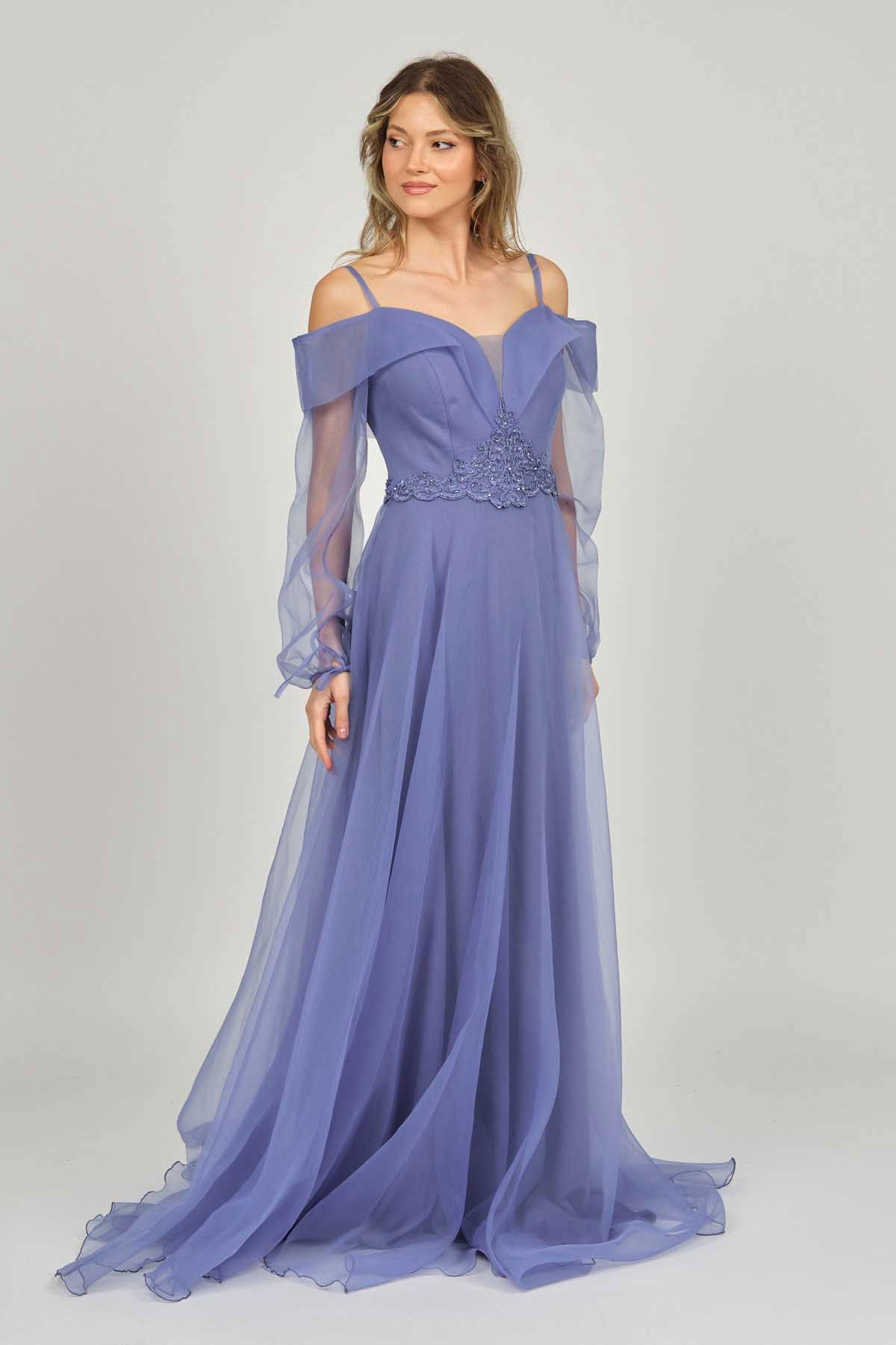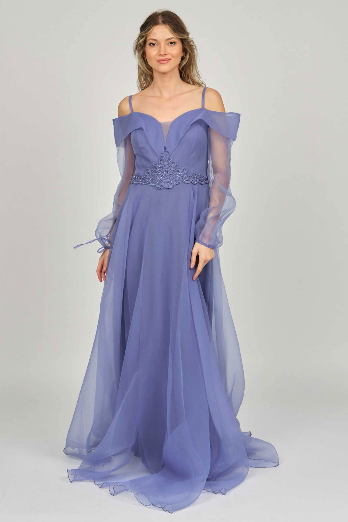 Detay: Uzun, işlemeli, astarlı abiye elbise;