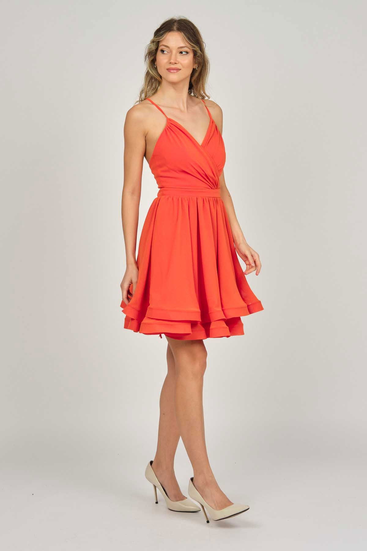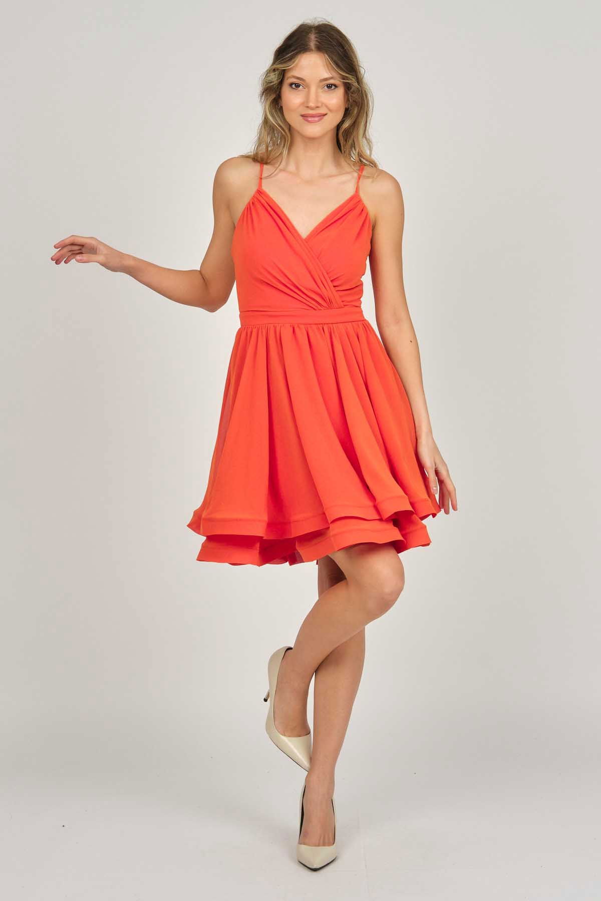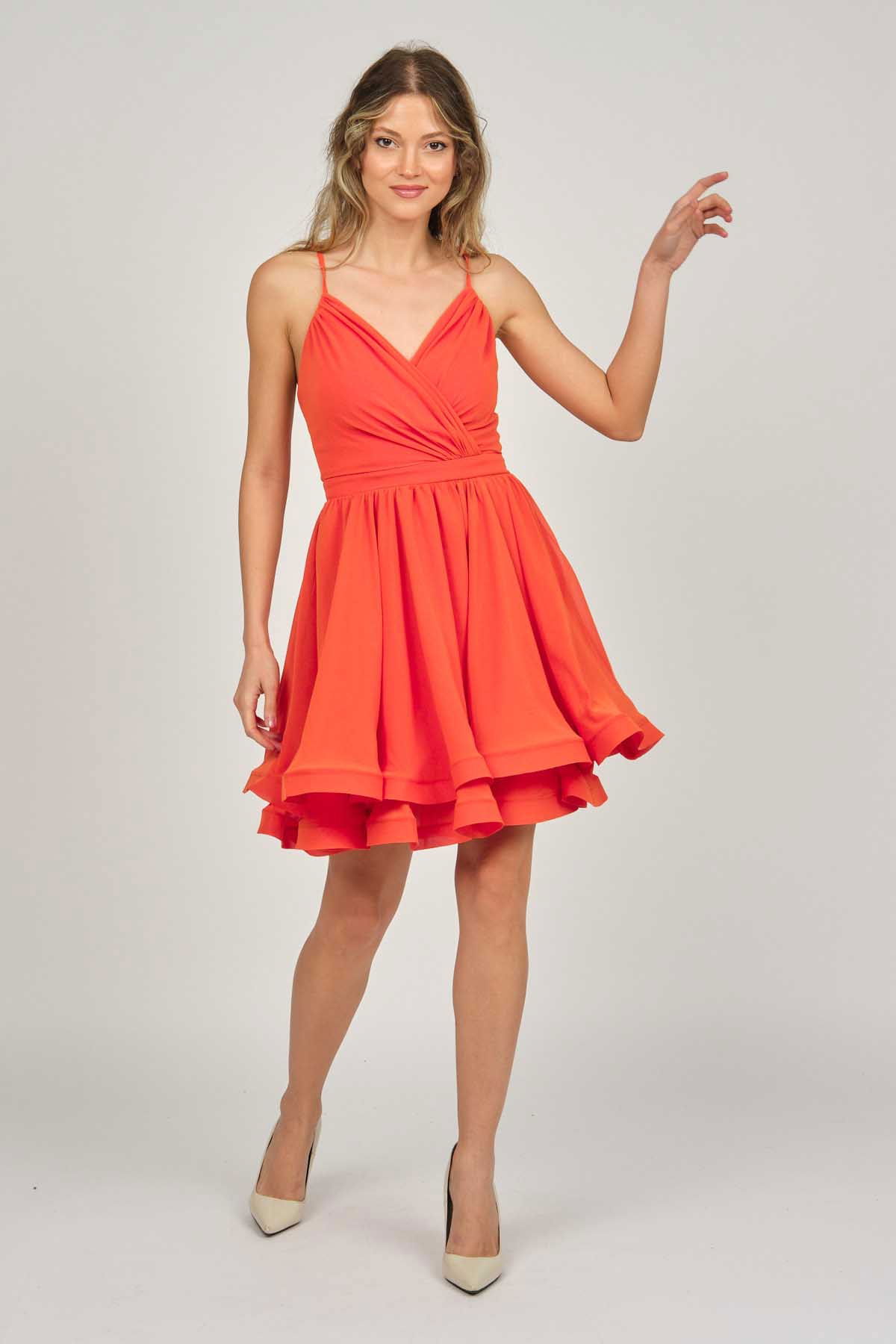 Detay: İp askılı, sırt detaylı, kloş, astarlı abiye elbise;
