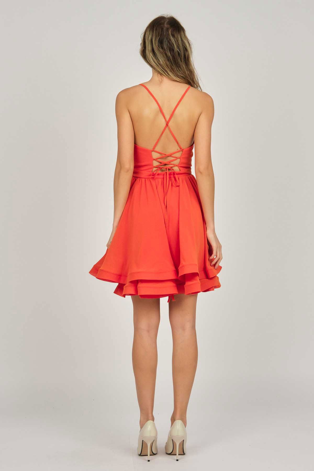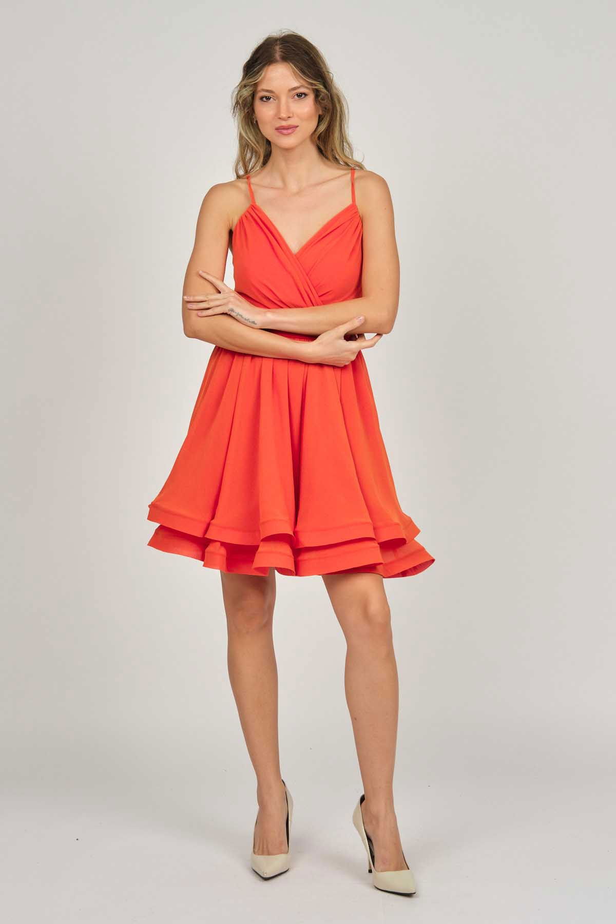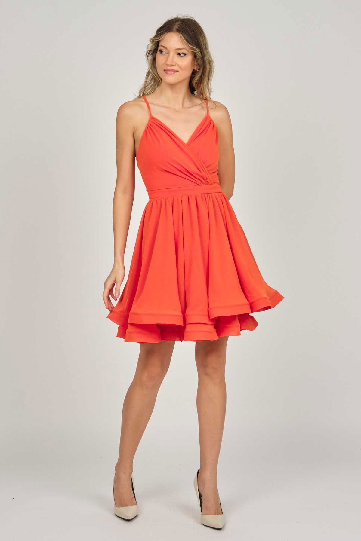 Detay: İp askılı, sırt detaylı, kloş, astarlı abiye elbise;