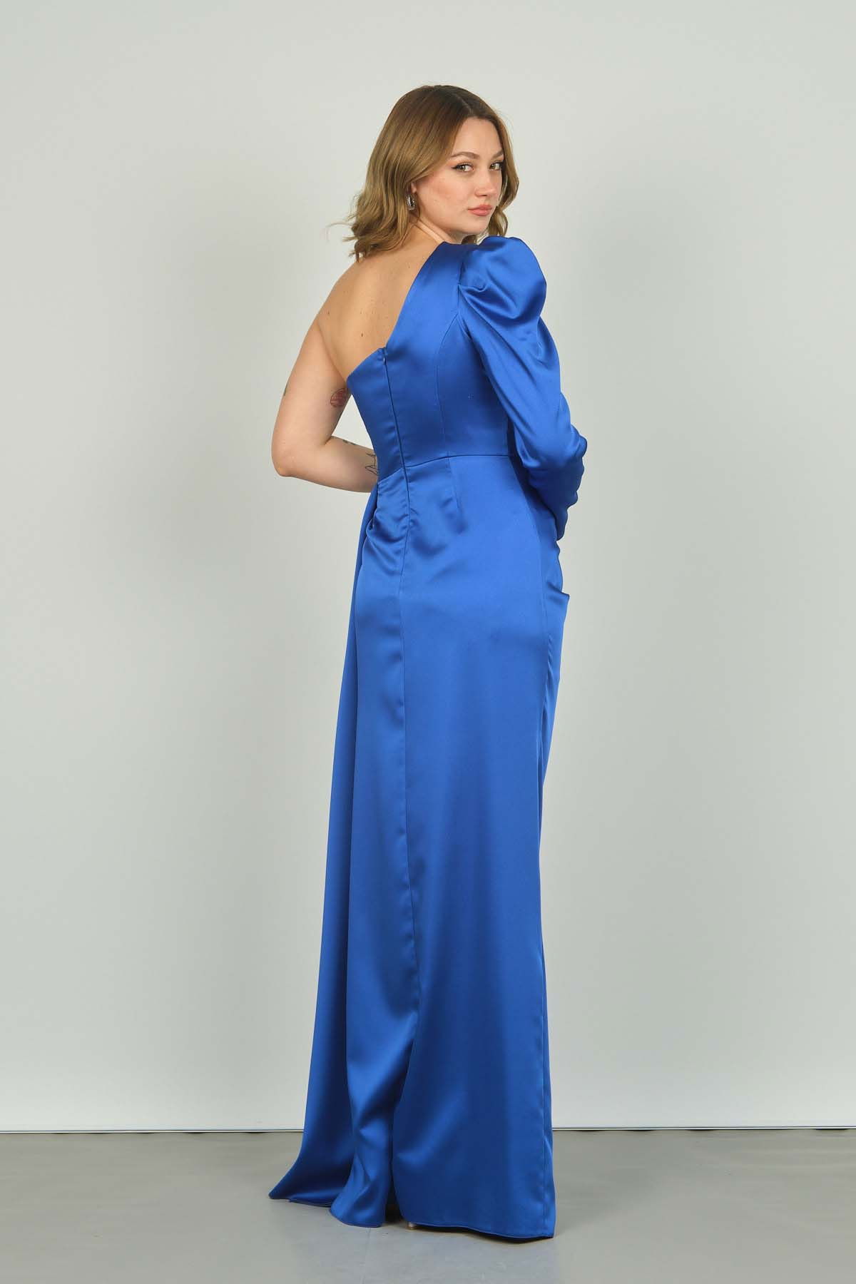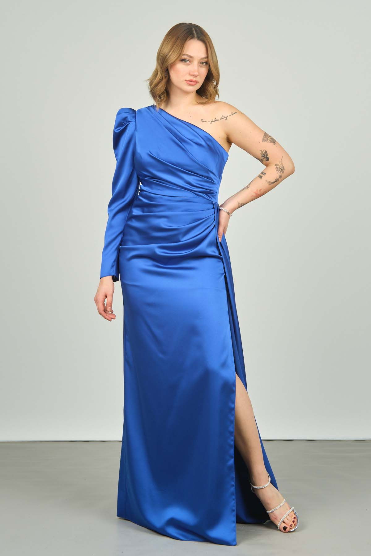 Saygın Kadın Tek Kol ve Omuz Detaylı Kuyruklu Uzun Abiye Elbise 0472 Saks
