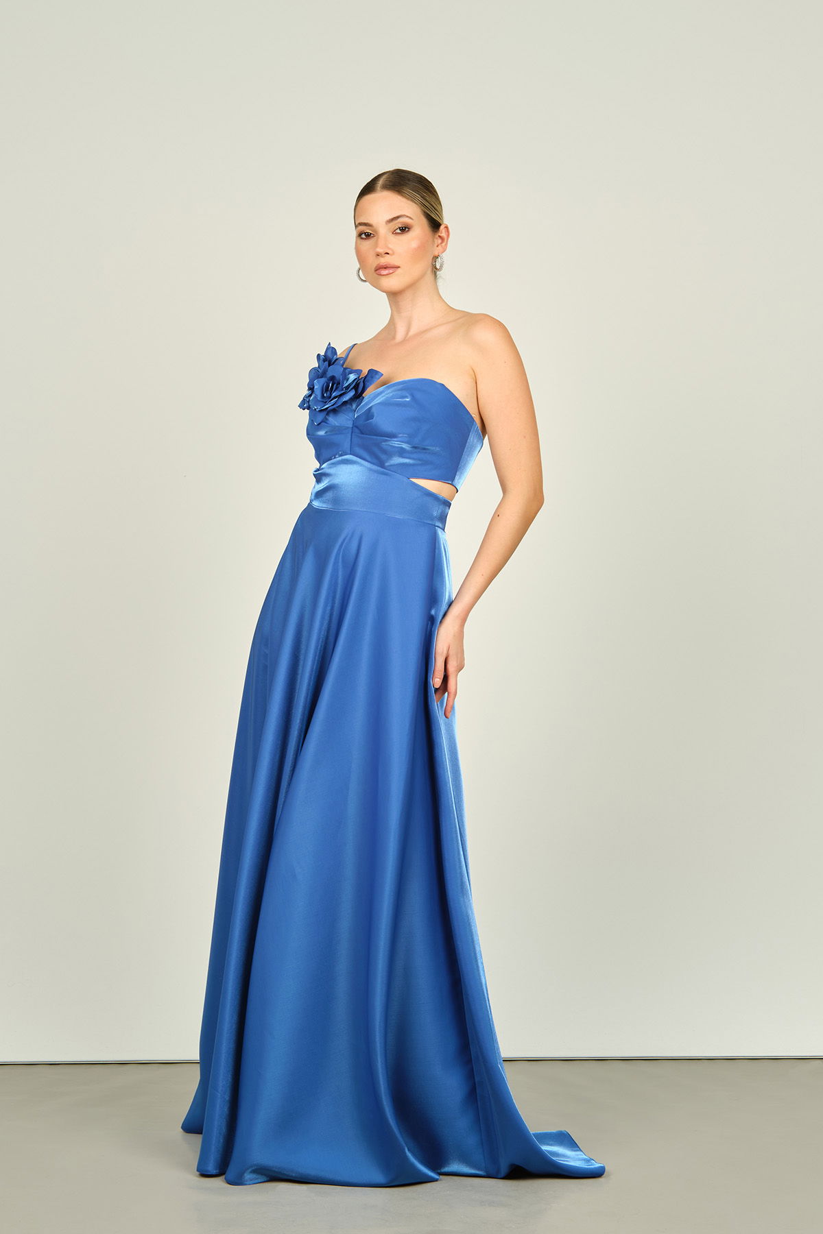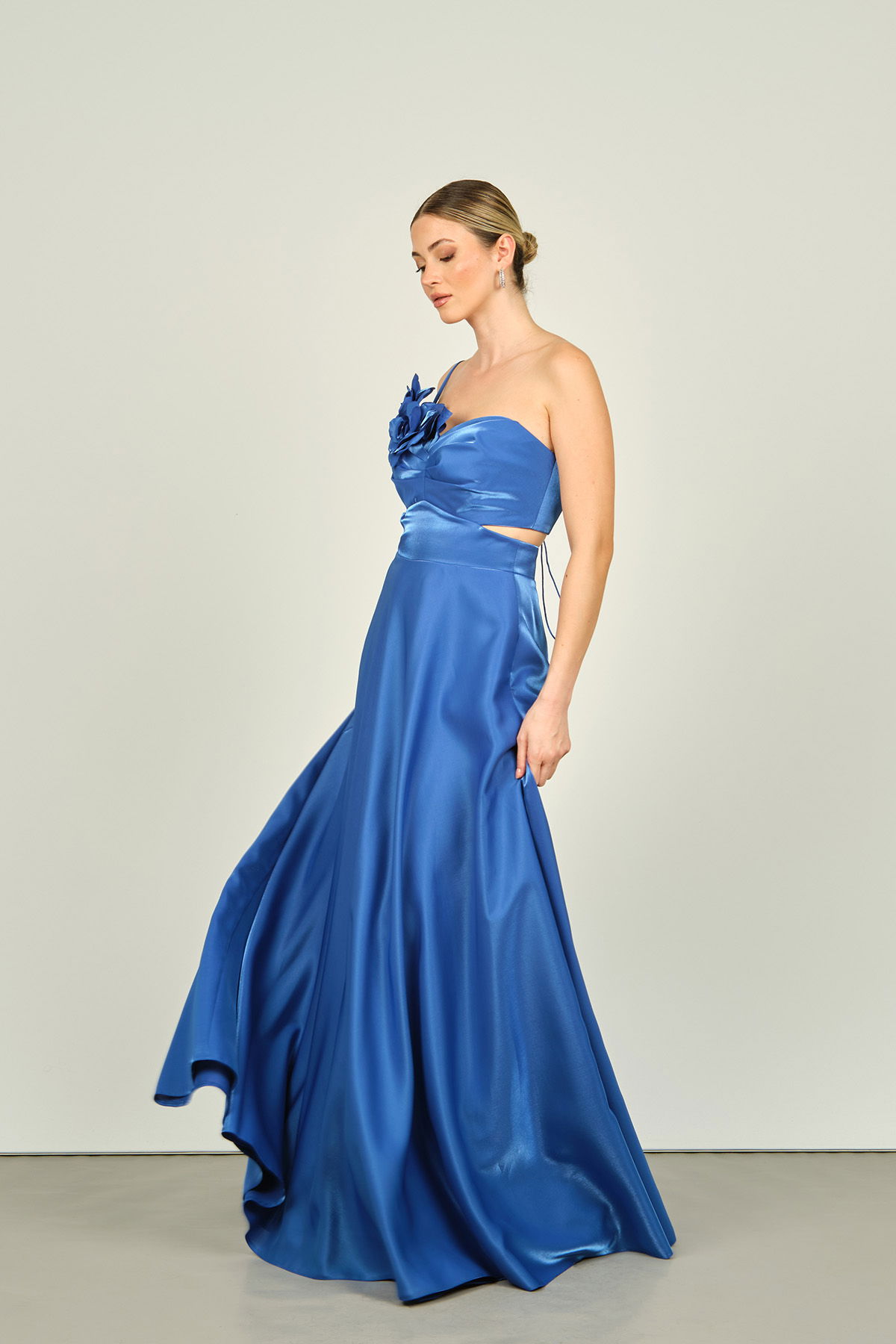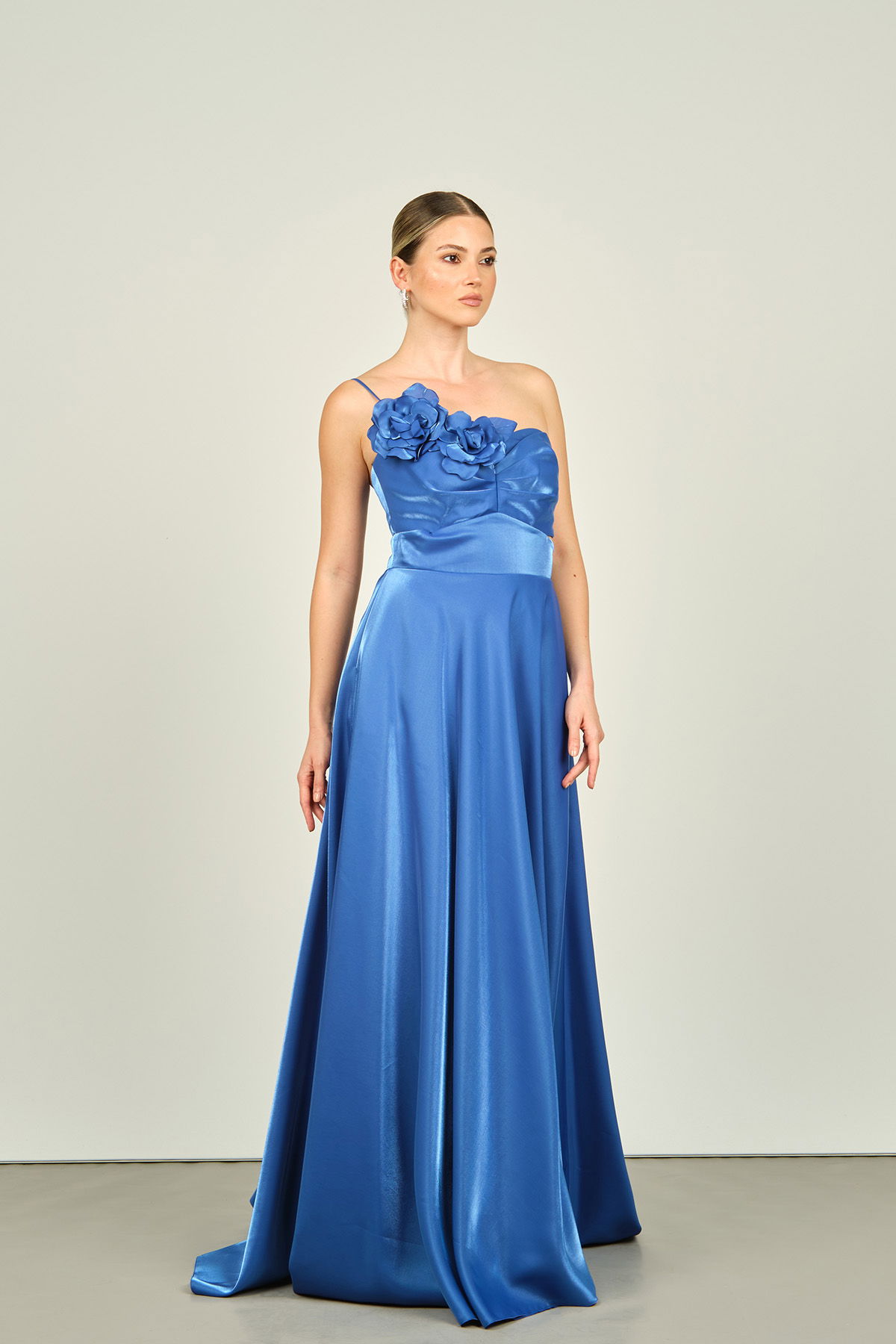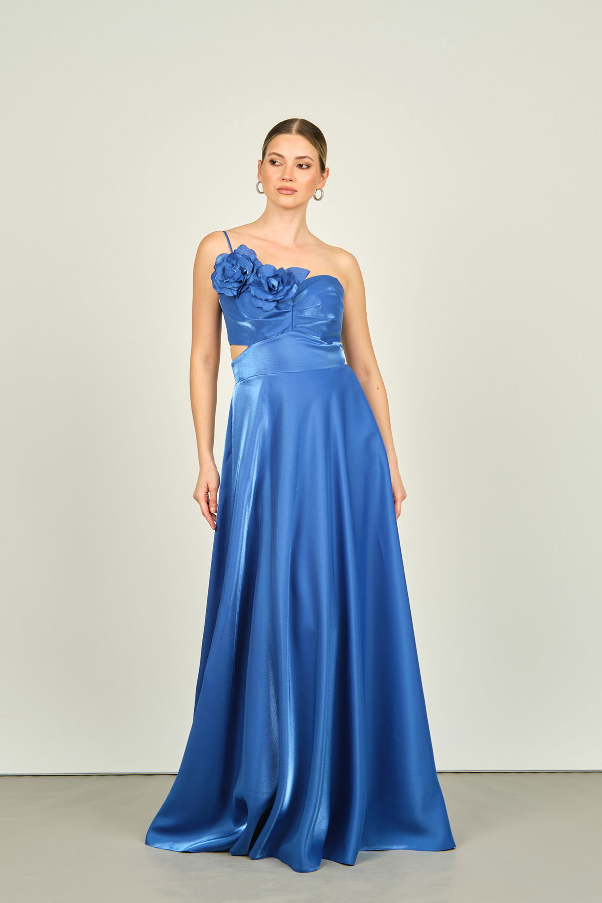Detay: Göğüste çiçek detaylı, sırttan bağlamalı, uzun, astarlı, abiye elbise;