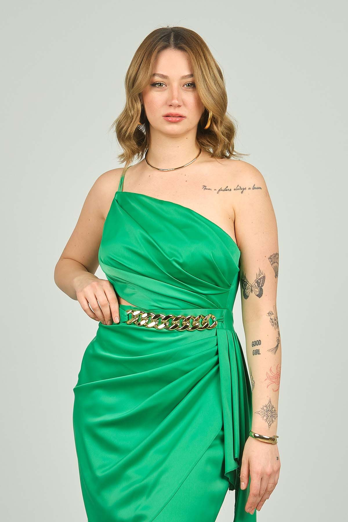 Detay: Tek omuz ip askılı, bel kısmı pencere detaylı, midi boy abiye elbise ;