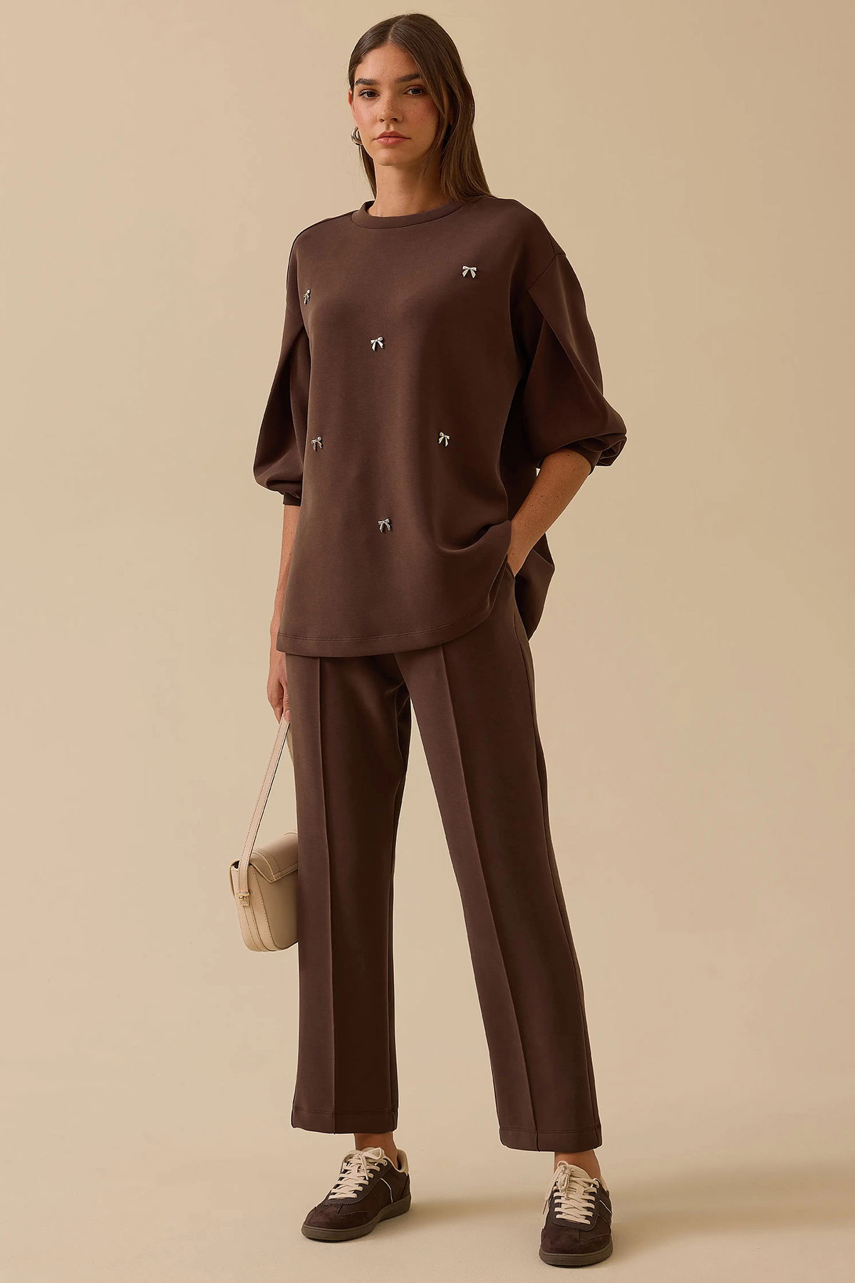 Detay: Sıfır yaka ve düşük omuz detaylarıyla sade bir görünüm sunan uzun kollu sweat, relax kesimiyle günlük stilin konforunu ön plana çıkarıyor. Basen boyundaki düz dokuma örme kumaşı, yumuşak dokusuyla gün boyu rahatlık sağlarken aksesuar detaylarıyla modern bir hava katıyor. Şehir hayatının dinamik temposuna uyum sağlayan bu sweat, minimal tarzı sevenler için ideal bir parça;