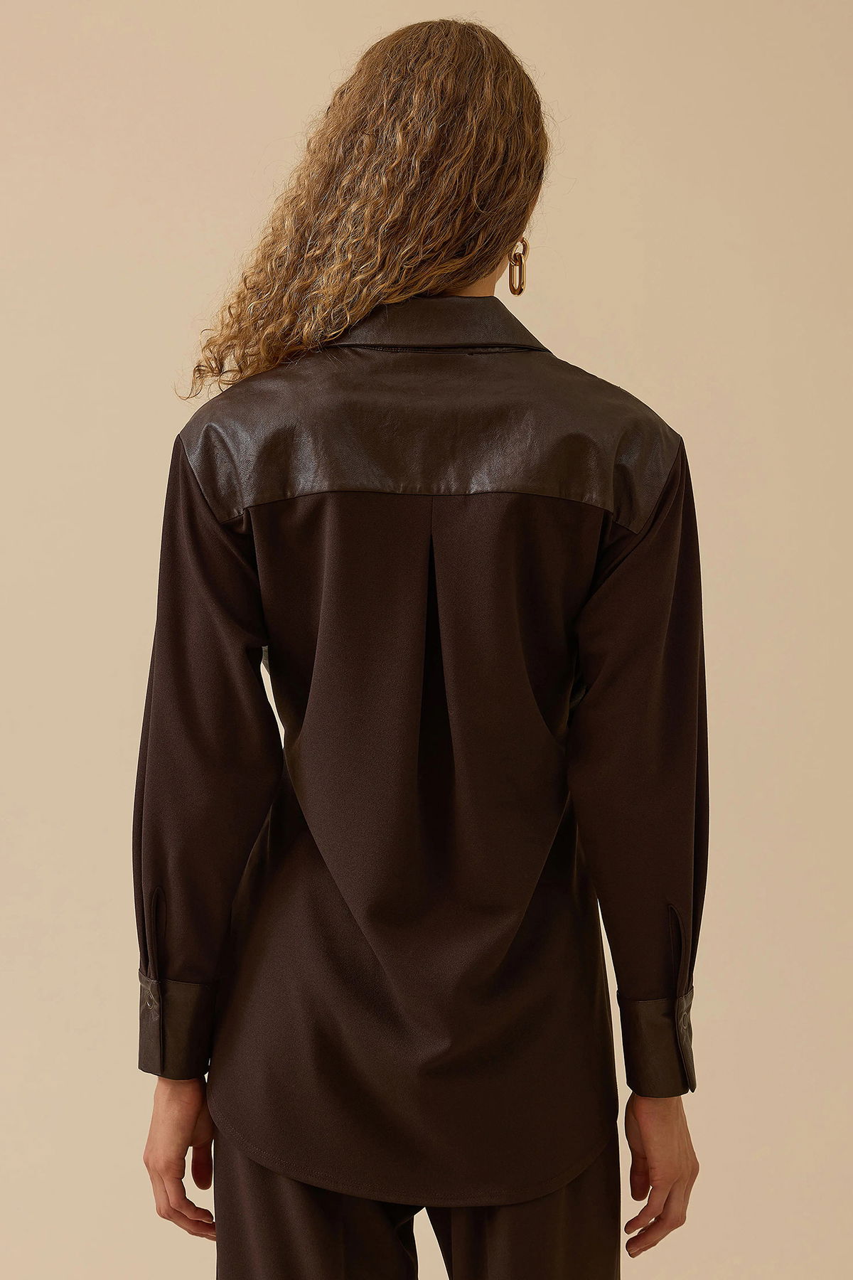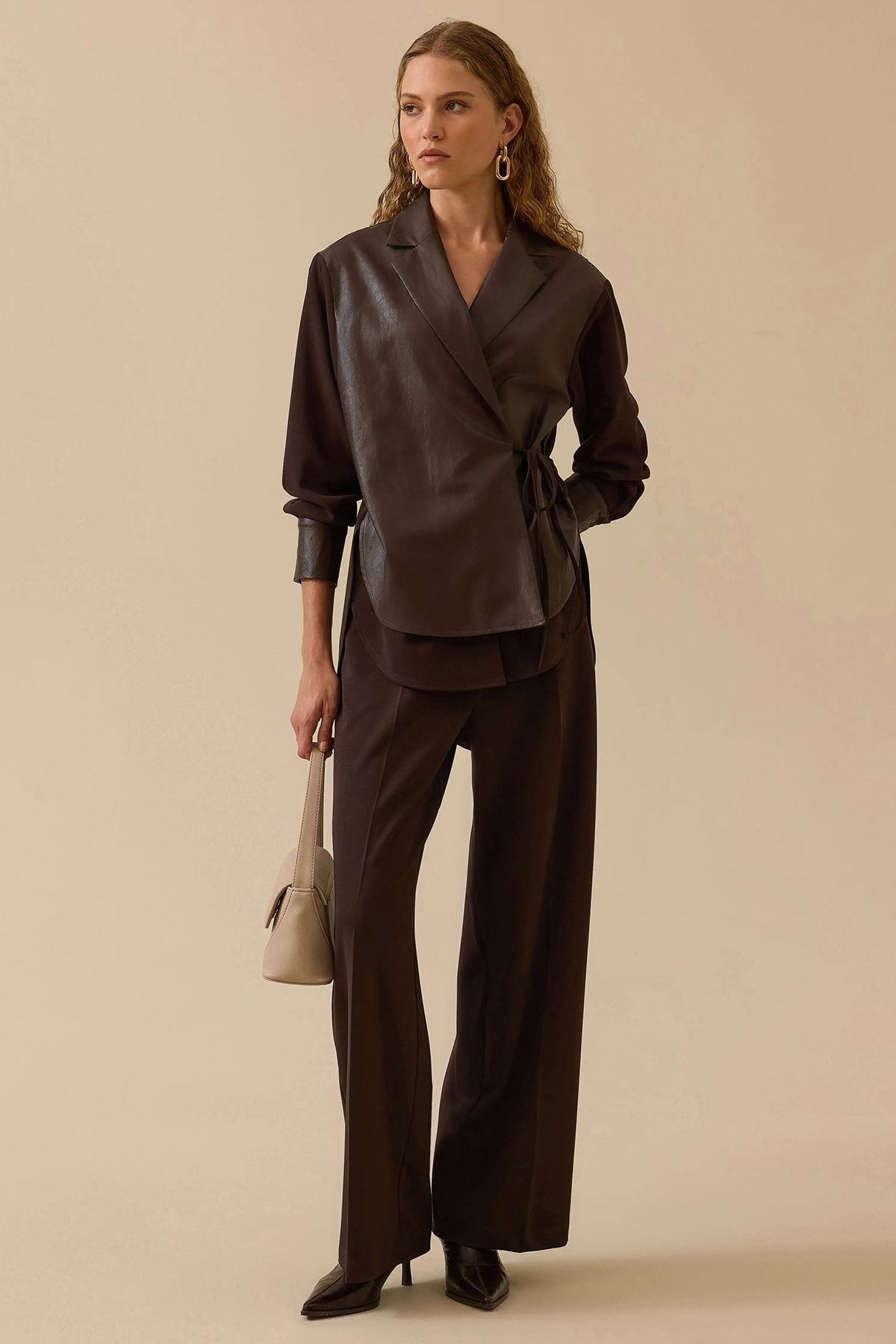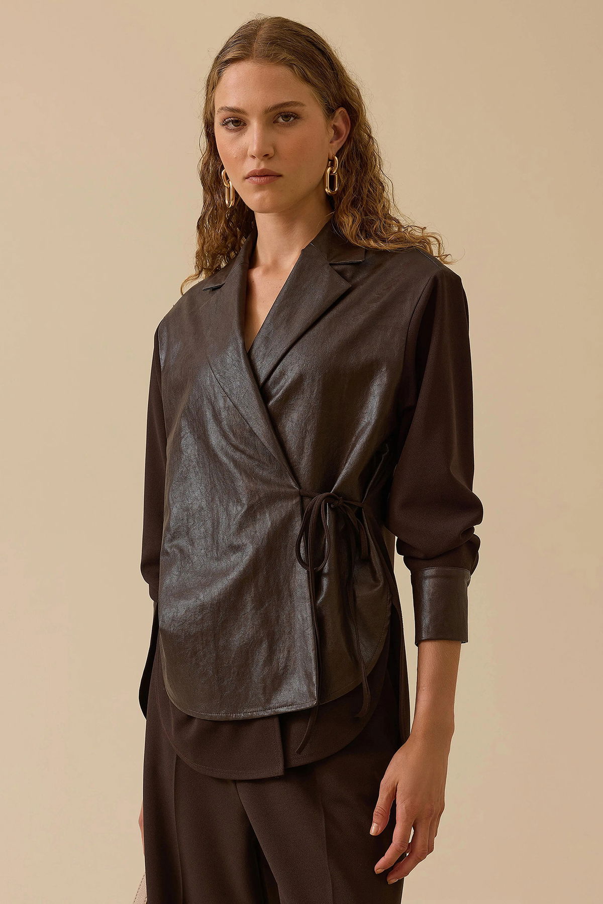 Detay: Kruvaze yaka tasarımıyla sofistike bir görünüm sunan bağlamalı deri gömlek, relax kesimiyle şık tarzı konforla buluşturuyor. Basen boyundaki iki kumaşlı dokuma yapısı, modern ve güçlü bir siluet oluştururken uzun takma kol detayıyla zarif bir duruş sergiliyor. Bağlamalı kapama şekliyle stilinizi özgünleştiren bu gömlek, şehir şıklığının iddialı parçalarından biri oluyor;
