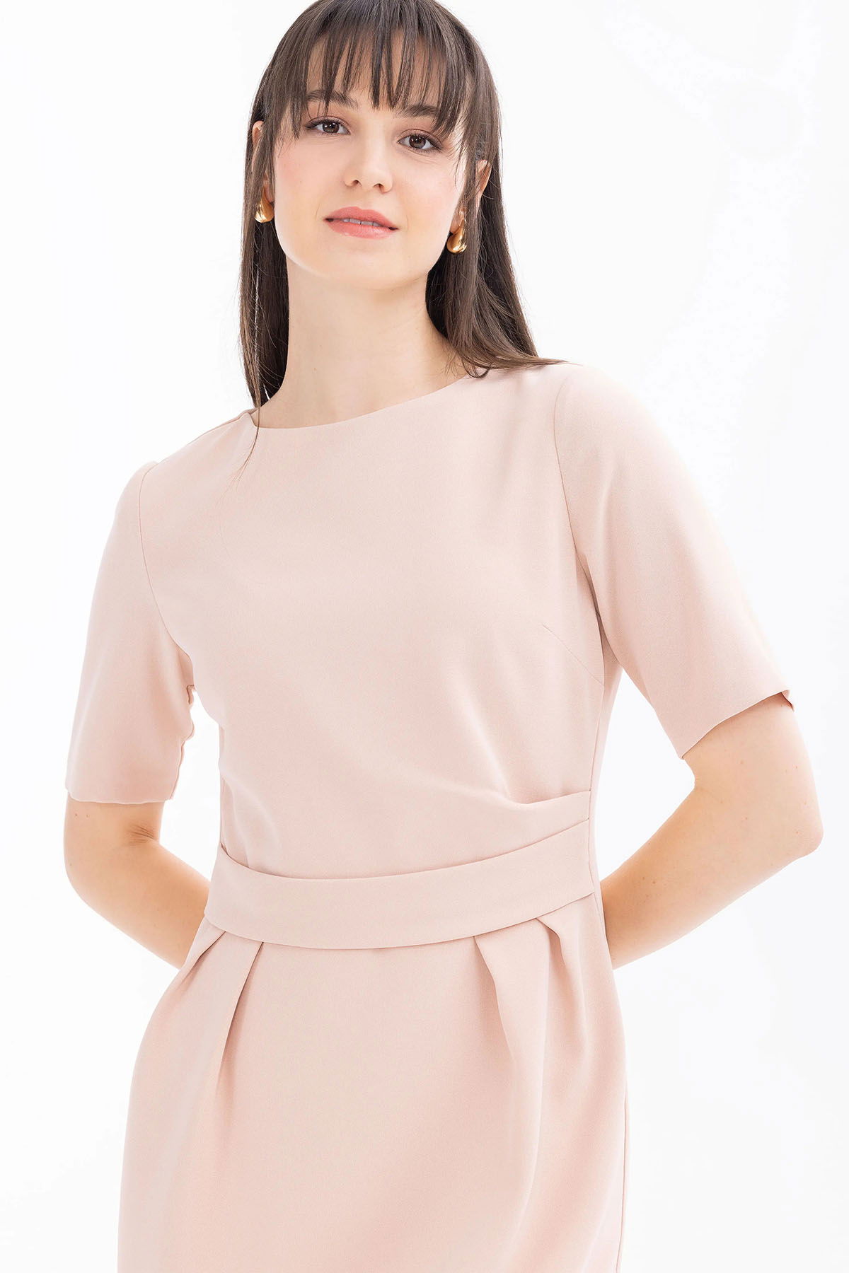 Detay: Diz üstü, yuvarlak yaka, günlük şık elbise;