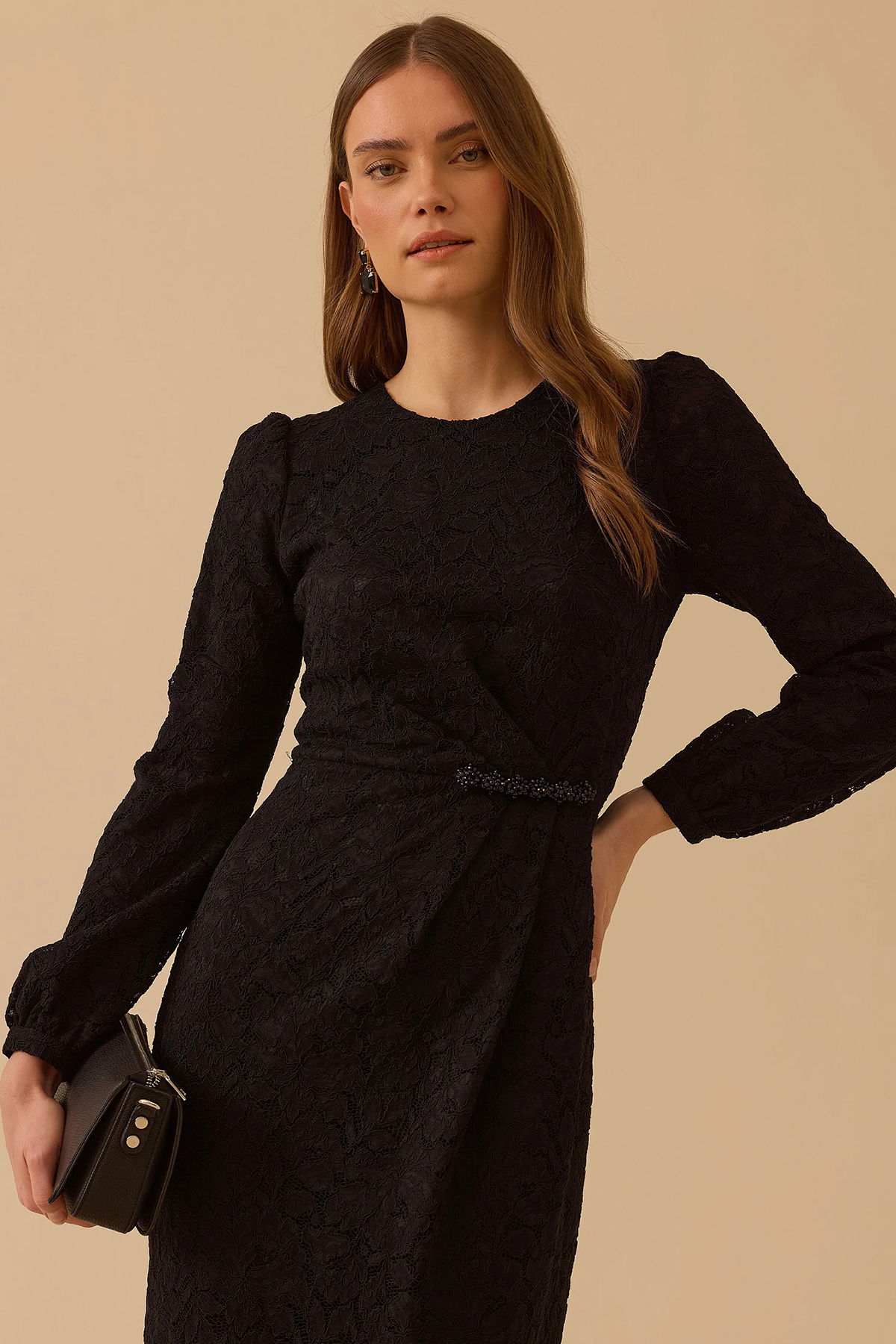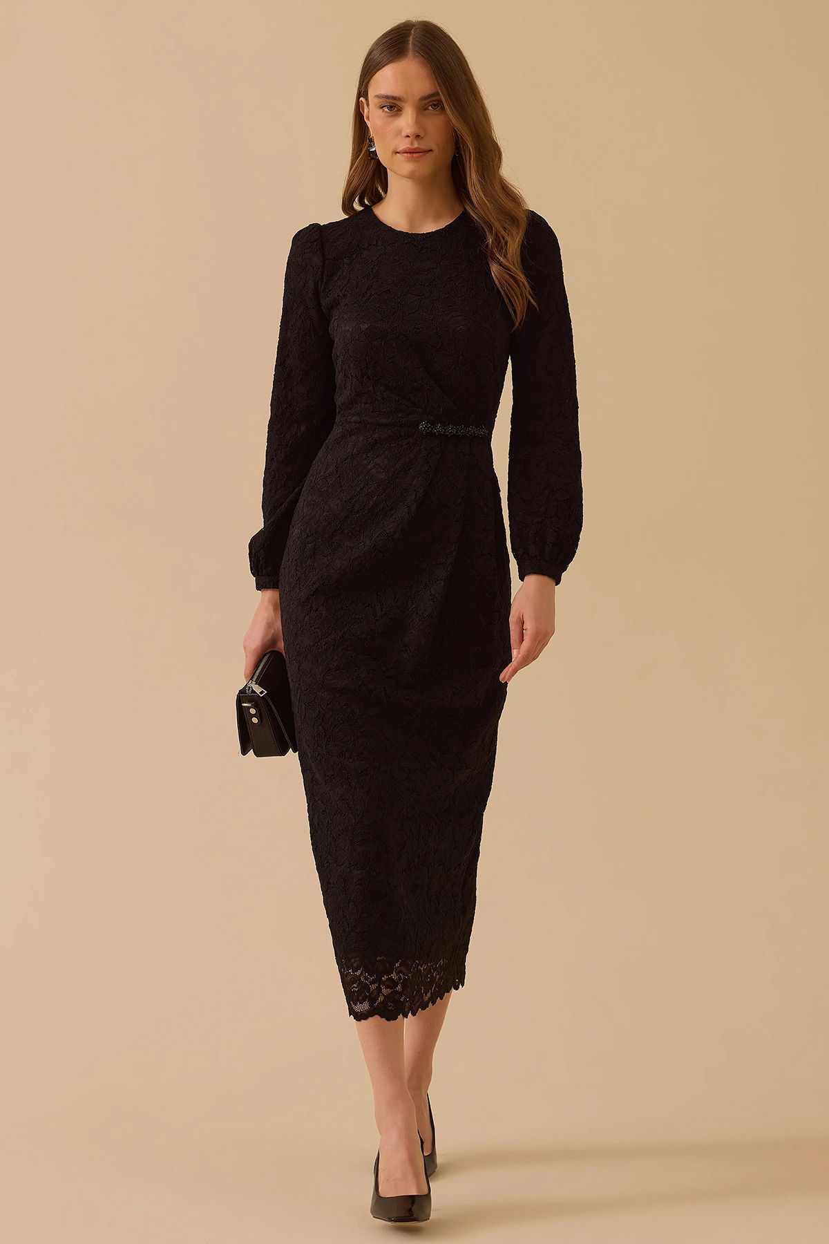 Detay: Dantel dokuma kumaştan üretilen bu elbise, regular kesimi ve maksi boyuyla zarif bir siluet sunuyor. Yuvarlak yaka tasarımı sade bir şıklık katarken, uzun takma kollar feminen bir görünüm sağlıyor. Normal bel formu rahat bir kullanım sunarken, çiçek desenli kumaş romantik bir hava kazandırıyor. Bu özellikleriyle hem gündüz hem de özel davetlerde şıklığınızı tamamlayan ideal bir parça oluyor;