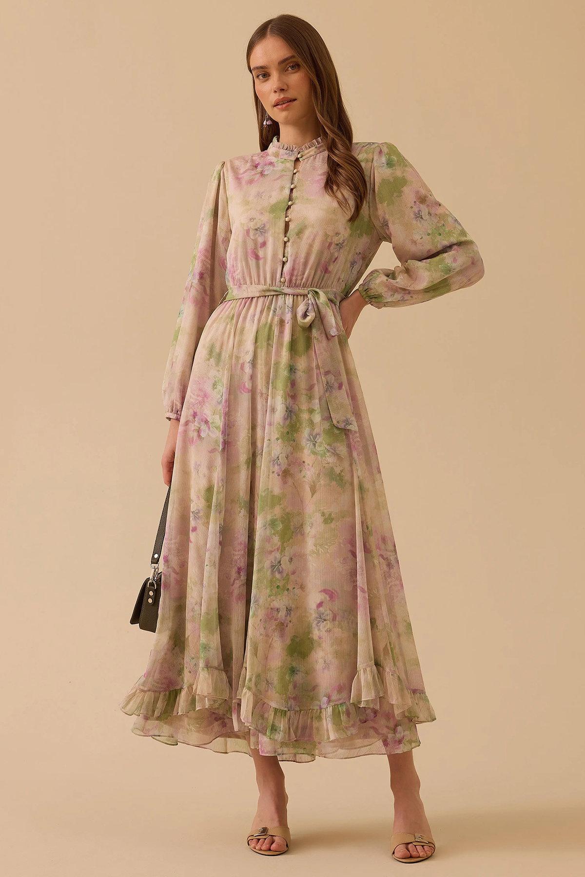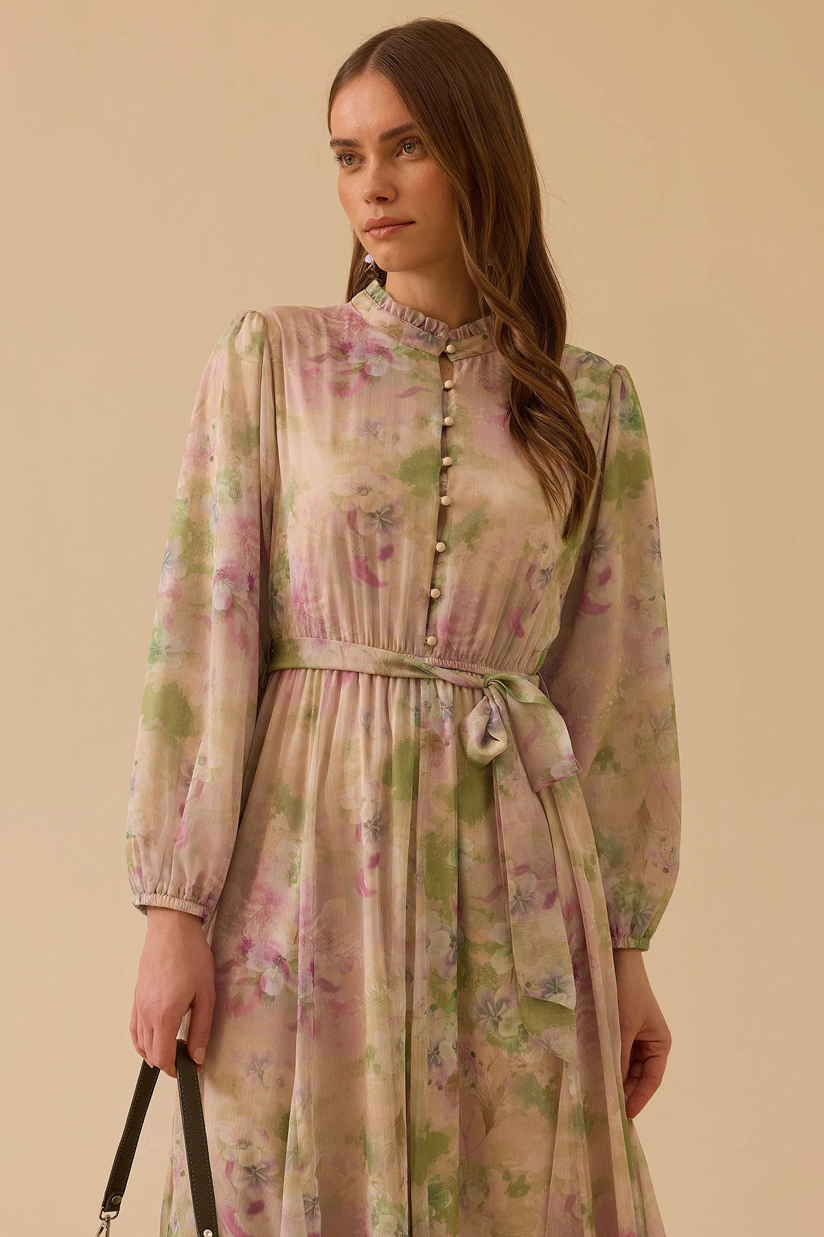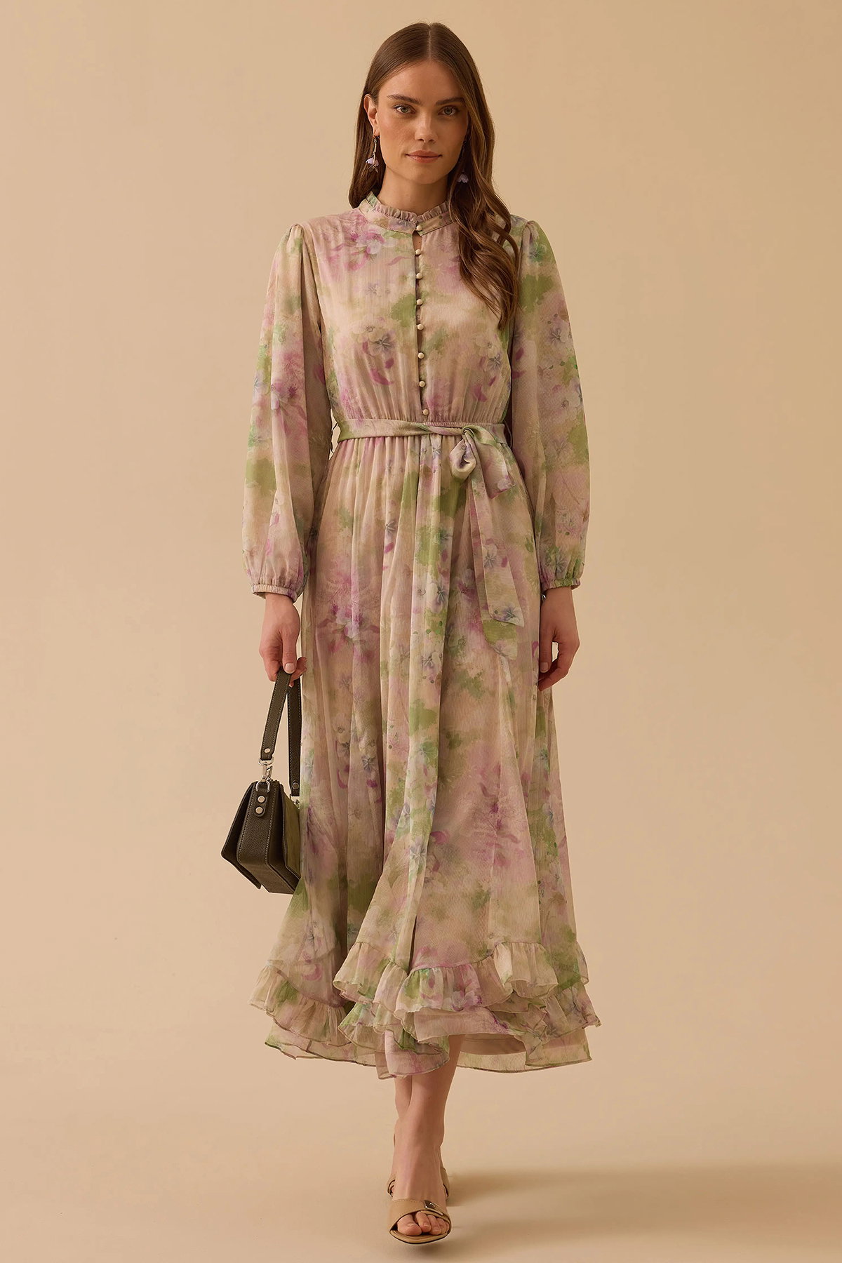 Detay: Bu elbise modeli, şifon dokuma kumaş yapısıyla hafif ve zarif bir görünüm sunarken çiçek desenleriyle romantik bir hava kazandırır. A kesim formu uzun boy tasarımıyla akıcı bir siluet oluşturur. Hakim yaka detayı sofistike bir duruş sağlarken, balon kol tasarımı feminen bir şıklık katar. Uzun kol formu mevsim geçişlerinde ideal olurken, beli lastikli yapısı konfor ve esneklik sunar. Düğme aksesuarları klasik bir detay eklerken, fırfır tasarımı hareketli bir görünüm kazandırır. Astarlı yapısı konforu artırırken, kuşaklı kapama bel hattını vurgulayarak zarif bir görünüm sağlar. Günlük kullanımda olduğu kadar özel davetlerde de şık bir seçenek olarak öne çıkan, romantik ve stil sahibi bir parçadır;