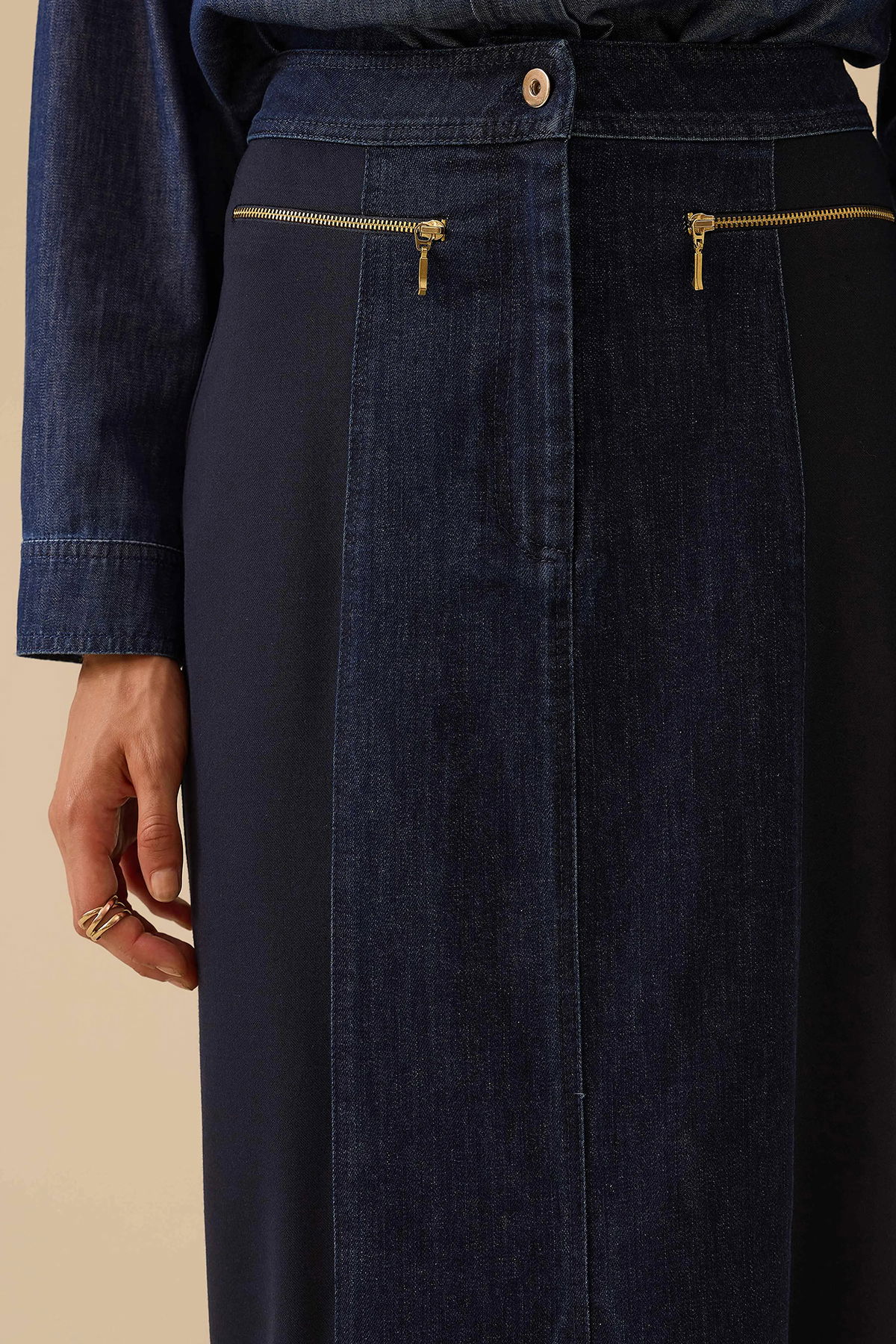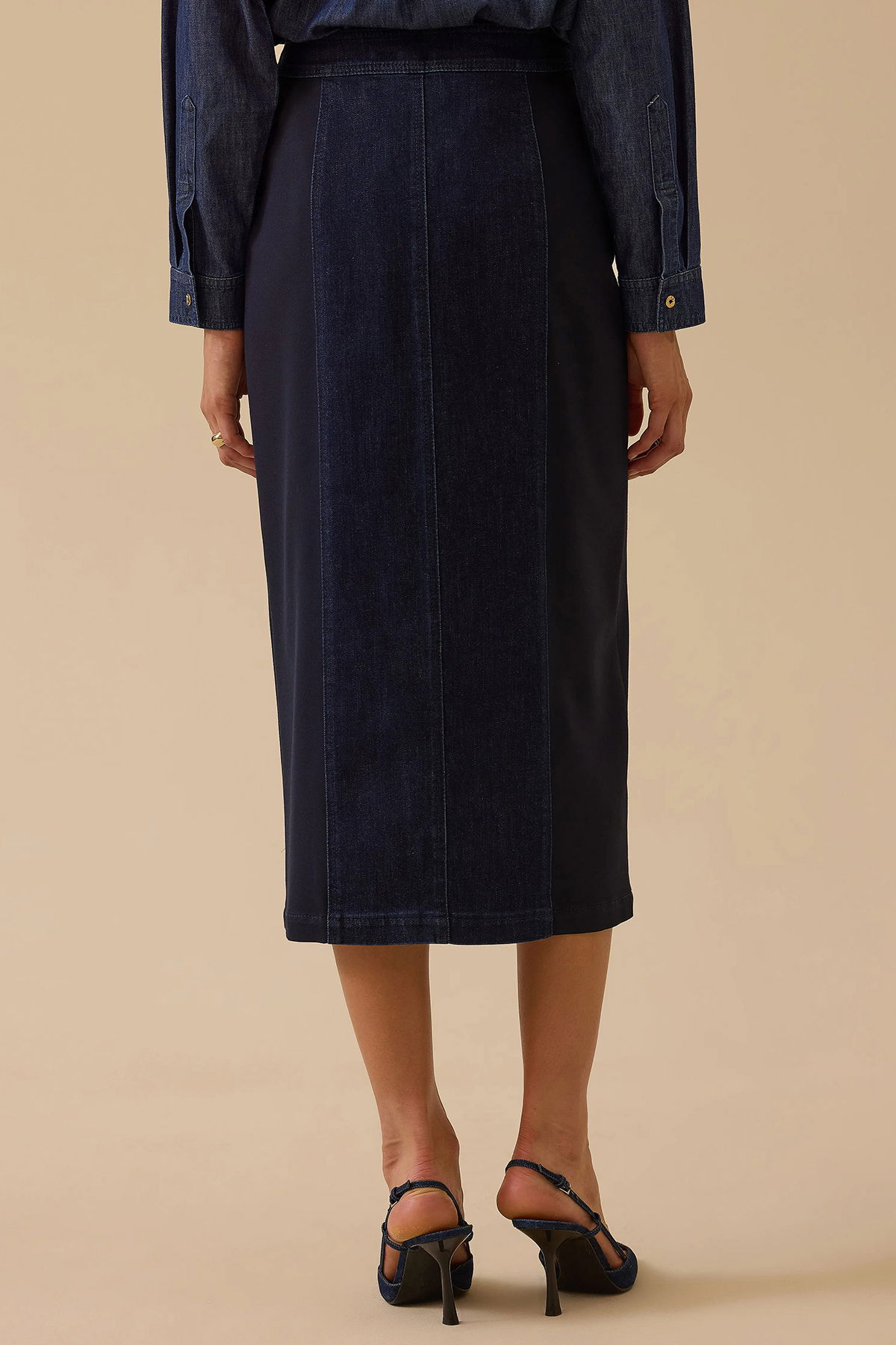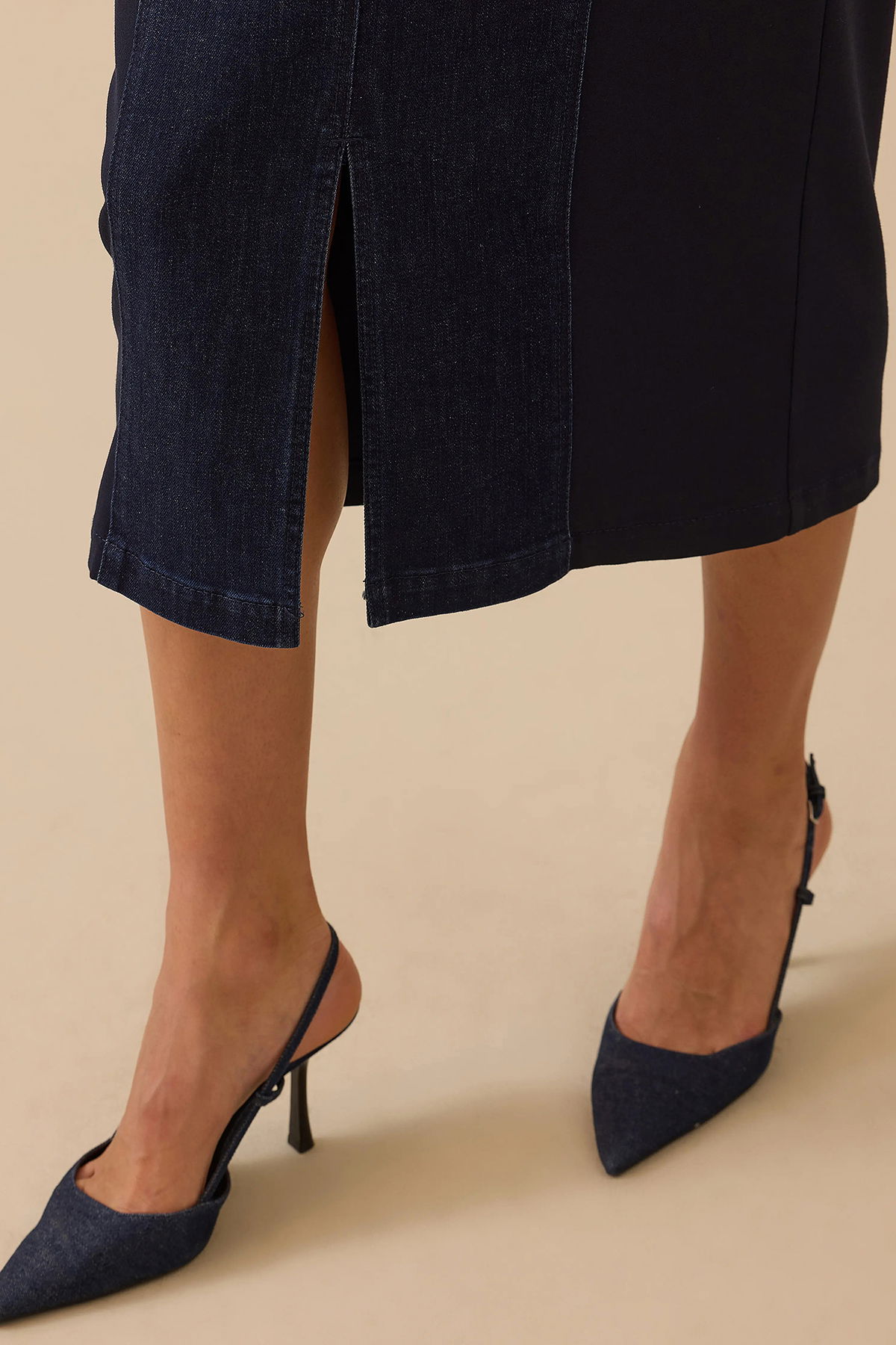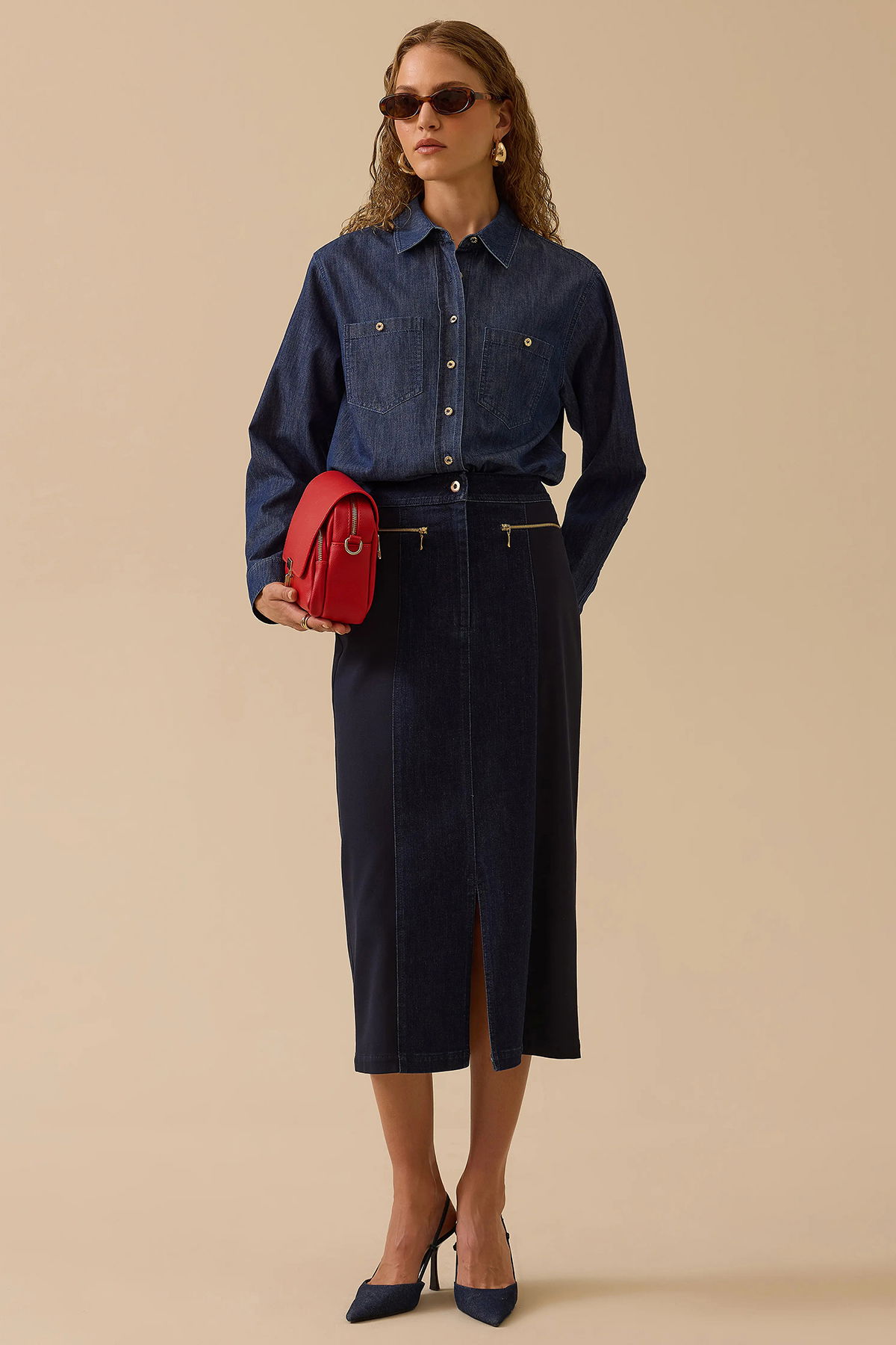 Detay: Bele oturan kalem kesimiyle vücut hatlarını zarifçe vurgulayan diz altı boy düğmeli etek, şık tarzıyla modern şehir stiline güçlü bir dokunuş katıyor. İki kumaşlı dokuma denim yapısı, klasik görünümü yenilikçi detaylarla buluştururken astarsız tasarımı sayesinde hafif ve rahat bir kullanım sunar. Düğme kapama şekliyle hem fonksiyonel hem de stil sahibi bir görünüm elde edilir;