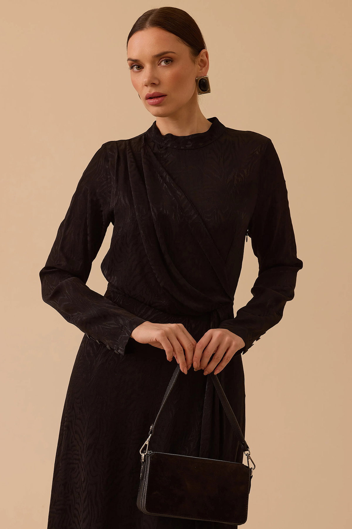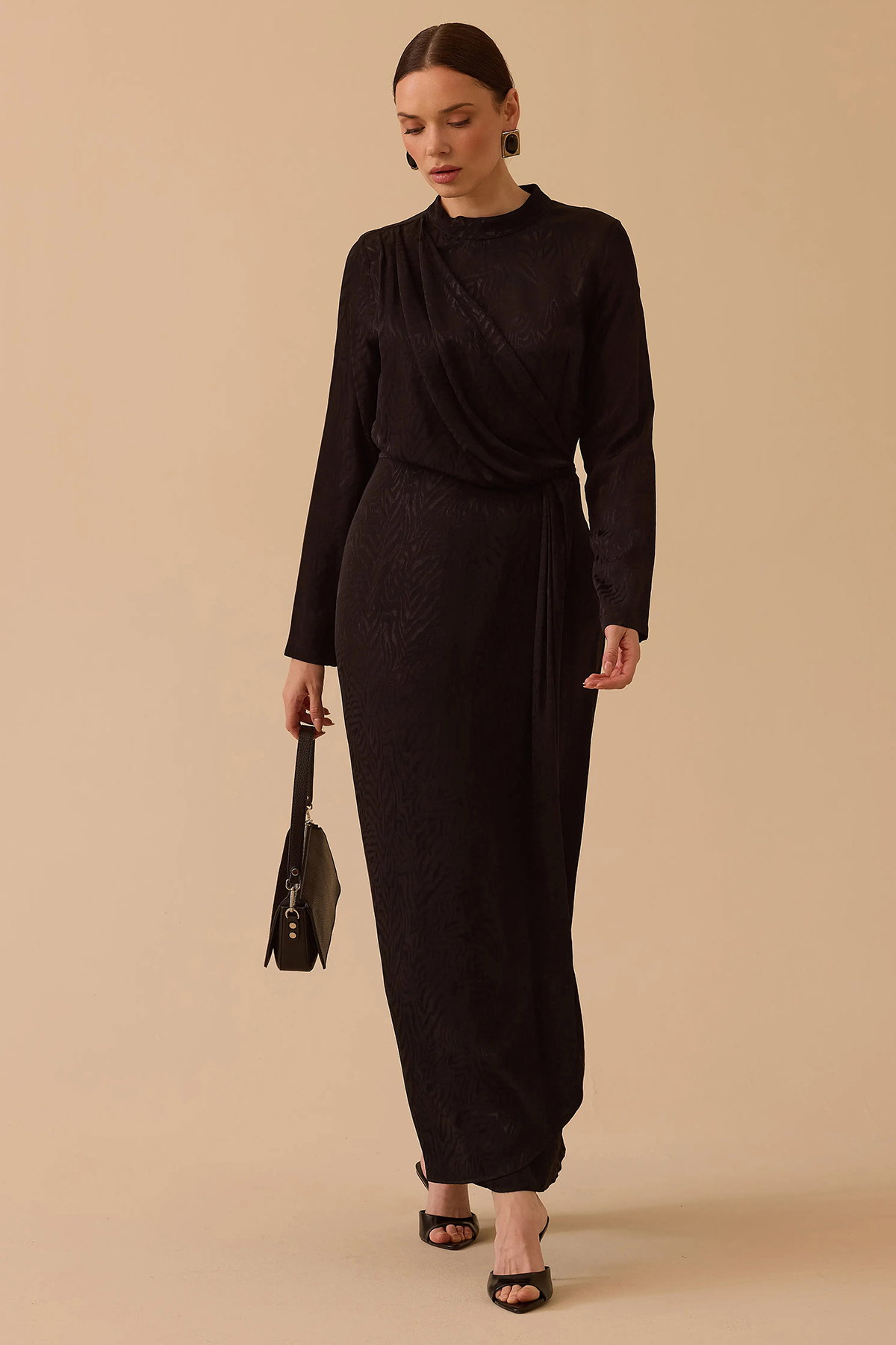 Detay: Polyester dokuma kumaştan üretilen bu elbise, A kesim formu ve maksi boyuyla zarif bir siluet sunuyor. Gömlek yaka tasarımı klasik bir şıklık katarken, uzun takma kollar feminen bir görünüm sağlıyor. Bele oturan formu vücut hatlarını zarifçe vurgularken, düz kumaş özelliği sade bir duruş sergiliyor. Bu özellikleriyle hem günlük hem de özel davetlerde şıklığınızı tamamlayan ideal bir parça oluyor;