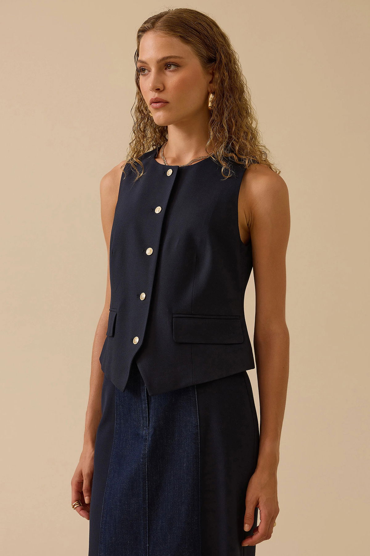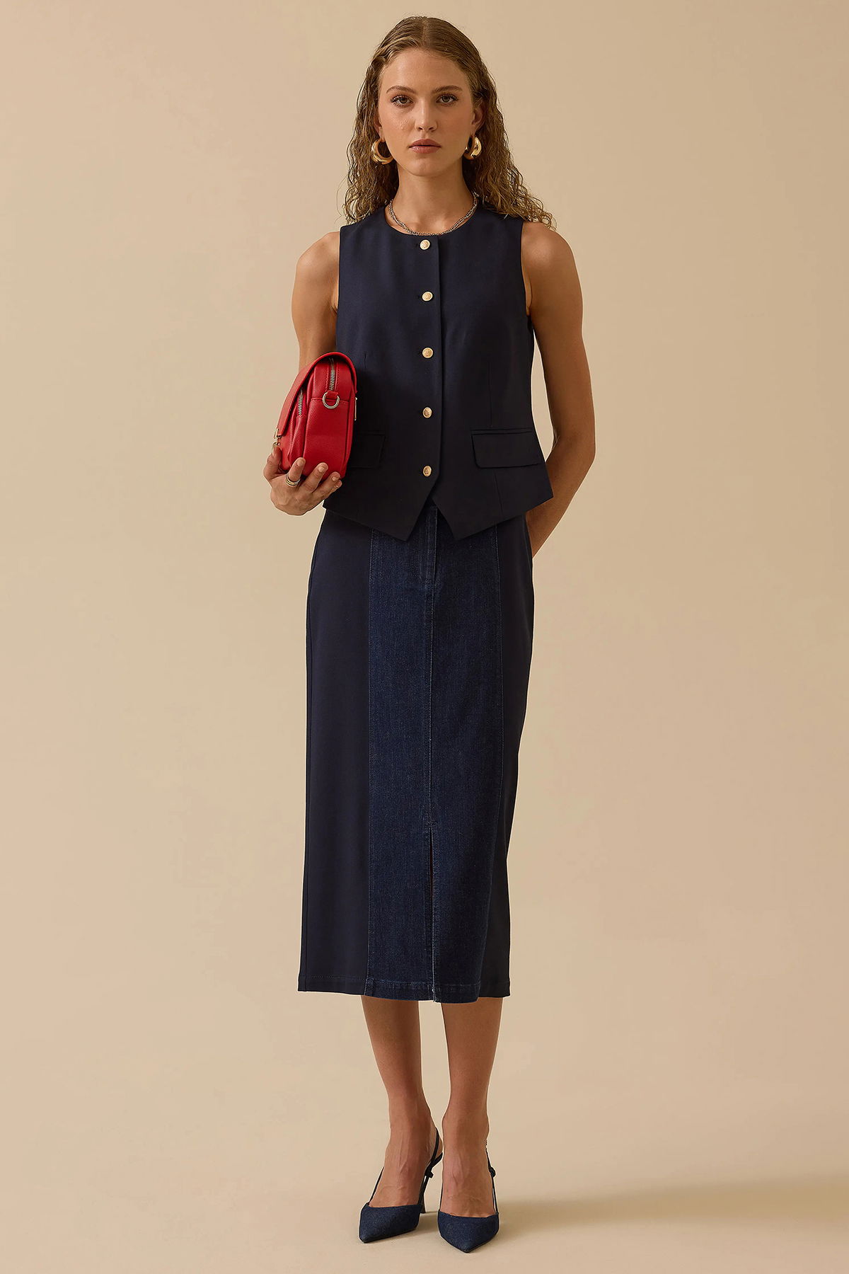 Detay: V yaka tasarımıyla zarif bir görünüm sunan kolsuz düğmeli yelek, düz dokuma polyester kumaşı sayesinde hem şık hem de dayanıklıdır. Regular kesimi ve normal bel yapısıyla vücuda rahatça oturur, bel hizasında biten boyu ile klasik kombinlere modern bir dokunuş katar. Dokuma tipi kumaşı ve sade yapısıyla ofis stilinden günlük şıklığa kadar geniş bir kullanım alanı sağlar;