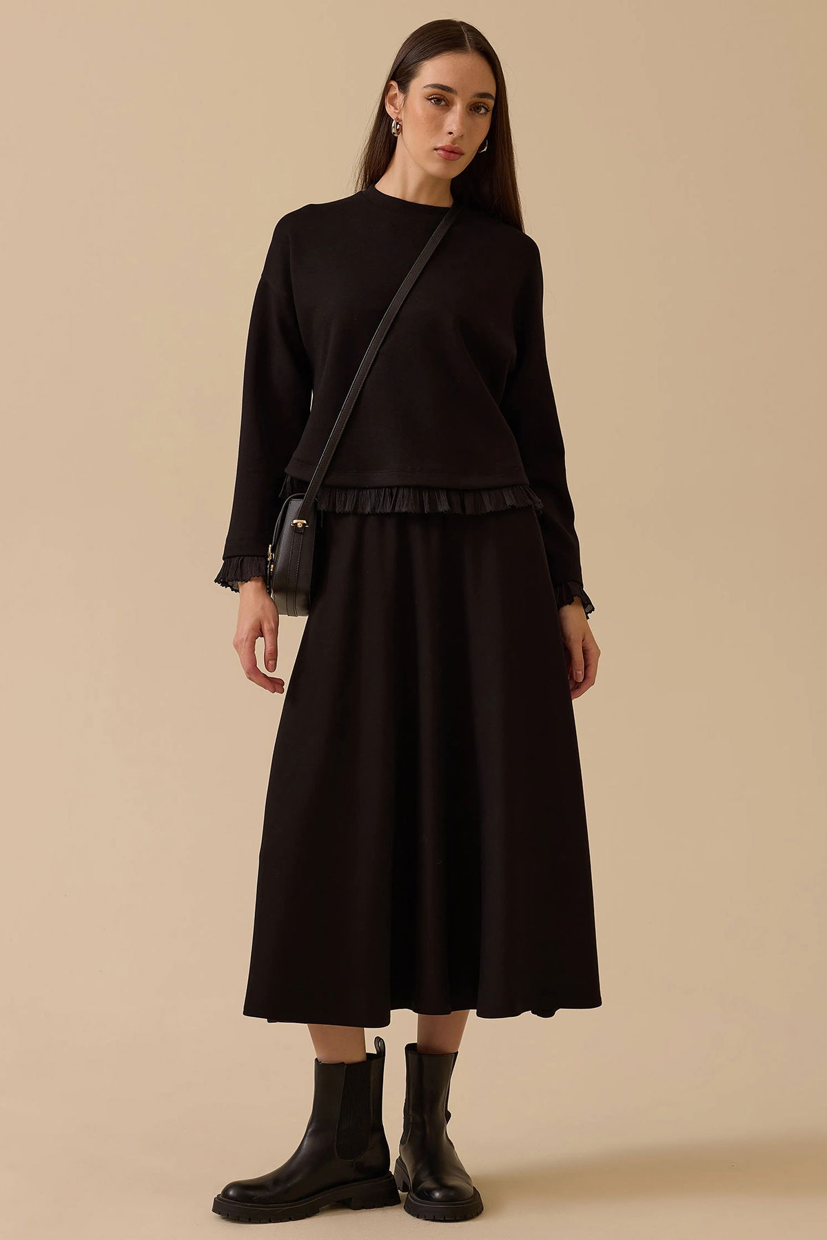 Detay: Sıfır yaka ve uzun takma kol detaylarıyla sade bir duruş sunan A kesim sweat, minimalist tarzı fırfır gibi zarif dokunuşlarla zenginleştiriyor. Bel hizasında biten düz dokuma örme kumaşı, yumuşak dokusuyla konfor sağlarken aksesuar detaylarıyla modern bir hava katıyor. Günlük stilinize feminen ve özgün bir dokunuş eklemek isteyenler için ideal bir parça;