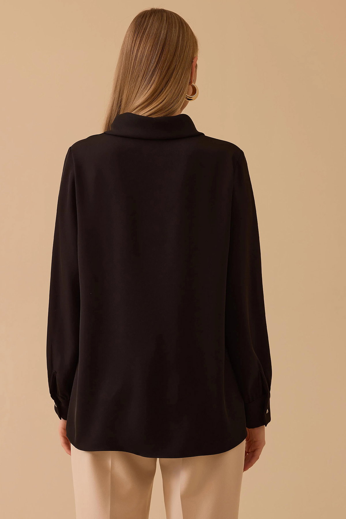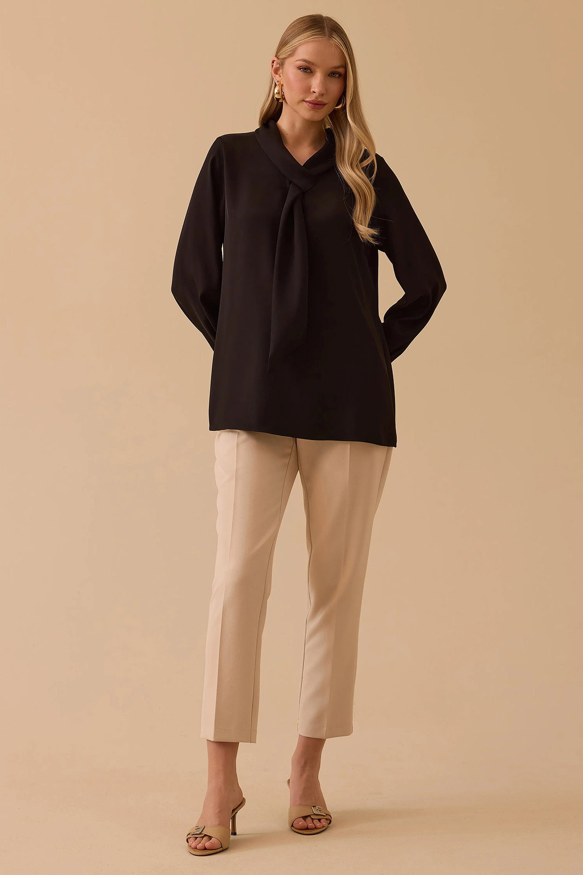 Detay: Fular yakalı, basen boy, düz krep kumaştan, takma kollu, dokuma yapıya sahip ve uzun kollu bu bluz zarif bir tasarıma sahiptir. Fular yaka detayı sofistike bir görünüm kazandırırken krep kumaşın dökümlü yapısı şıklığı ön plana çıkarır. Basen boy uzunluğu ve takma uzun kollar ise günlük ve özel kombinlerde modern bir duruş sunar;