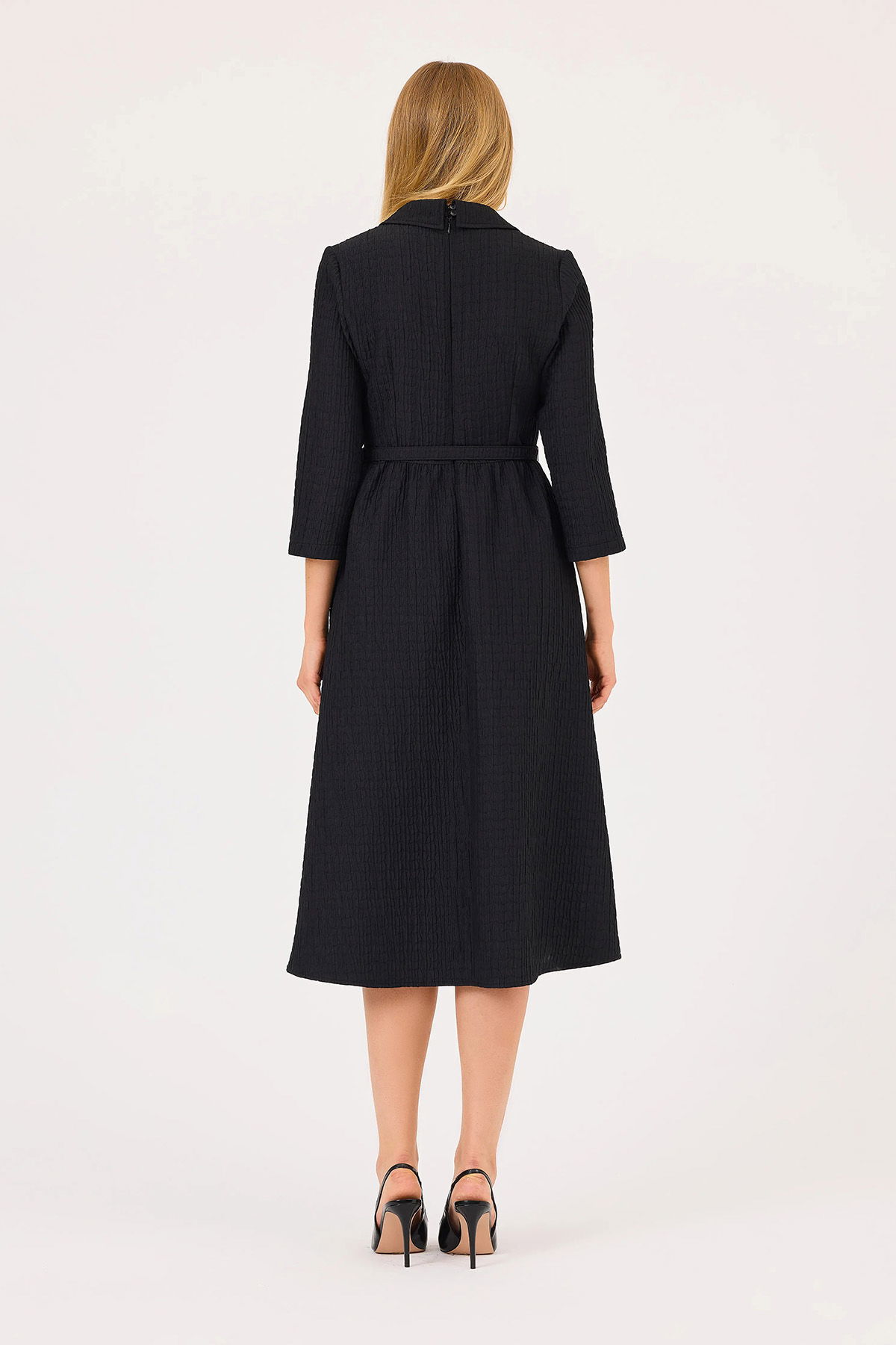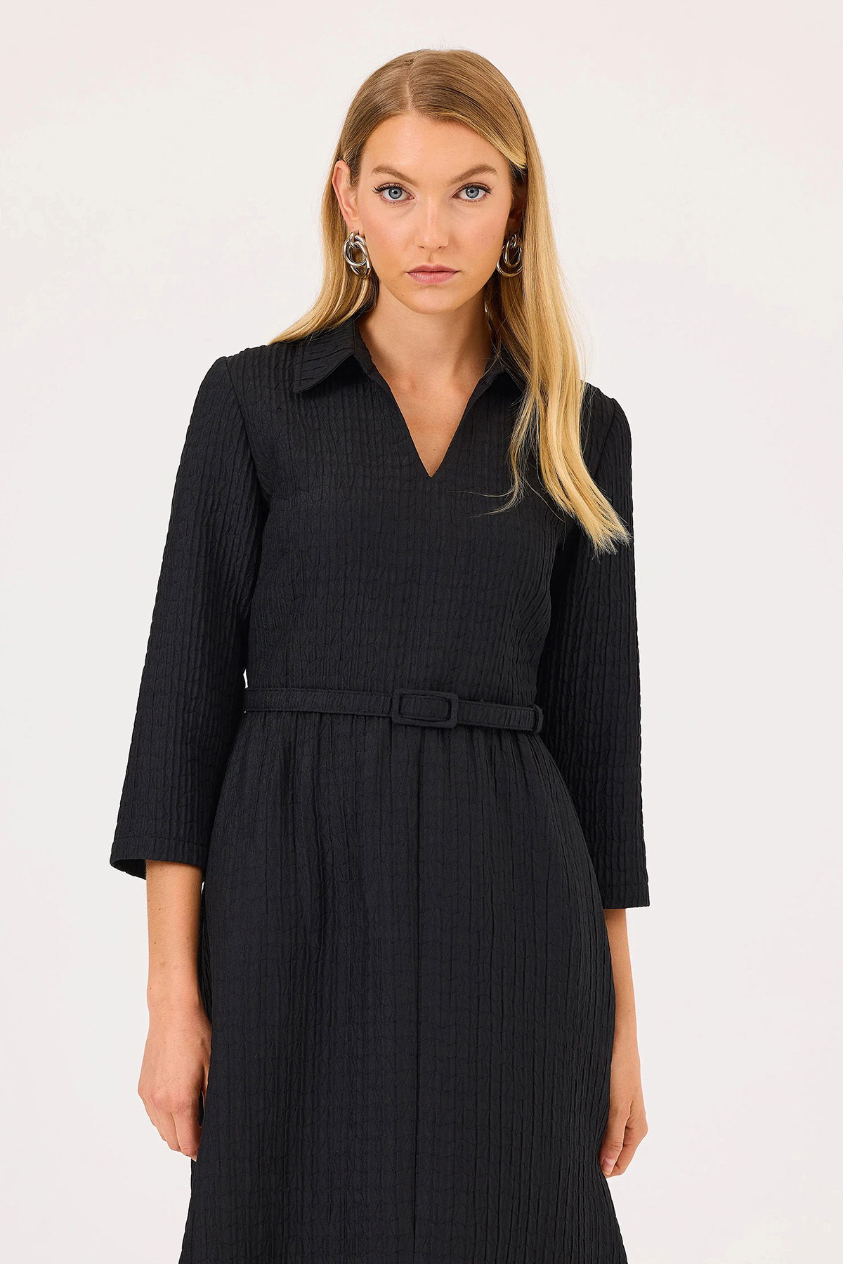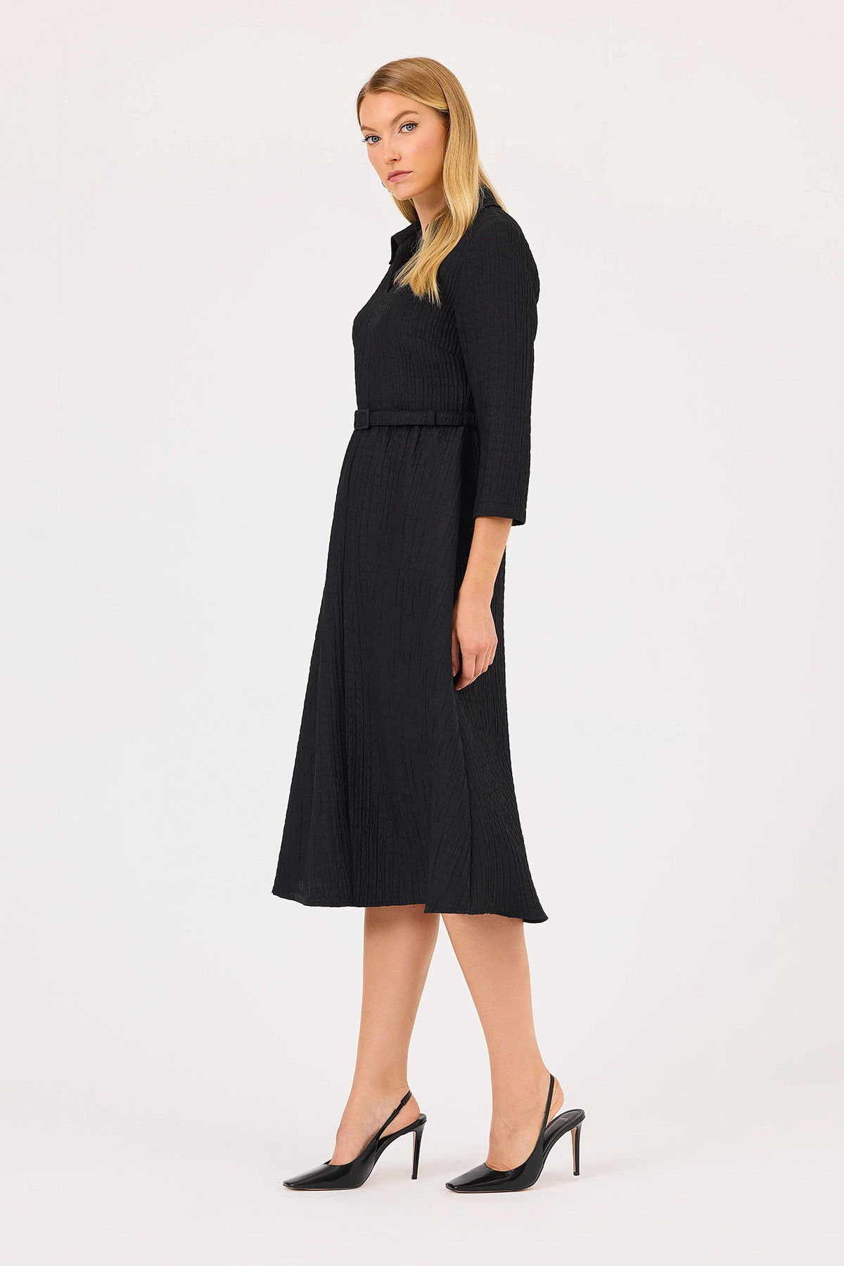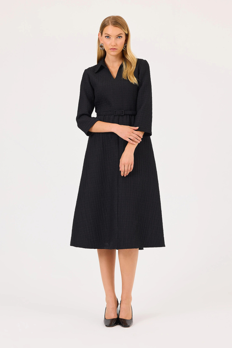 Detay: Gömlek yaka, truvakar kol, midi boy, bele oturan tip elbise;