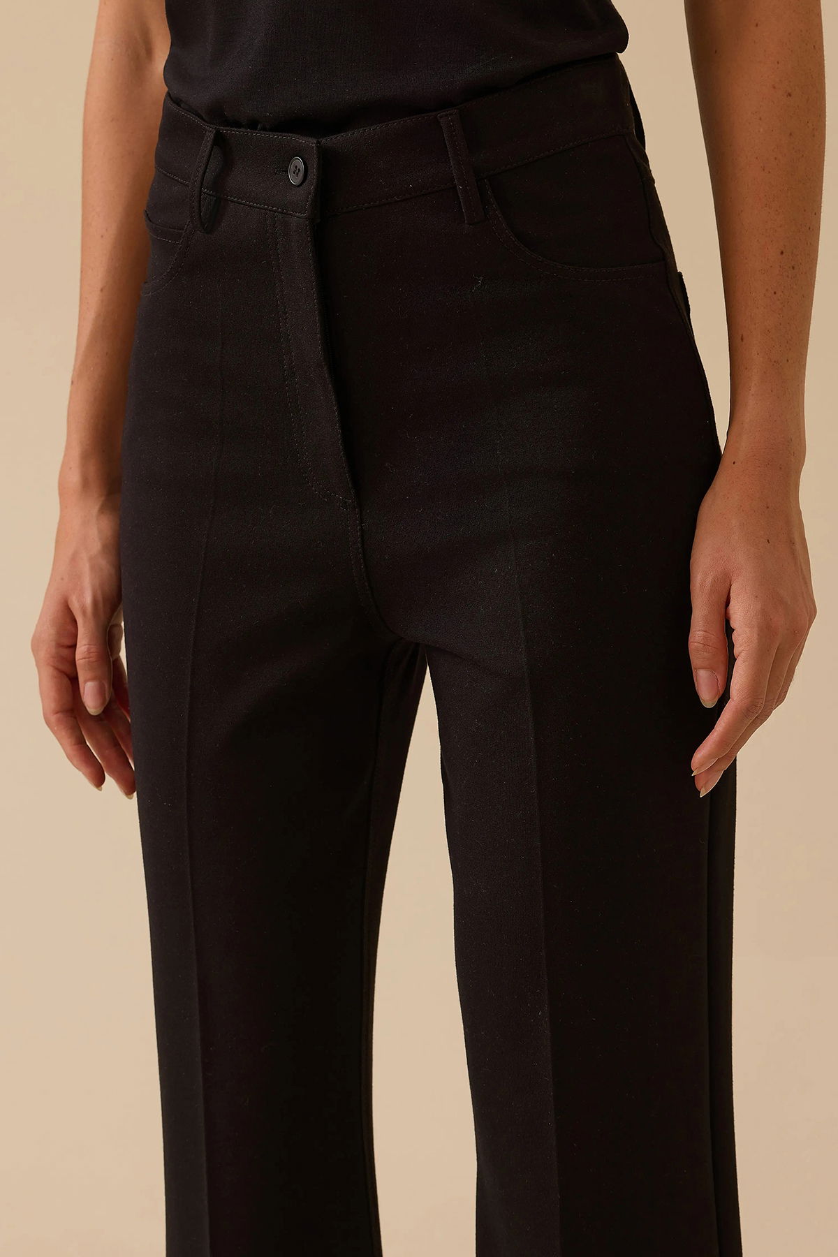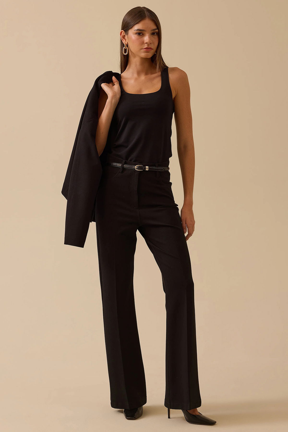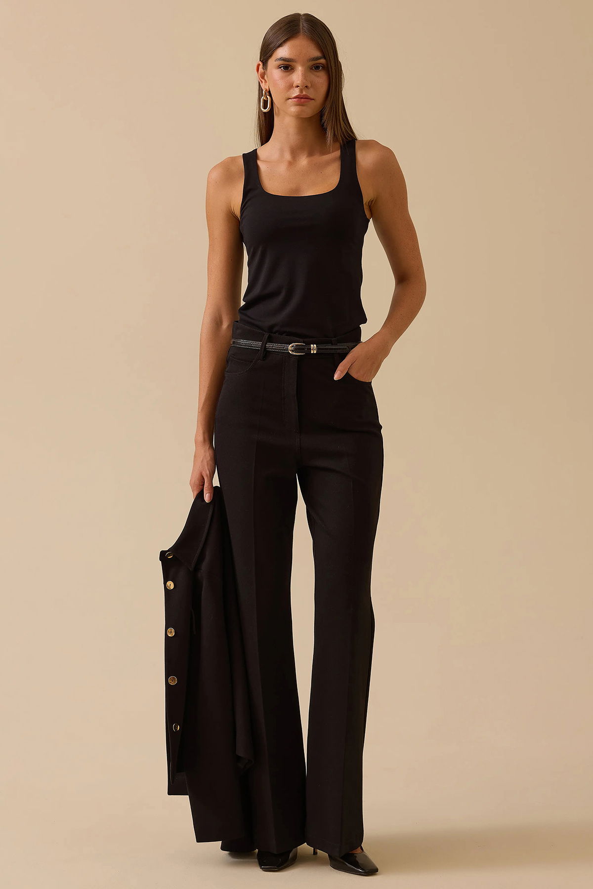 Detay: Yüksek bel tasarımıyla zarif bir duruş sunan fermuarlı pantolon, Aila kalıbı ve tam boy ispanyol paça kesimiyle klasik stile modern bir yorum katıyor. Düz dokuma örme kumaşı sayesinde hem şık hem de konforlu bir kullanım sağlıyor. Günlük kombinlerden özel davetlere kadar geniş bir kullanım alanı sunan bu pantolon, feminen ve güçlü bir siluet oluşturuyor;