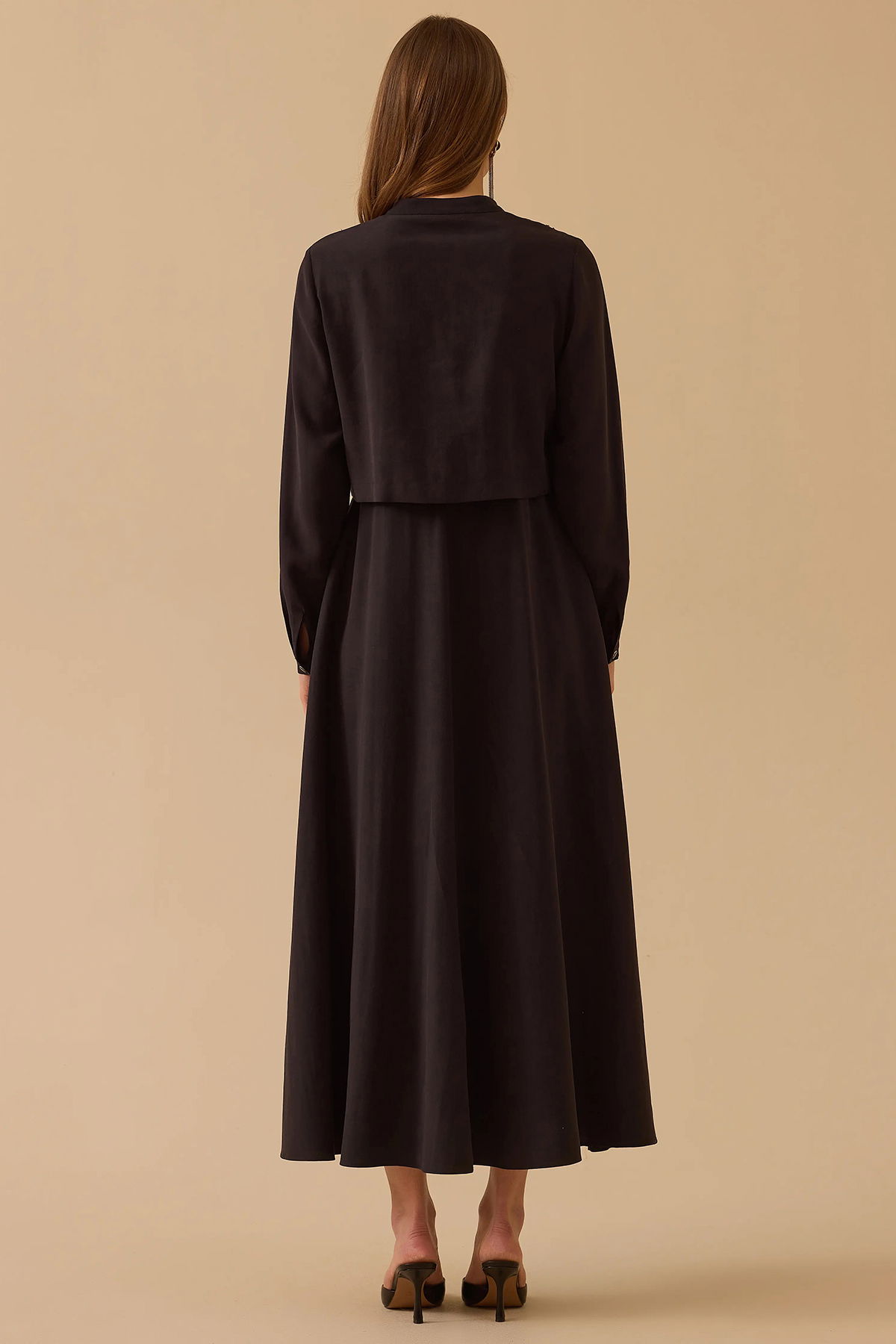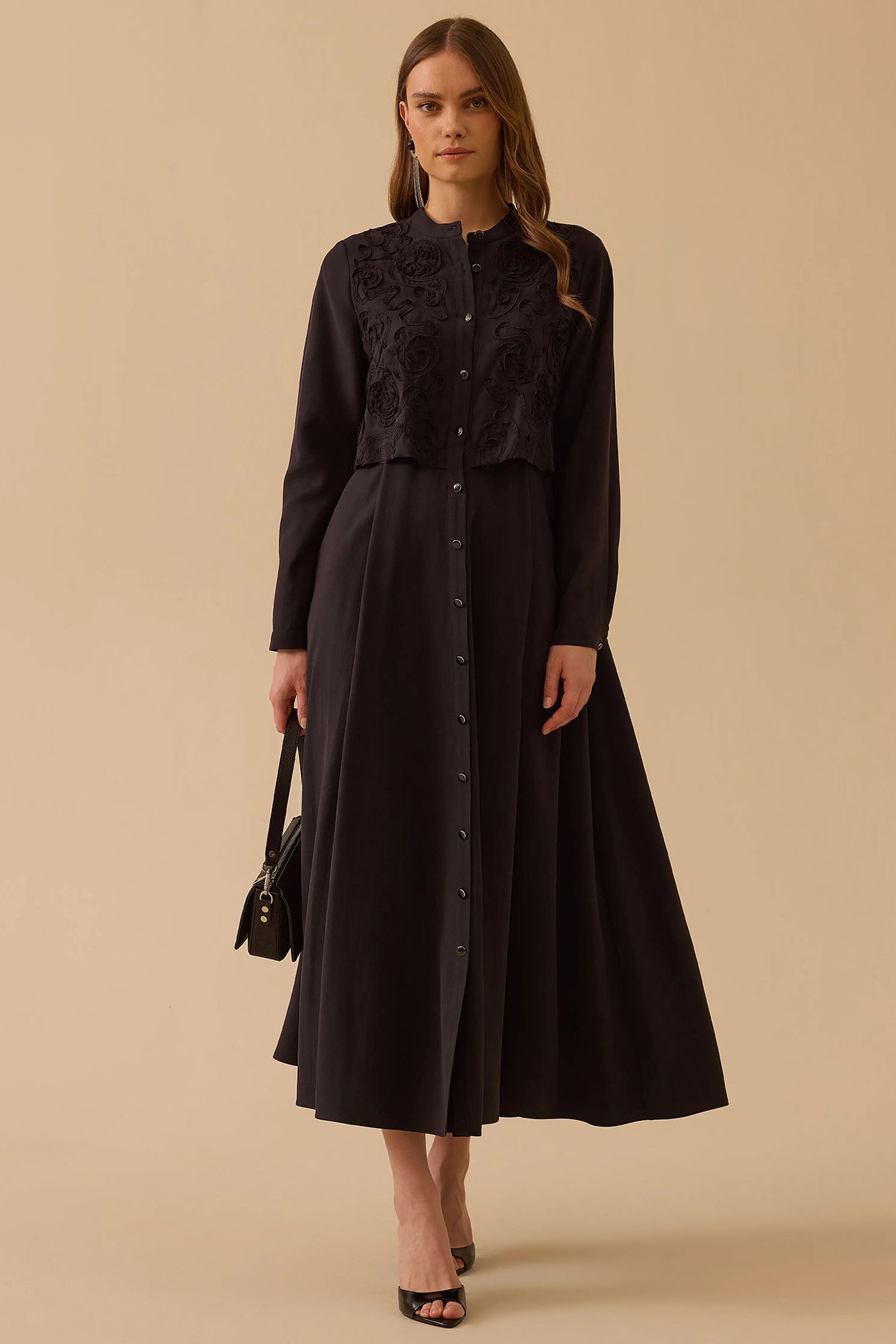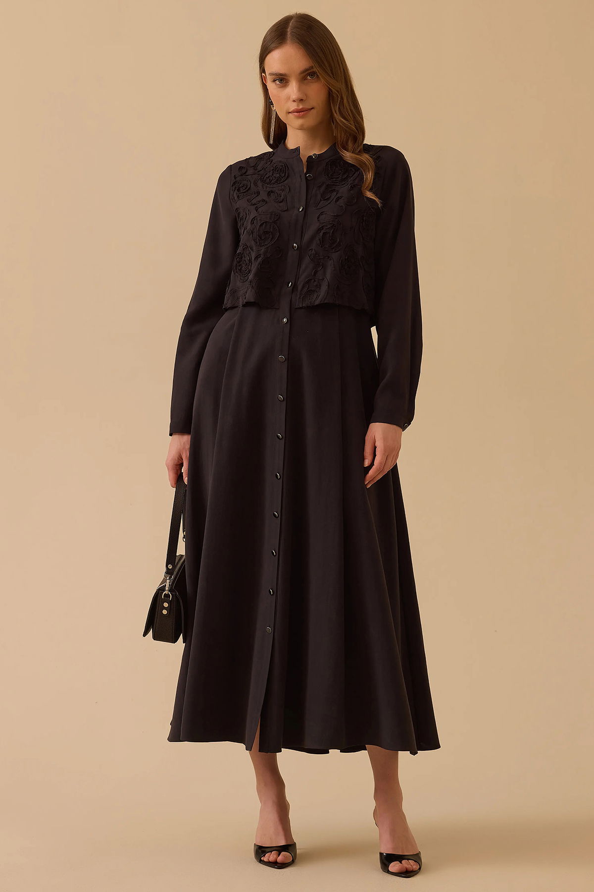 Detay: Lyocell karışımlı dokuma kumaştan üretilen bu elbise, A kesim formu ve maksi boyuyla zarif bir siluet sunuyor. Normal bel tasarımı rahat bir kullanım sağlarken, düz kumaş özelliği sade bir şıklık katıyor. Uzun takma kollar feminen bir görünüm kazandırırken, astarlı yapısı konforlu bir kullanım imkânı veriyor. Günlük kombinlerden özel davetlere kadar geniş kullanım alanına sahip bu elbise, modern ve zarif tarzı bir arada sunuyor;