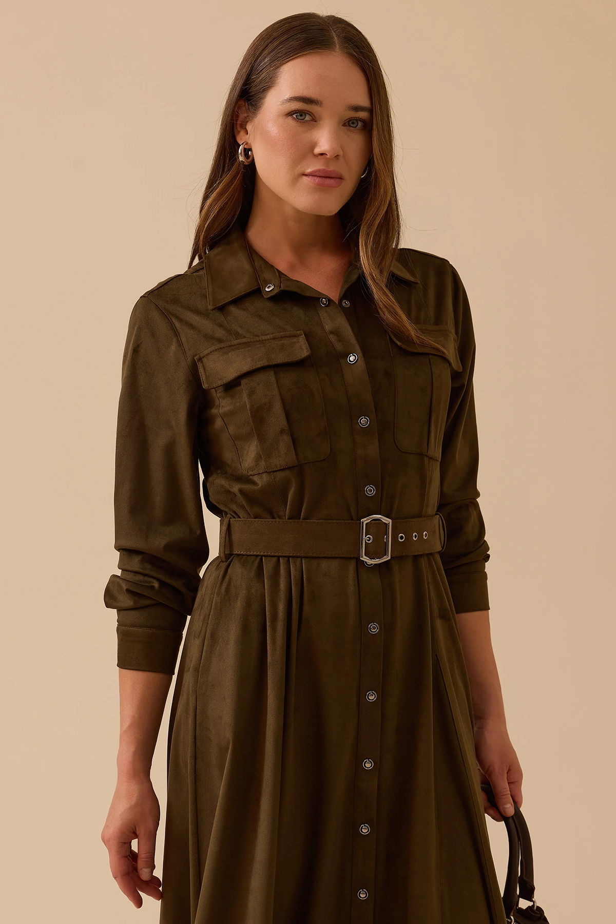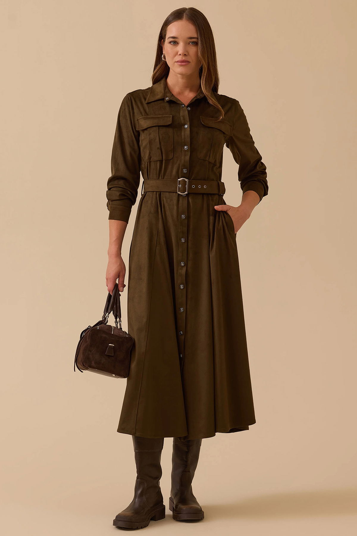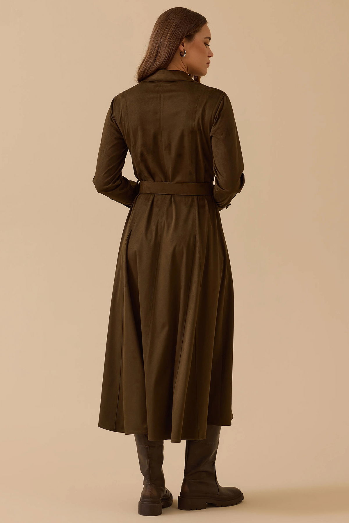 Detay: A kesim ve bele oturan yapısıyla zarif bir siluet sunan bu maksi boy süet mont, minimalist tarzı benimseyenler için ideal bir seçimdir. Gömlek yaka, takma uzun kol ve düğmeli kapanış detaylarıyla klasik şıklığı modern dokunuşlarla buluşturur. Düz dokuma kumaşı ve kemer aksesuarı sayesinde hem sade hem etkileyici bir görünüm sağlar;