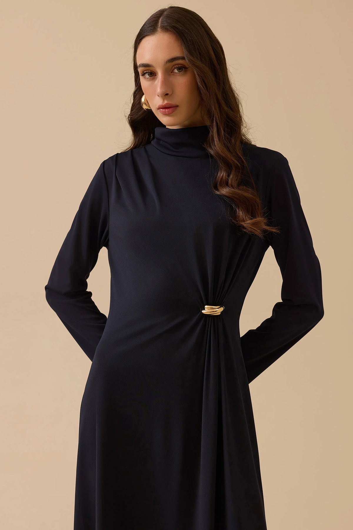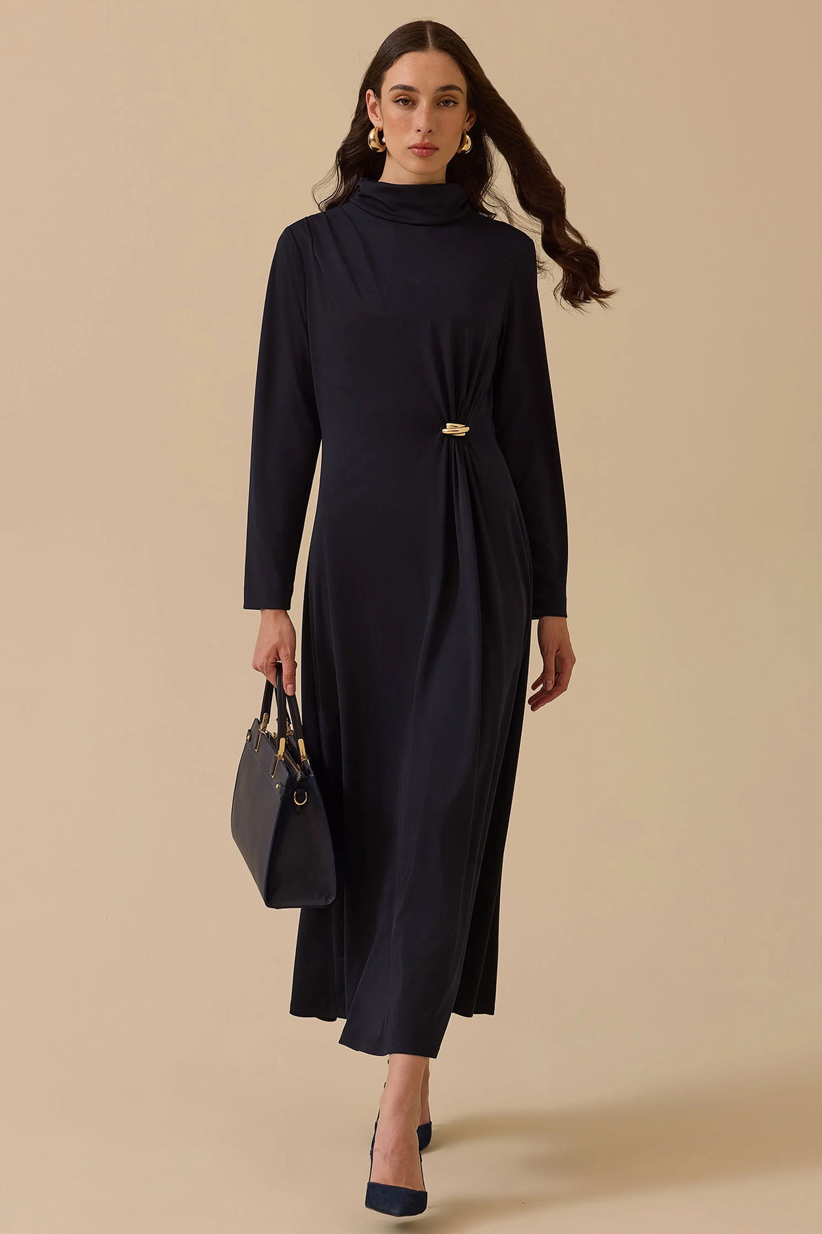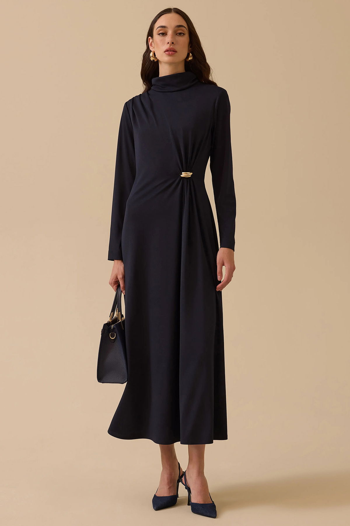 Detay: Dar form kesimi ve bele oturan yapısıyla vücut hatlarını zarifçe vurgulayan bu uzun elbise, şık tarzıyla özel günlerin vazgeçilmezi olur. Dik yakası, takma uzun kolları ve düz dokuma örme kumaşıyla hem modern hem de sofistike bir görünüm sunar. Gün boyu konfor sağlayan dokusuyla stil sahibi kadınların gardırobunda mutlaka yer alması gereken bir parçadır;