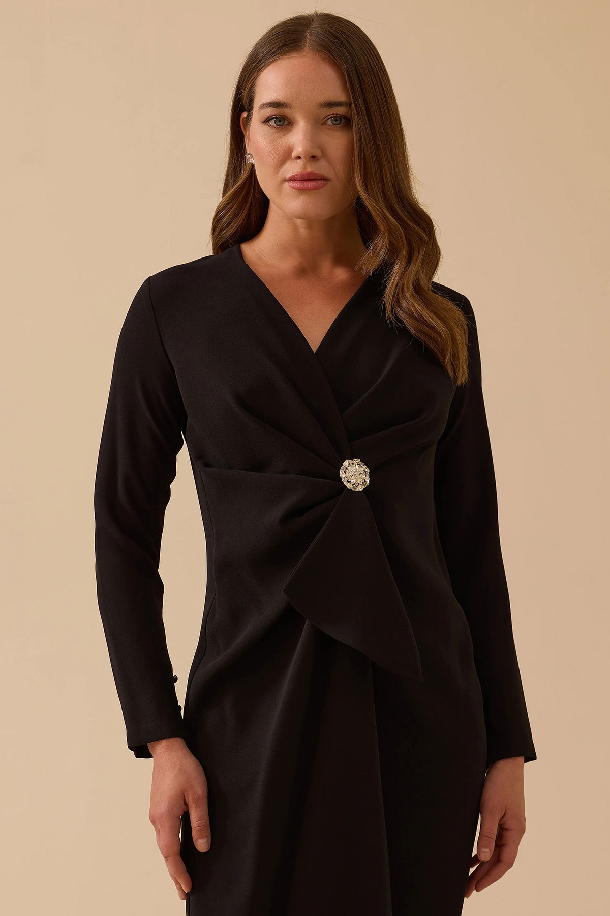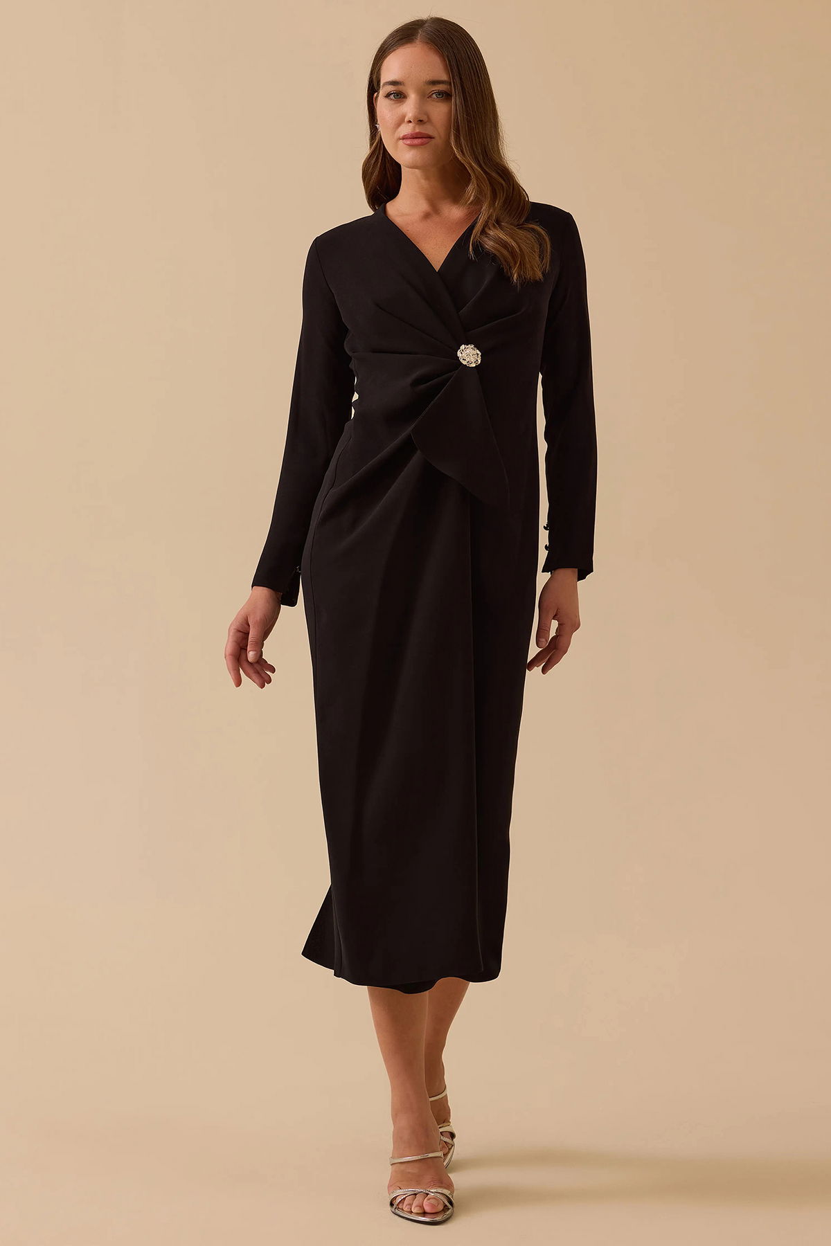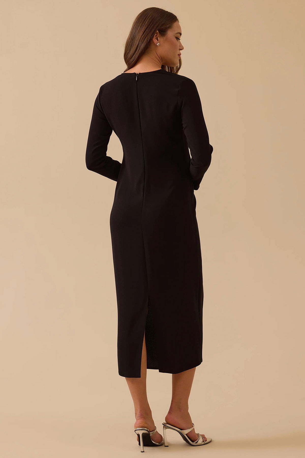 Detay: Dar form kesimiyle vücut hatlarını zarifçe saran bu midi boy elbise, kruvaze yaka ve bele oturan tasarımıyla şık bir siluet sunar. Uzun takma kolları ve düz krep kumaşıyla hem sade hem sofistike bir görünüm sağlar. Fermuarlı kapama ve aksesuar detaylarıyla modern stilinize zarif bir dokunuş katar;