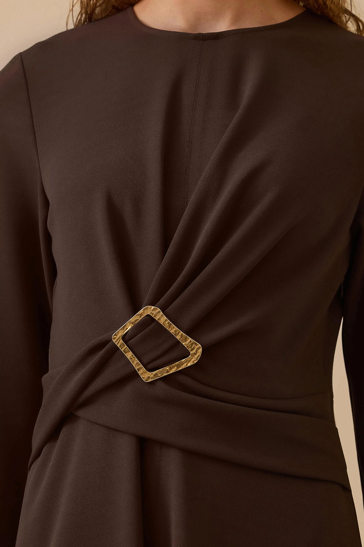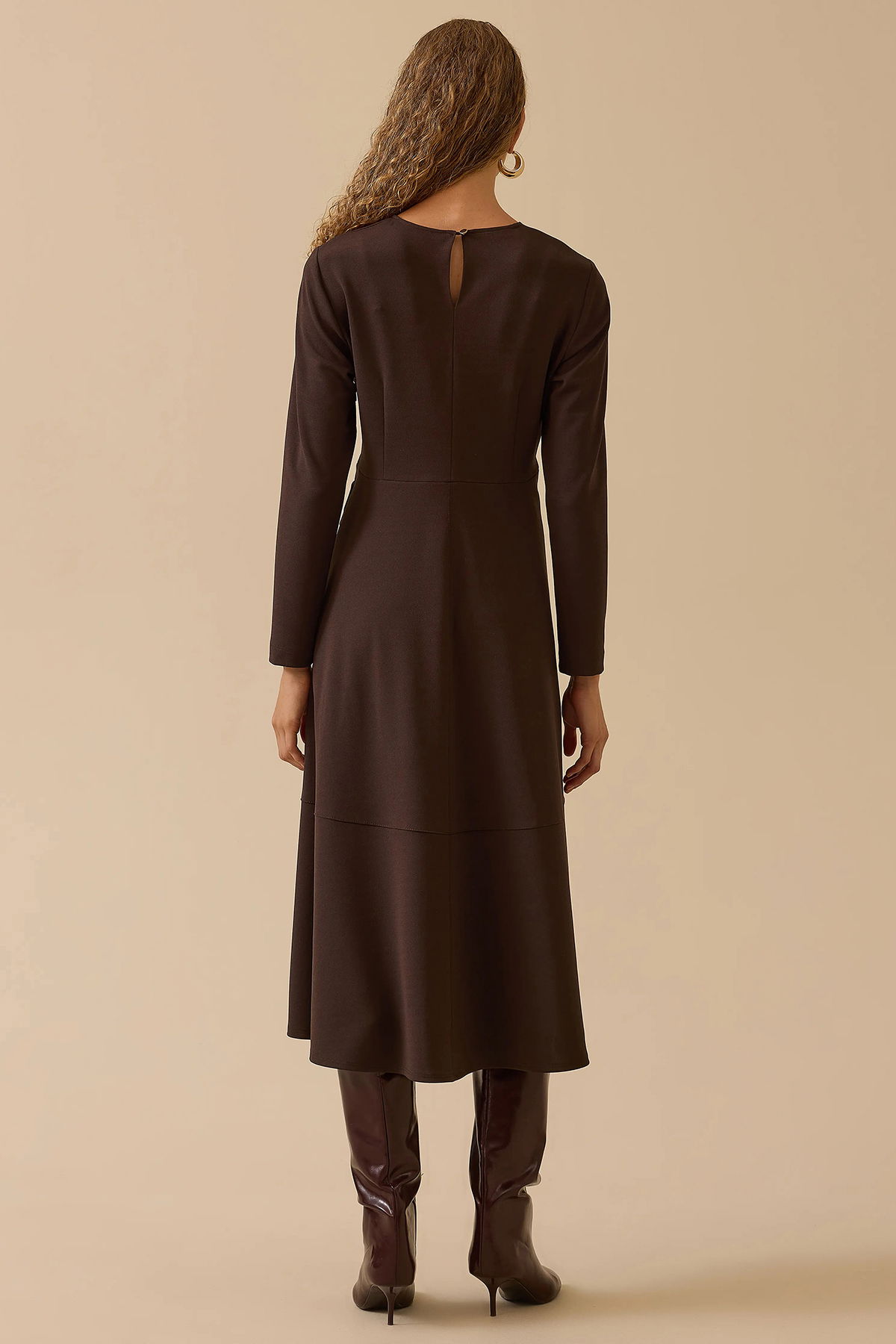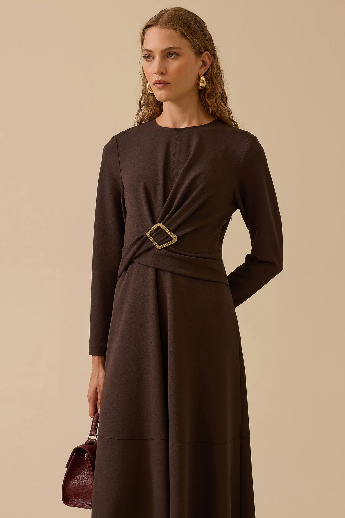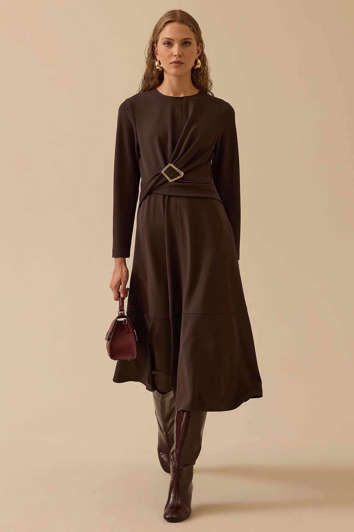 Detay: Beli büzgülü dar form kesimiyle feminen bir siluet sunan uzun kollu midi elbise, sıfır yaka tasarımıyla sade ve zarif bir duruş sergiliyor. Düz krep kumaşı ve örme dokuma tipi sayesinde hem şık hem de konforlu bir kullanım sağlıyor. Takma kol detayı ve aksesuarlarla zenginleştirilen bu elbise, özel günlerde stilinizi öne çıkarıyor;