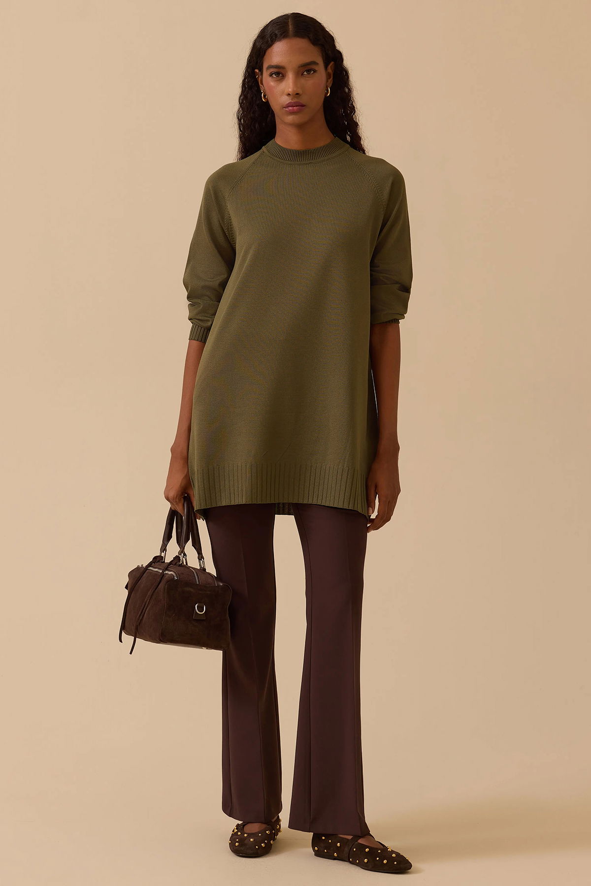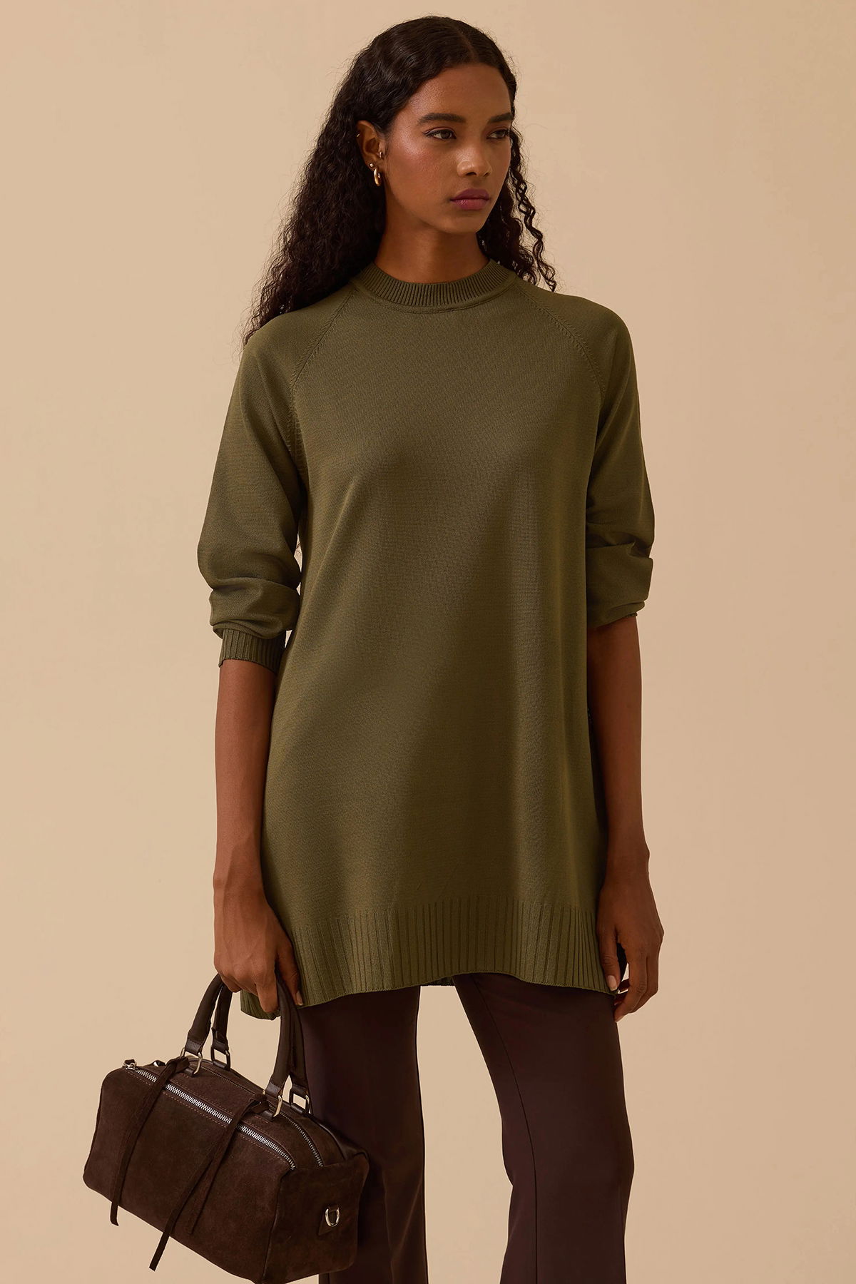 Detay: Sıfır yaka ve uzun kol tasarımıyla sade bir görünüm sunan regular kesim tunik, günlük stilin vazgeçilmez parçalarından biri. Basen altı boyu sayesinde rahat bir kullanım sağlarken, düz örme kumaşıyla yumuşak ve konforlu bir dokunuş sunar. Minimal detaylarıyla öne çıkan bu tunik, hem evde hem dışarıda şıklığı ve rahatlığı bir arada arayanlar için ideal bir seçimdir;