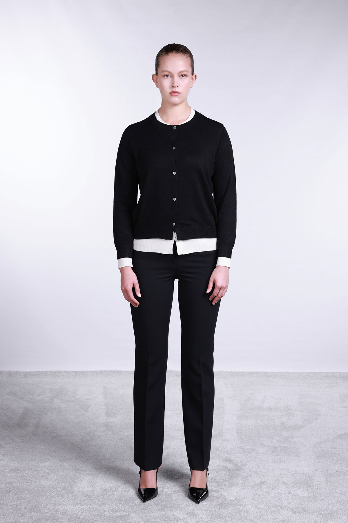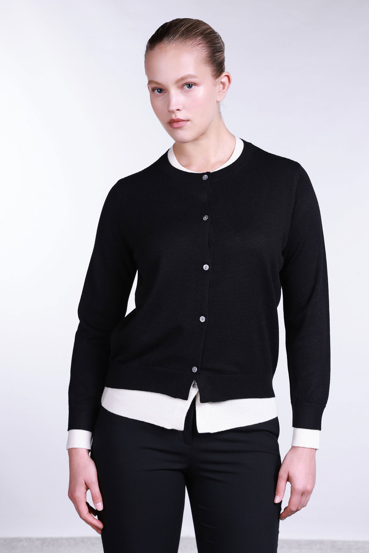 Detay: Ön yüzü çift triko katlı tasarlanan bu yün içerikli hırka, etek ucu ve yakasında kullanılan farklı triko renkleriyle özgün bir kontrast oluşturur. Düğme kapamalı yapısı pratik kullanım sağlarken, alttaki sabit dikimli triko parça modele katmanlı ve şık bir görünüm kazandırır. Hem sıcak tutan yapısı hem de estetik detaylarıyla bu hırka, kış kombinlerinde stilinizi tamamlayan özel bir parçadır;