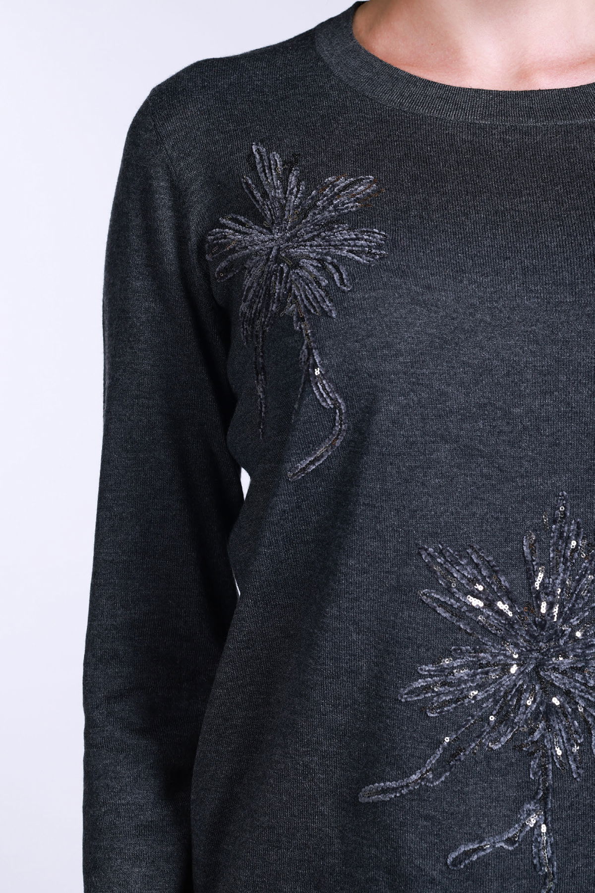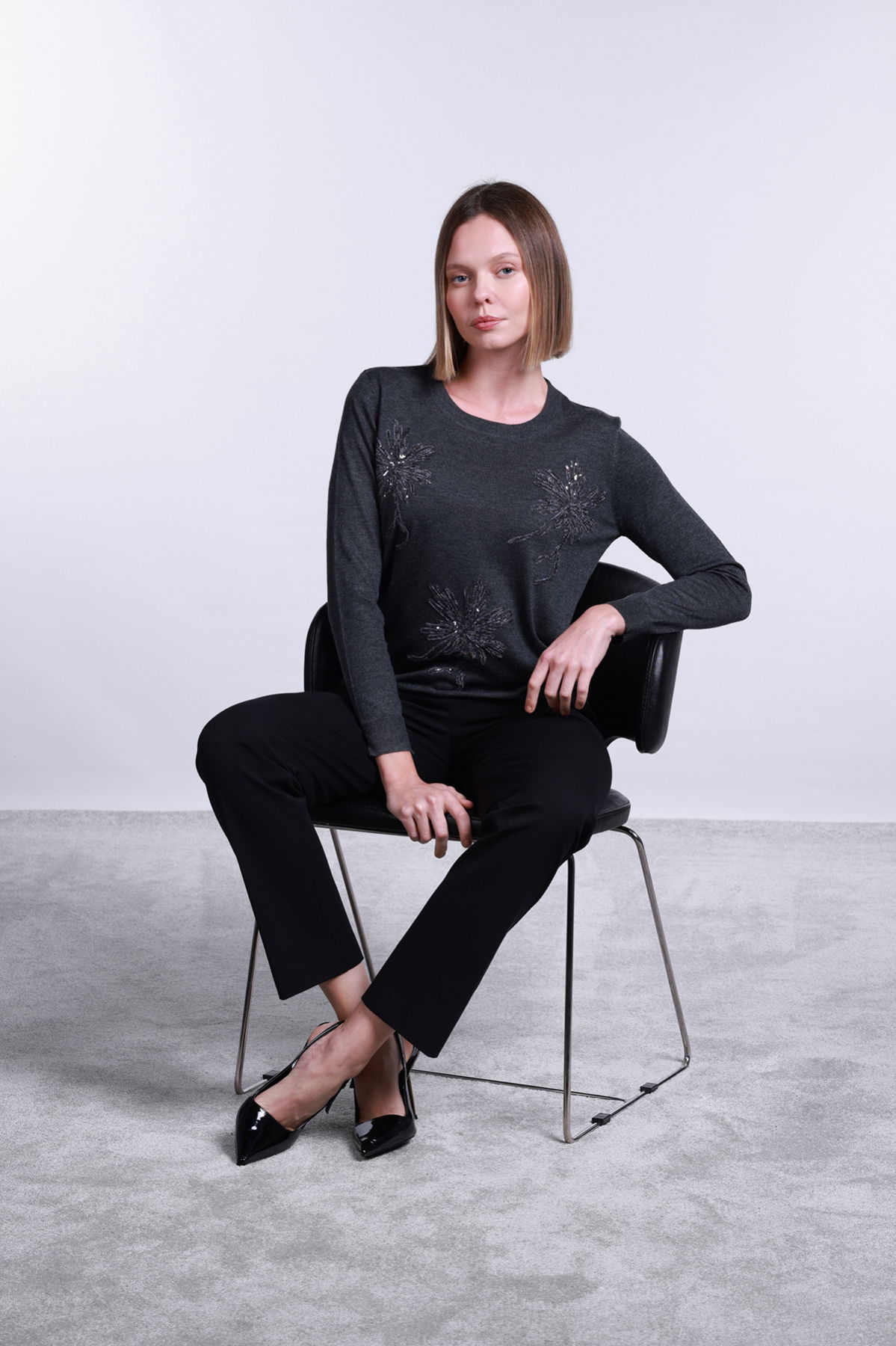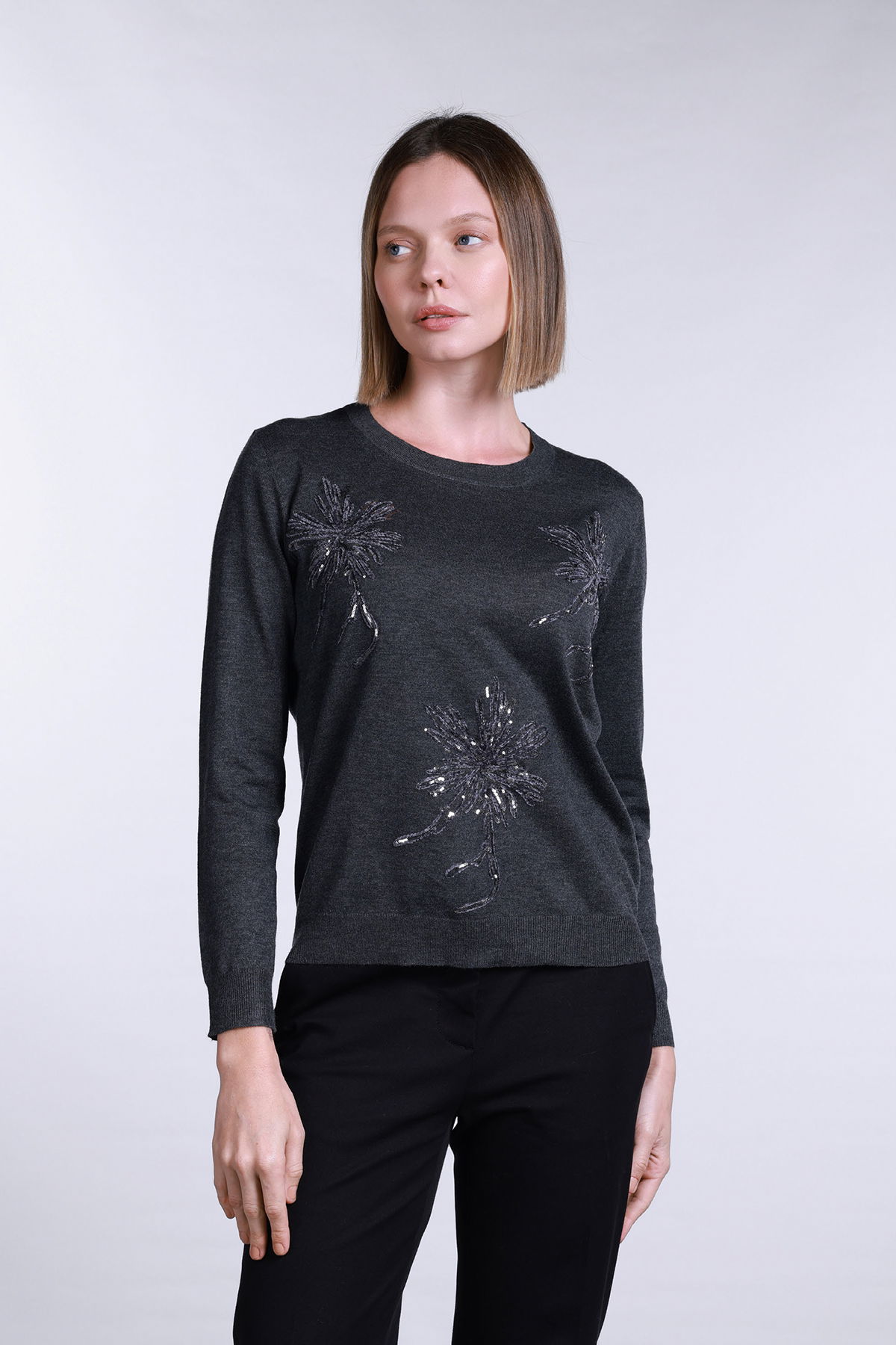 Sempre Kadın Bisiklet Yaka Pul İşlemeli Yün Kazak 2765 Koyu Gri
