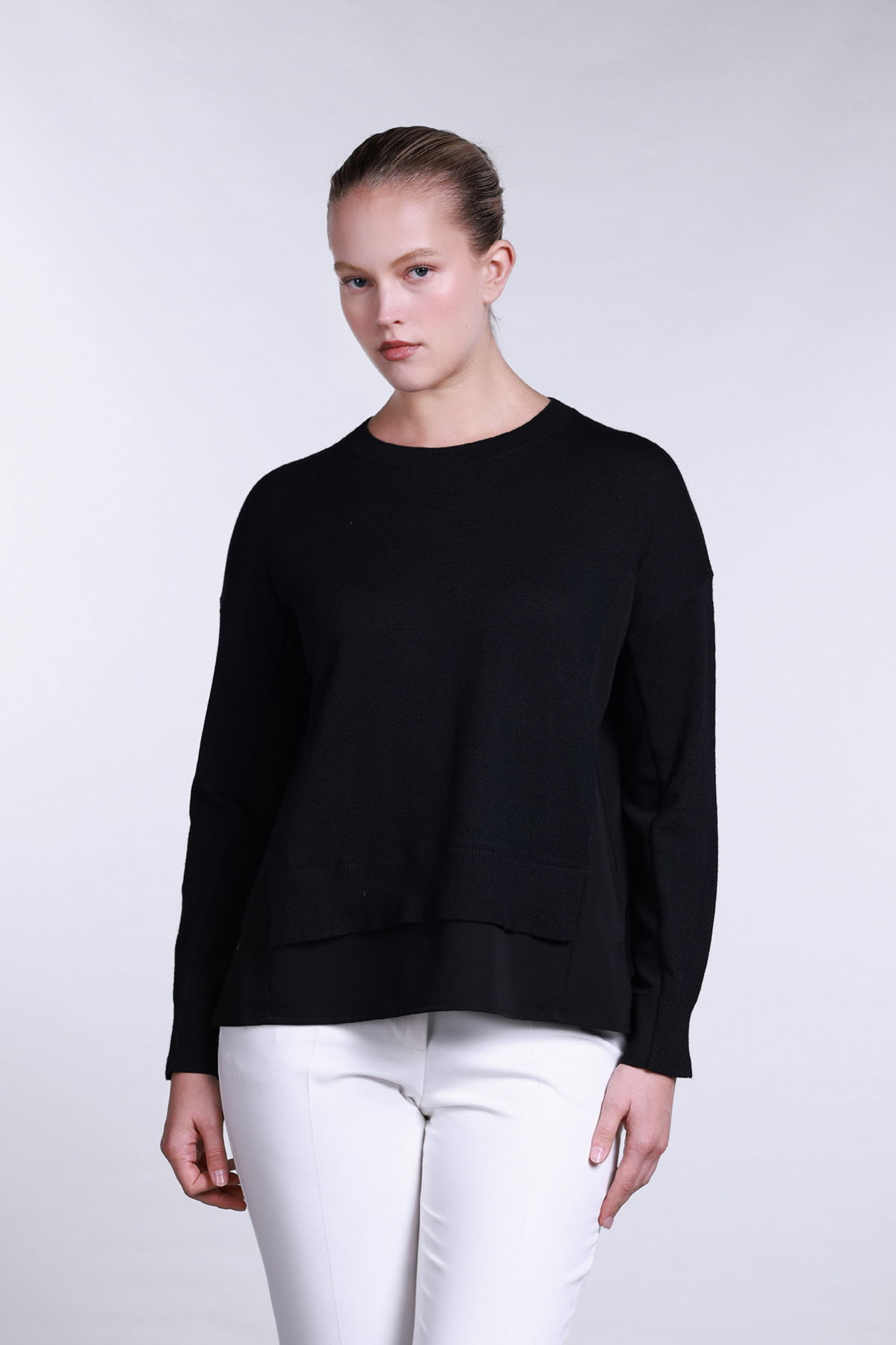 Detay: Bu model, bisiklet yaka tasarımıyla klasik bir sadelik sunarken çift kumaş yapısıyla özgün bir duruş sergiler. Kollar, yan kısımları ve etek ucu kumaş detaylarıyla modern bir kontrast yaratılırken, kalan bölümlerde kullanılan triko dokusu kazak tasarımına sıcak ve konforlu bir hava katar. Yün içerikli yapısıyla hem şıklığı hem de fonksiyonelliği bir arada sunan bu bisiklet yaka kazak modeli, stiline özen gösterenler için ideal bir seçenektir;