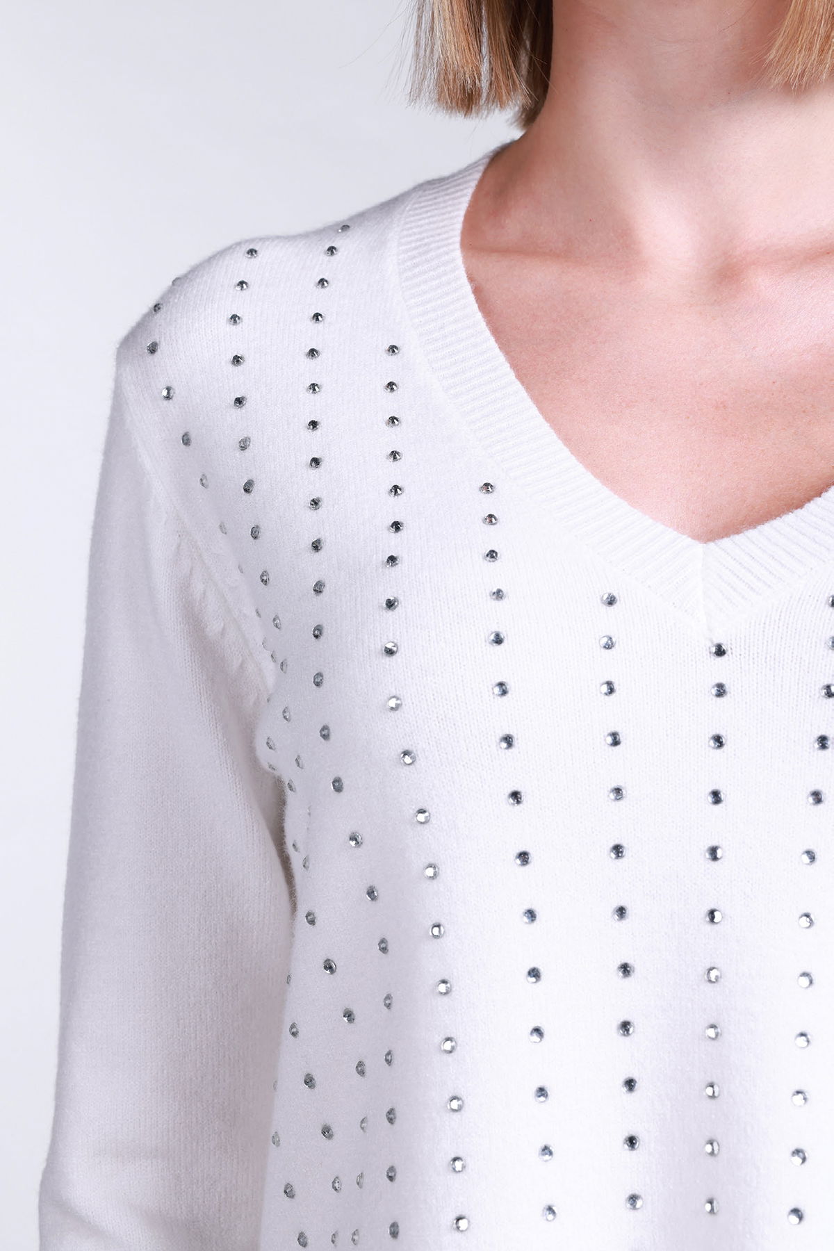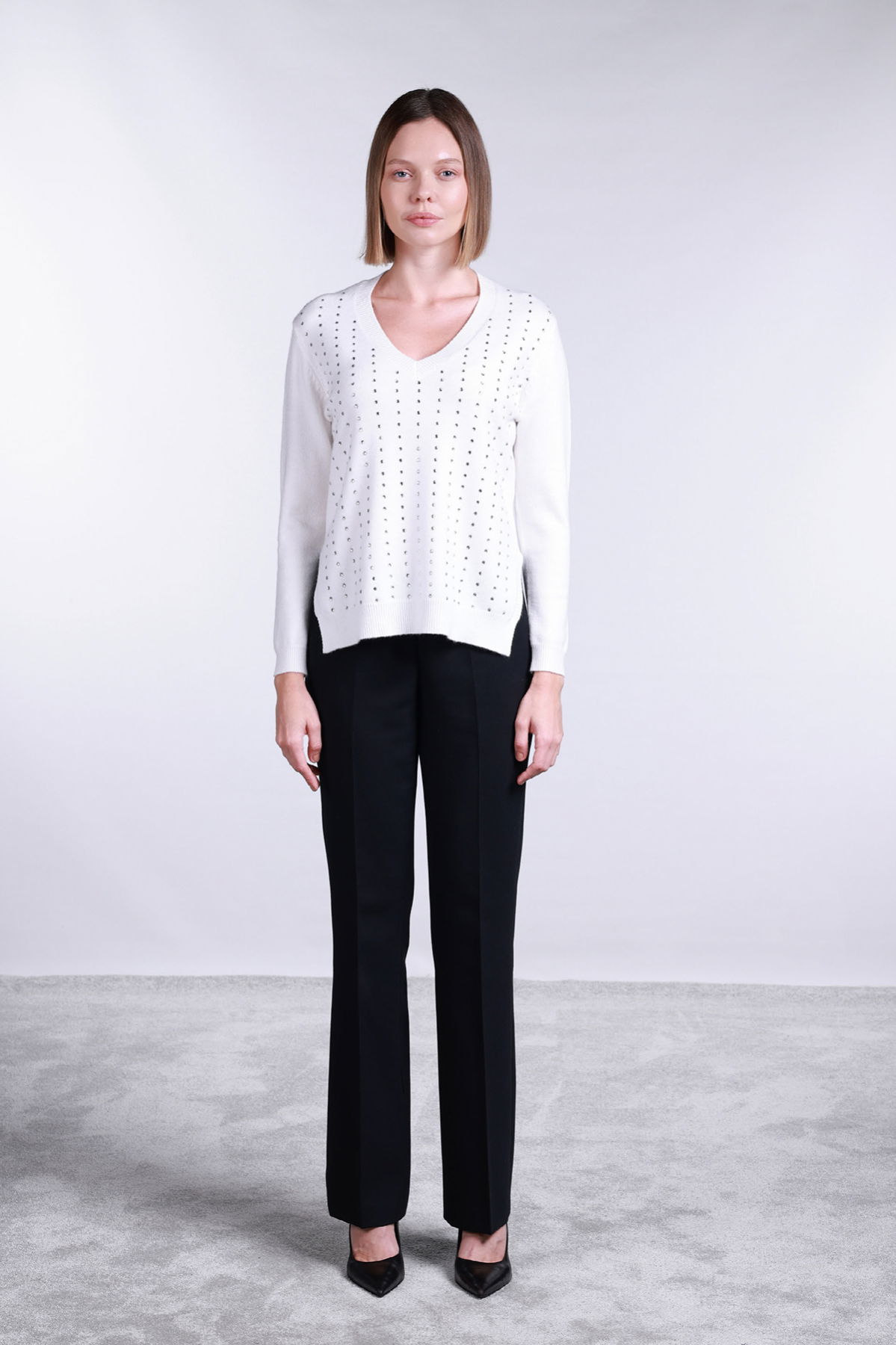 Sempre Kadın V Yaka Yandan Yırtmaçlı Taş Detaylı Kazak 2754 Fildişi