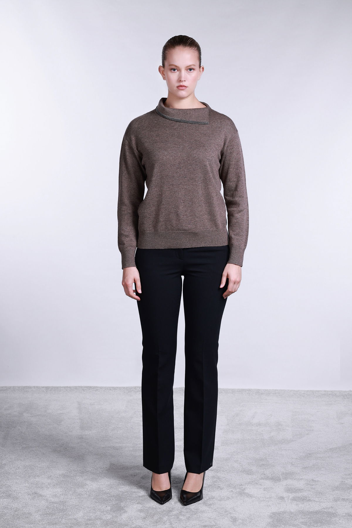 Detay: Uzun kollu tasarımıyla kış aylarında sıcak tutan bu yün içerikli kazak, zarif görünümüyle öne çıkar. Yaka ucunda yer alan şerit taş detayları, modele modern ve dikkat çekici bir dokunuş kazandırır. Hem konforu hem de şıklığı bir arada sunan bu kazak, günlük kombinlerde stilinizi tamamlayan özel bir parçadır;