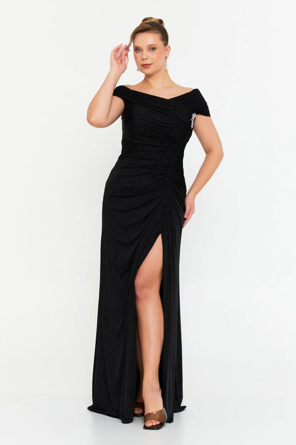 Detay: Simli detaylarıyla geceye ışıltı katan bu maxi abiye elbise, likralı kumaşı sayesinde vücuda tam oturarak zarif bir siluet oluşturur. Derin yırtmaç tasarımı cesur bir dokunuş sunarken, üründeki parlak taşlı toka detayı modern ve şık bir görünüm kazandırır. Astarlı yapısı ile konforu artıran bu model, özel davetlerde hem rahat hem etkileyici bir stil arayanlar için ideal bir seçimdir.;