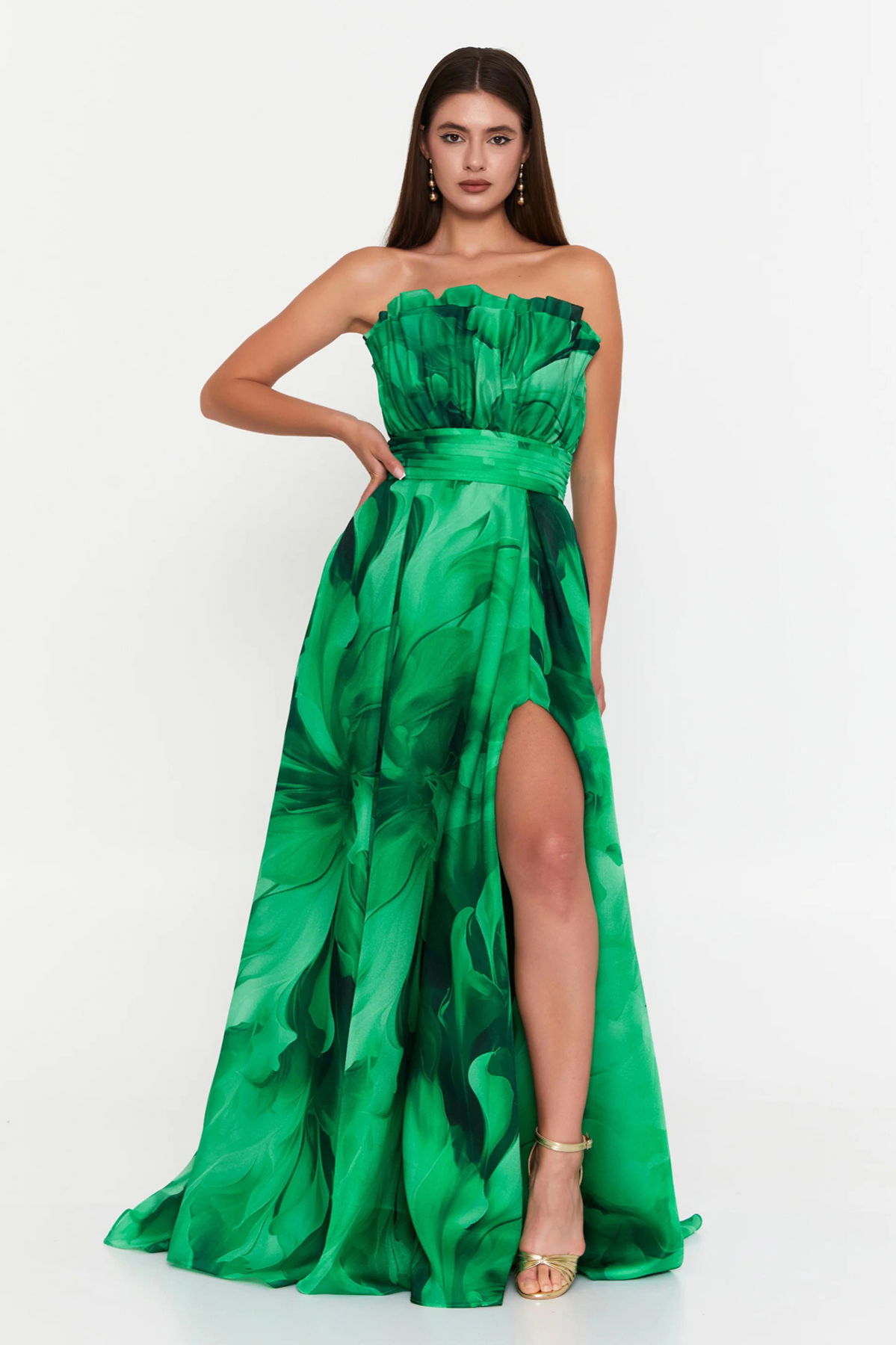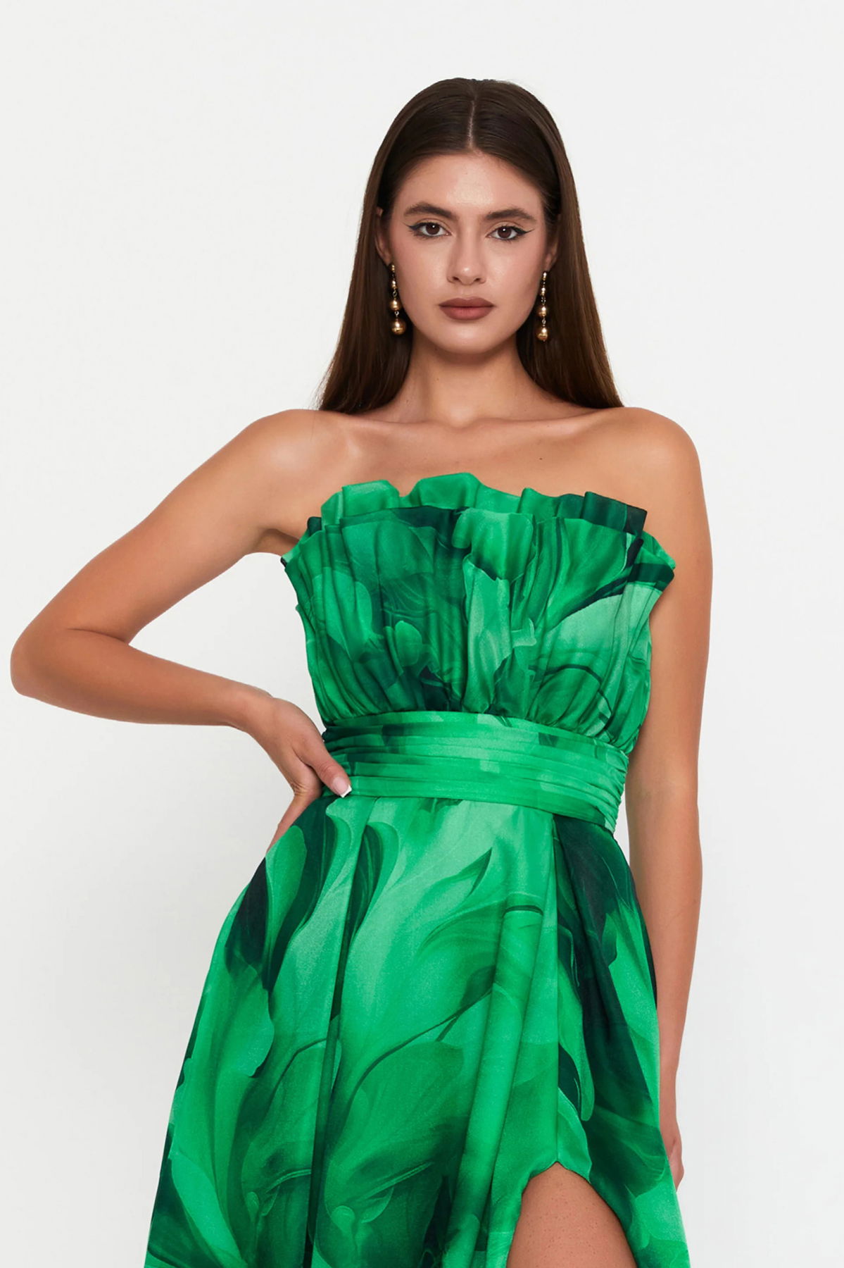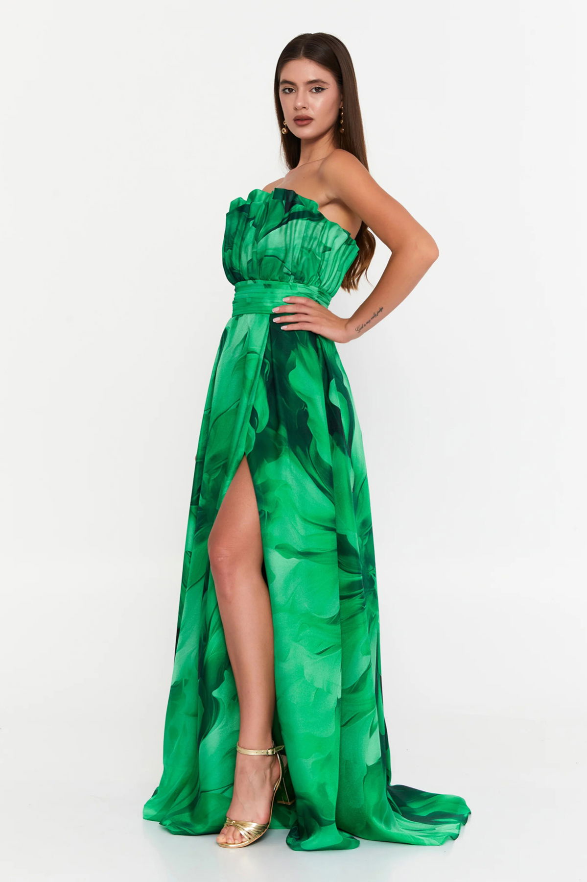 Detay: Bu model, bel ve göğüs drapeli tasarımıyla zarif bir siluet oluştururken şifon kumaşın hafif ve akıcı yapısıyla romantik bir hava sunar. Derin yırtmaç detayı feminen bir şıklık katarken, astarlı ve fermuar kapamalı yapısı konforlu kullanım sağlar. Uzun formuyla bu model, özel davetlerde sofistike ve göz alıcı bir abiye elbise seçeneği olarak öne çıkar;