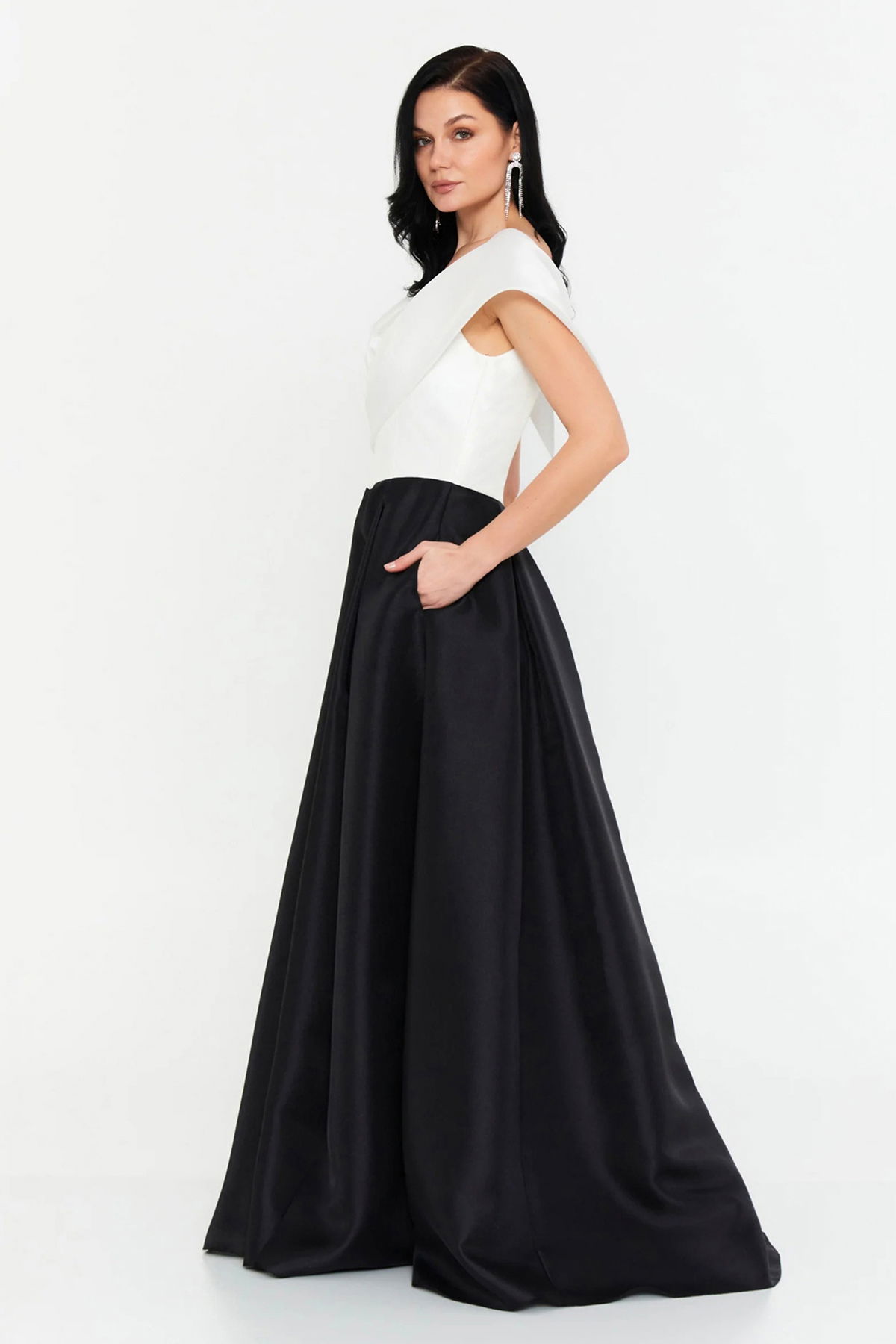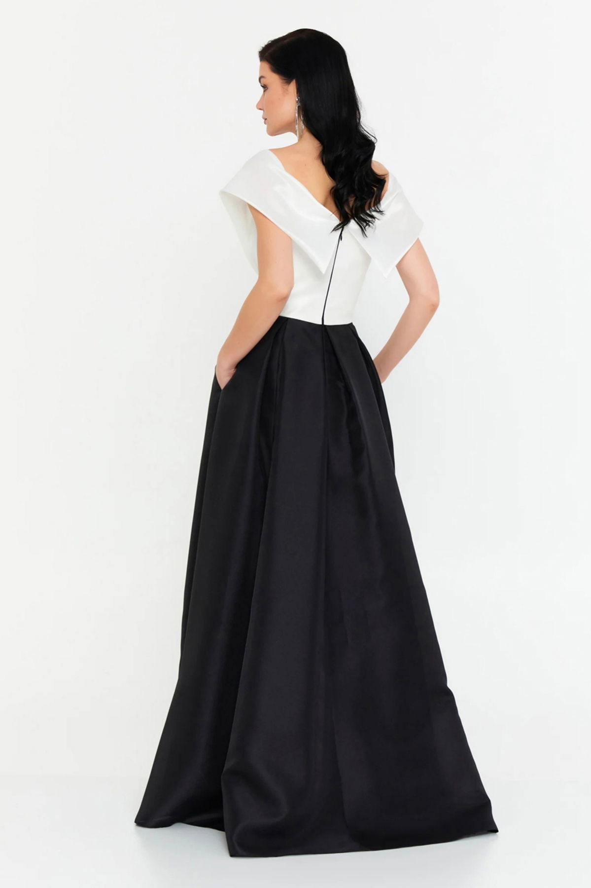 Detay: Tafta kumaştan üretilen Madonna yaka uzun abiye elbise, çift cepli ve tek parça tasarımıyla hem şık hem de fonksiyonel bir kullanım sunar. Çift renkli yapısı ve derin yırtmaçlı kloş formu sayesinde modern ve hareketli bir siluet oluştururken özel davetlerde göz alıcı bir duruş sağlar. Astarlı yapısı ve fermuarlı kapamasıyla konforu şıklıkla buluşturan bu uzun abiye elbise, zarif ve iddialı bir stil arayanlar için ideal bir tercihtir;