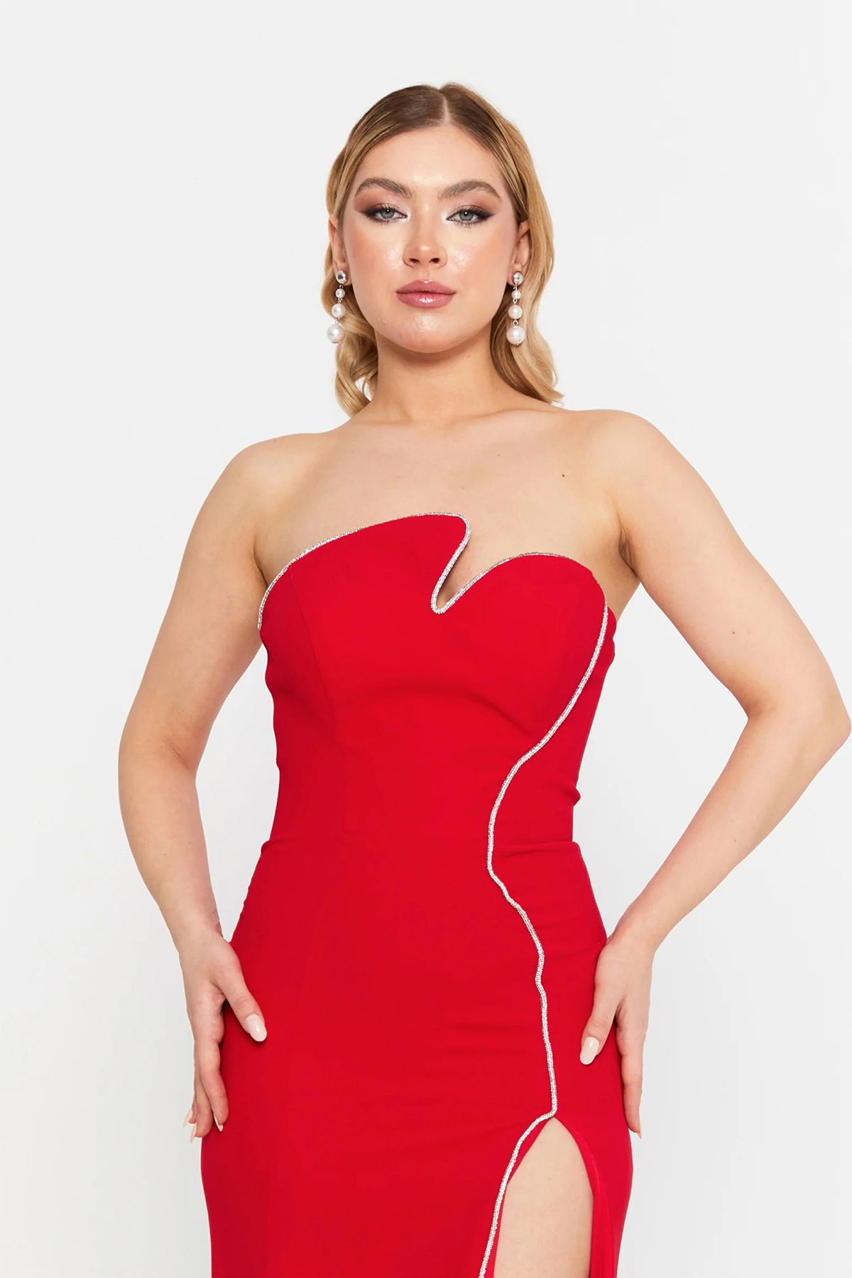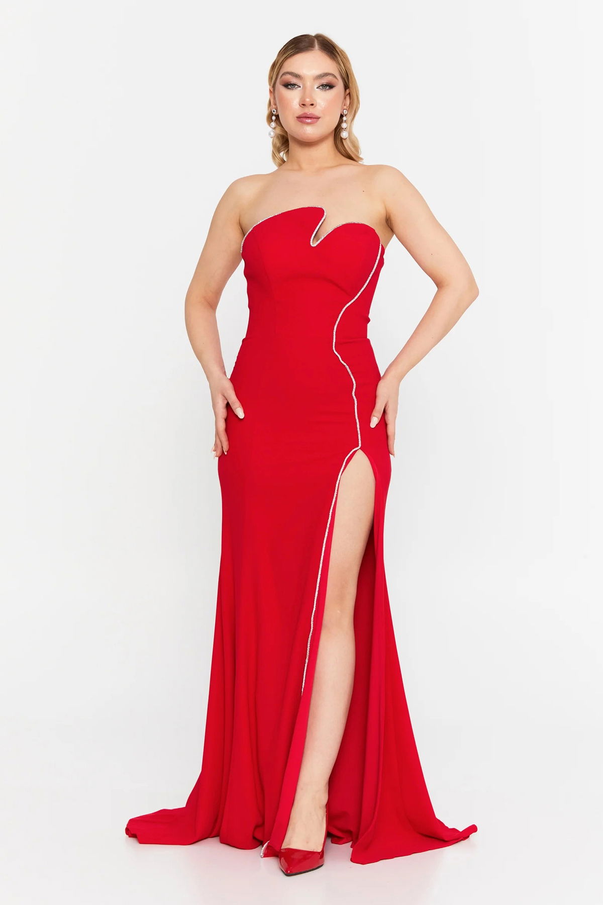 Detay: Bu model, straplez tasarımıyla zarif bir duruş sergilerken derin yırtmaçlı balık form kesimiyle feminen bir şıklık sunar. Krep kumaşın akıcı yapısı ve astarlı iç tasarım, fermuar kapamalı pratik kullanım ile birleşir. Şerit taş işlemeli detaylar ve kuyruklu formu sayesinde bu model, özel davetlerde göz alıcı bir abiye seçeneği olarak öne çıkar;