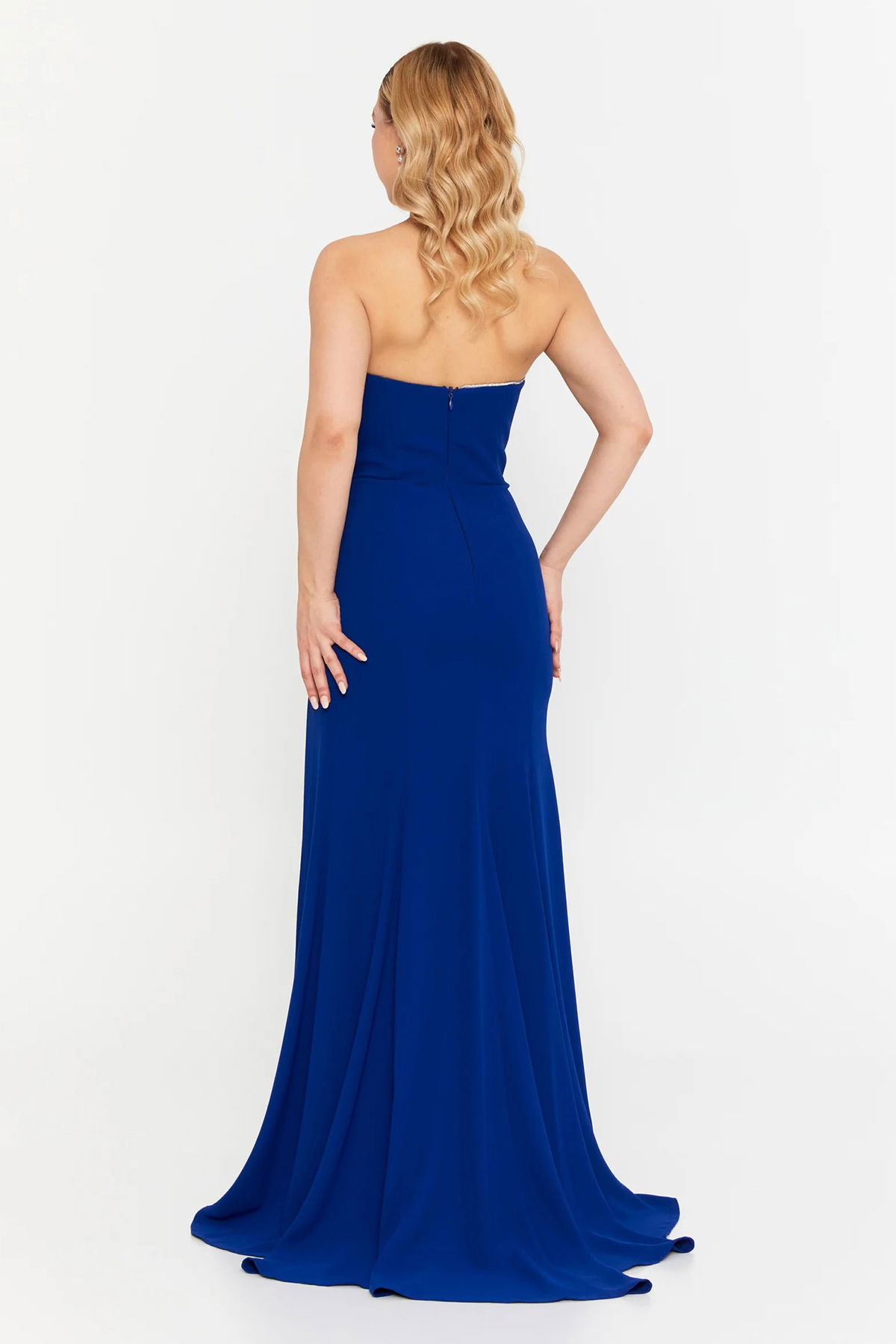Detay: Bu model, straplez tasarımıyla zarif bir duruş sergilerken derin yırtmaçlı balık form kesimiyle feminen bir şıklık sunar. Krep kumaşın akıcı yapısı ve astarlı iç tasarım, fermuar kapamalı pratik kullanım ile birleşir. Şerit taş işlemeli detaylar ve kuyruklu formu sayesinde bu model, özel davetlerde göz alıcı bir abiye seçeneği olarak öne çıkar;