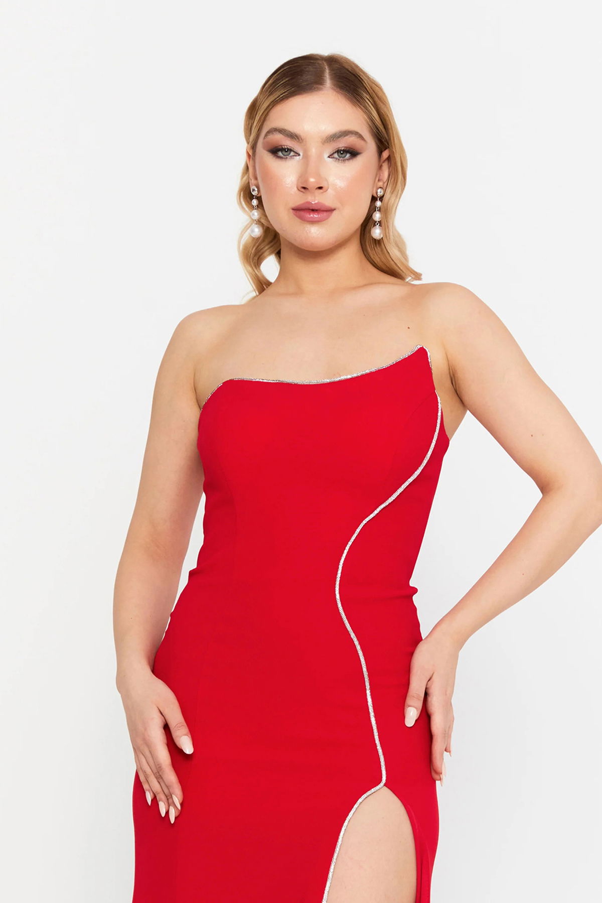 Şeref Vural Kadın Straplez Derin Yırtmaçlı Geniş Beden Aralıklı Uzun Abiye Elbise 8262 Kırmızı