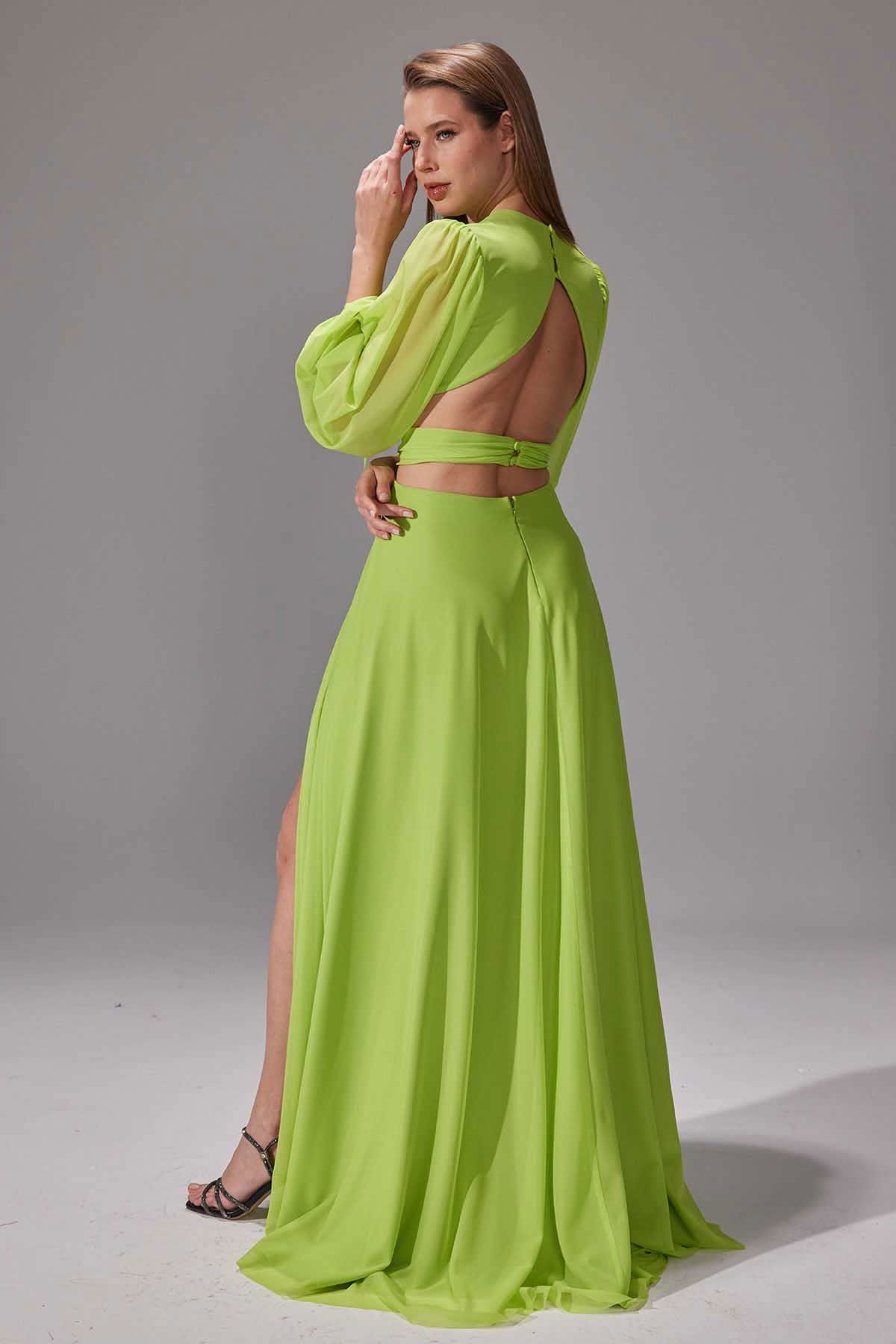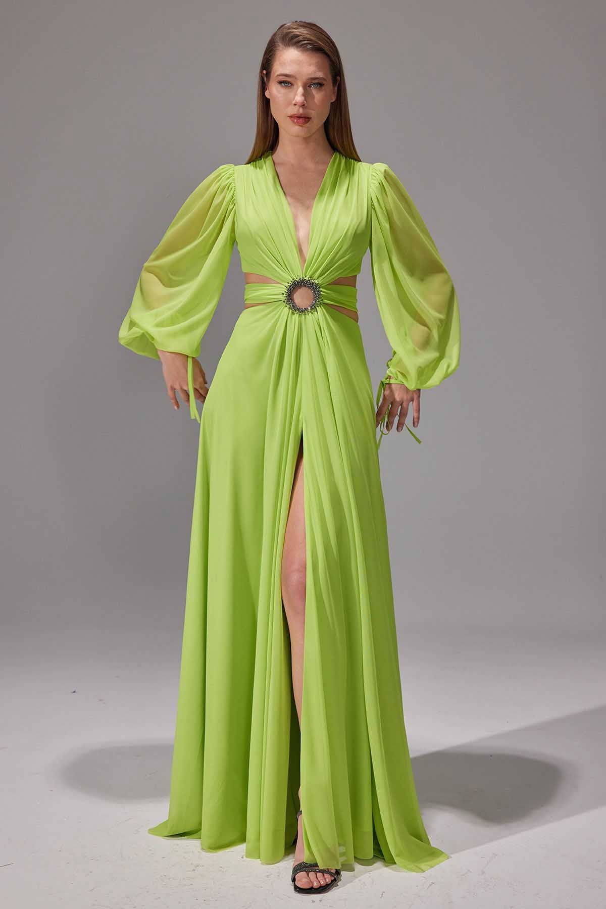 Detay: Derin V yaka, sırt detaylı, derin yırtmaçlı, kemerli, astarlı abiye elbise;