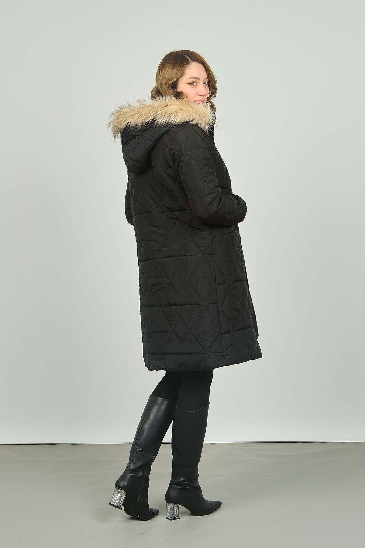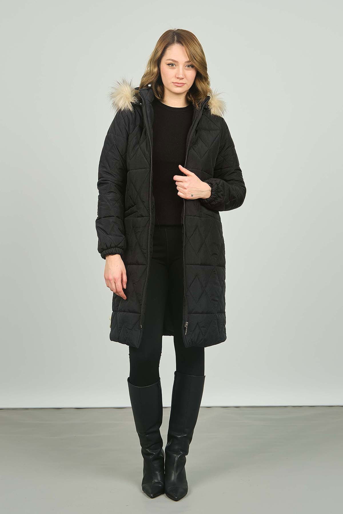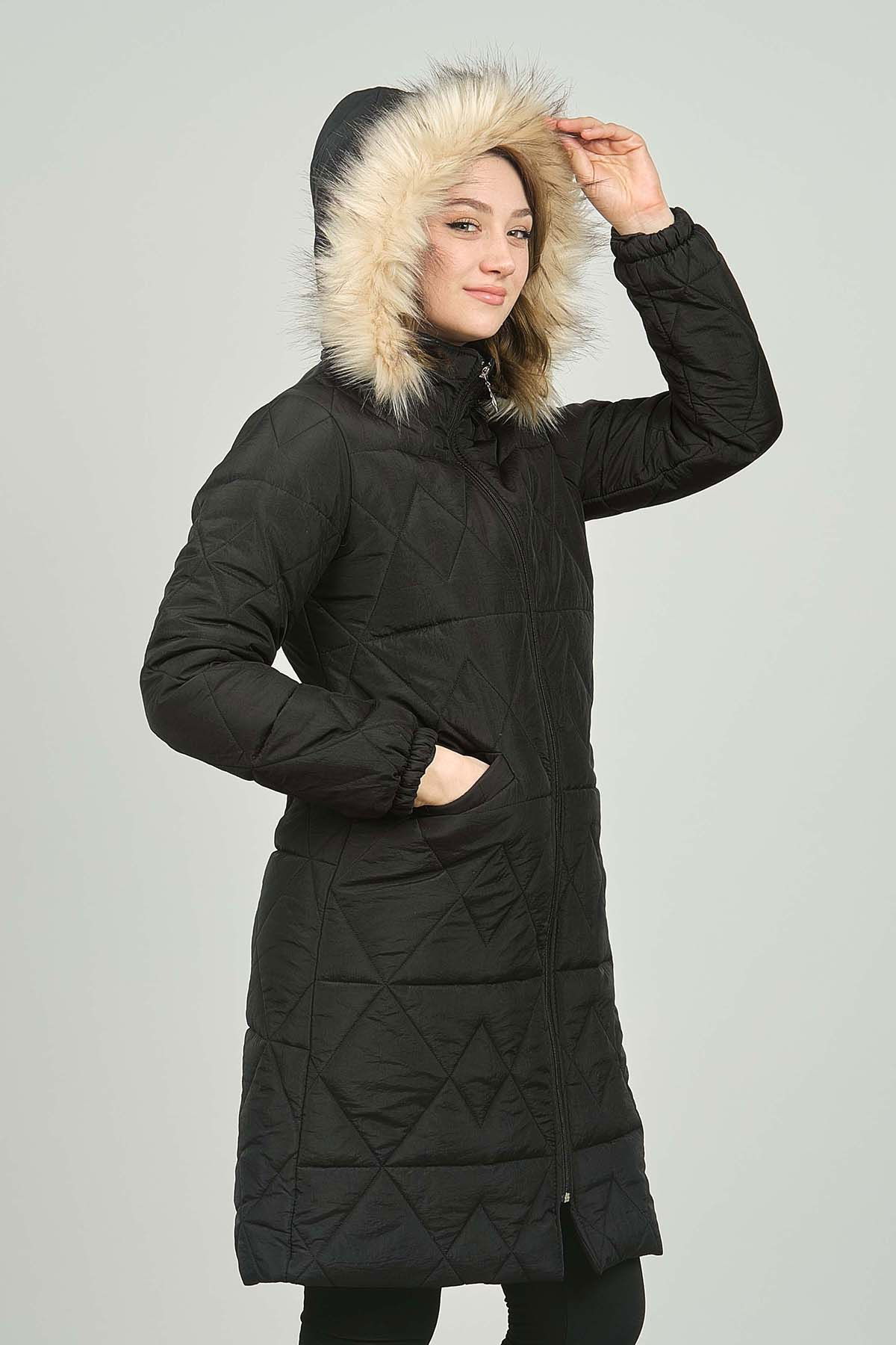Detay: Kapüşonlu, fermuar kapamalı, astarlı, uzun mont ;