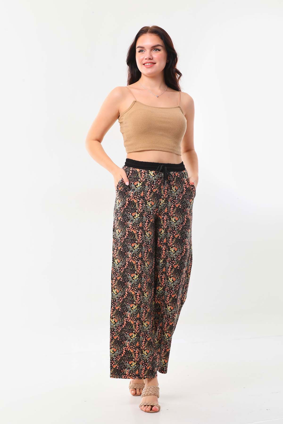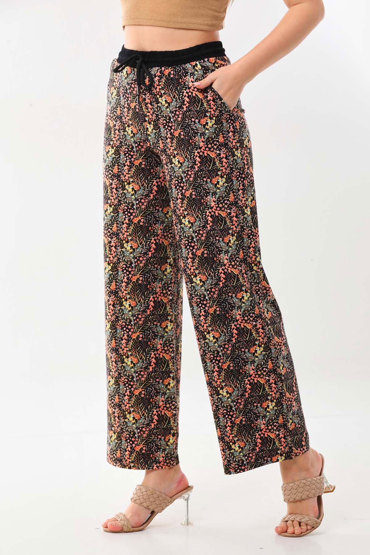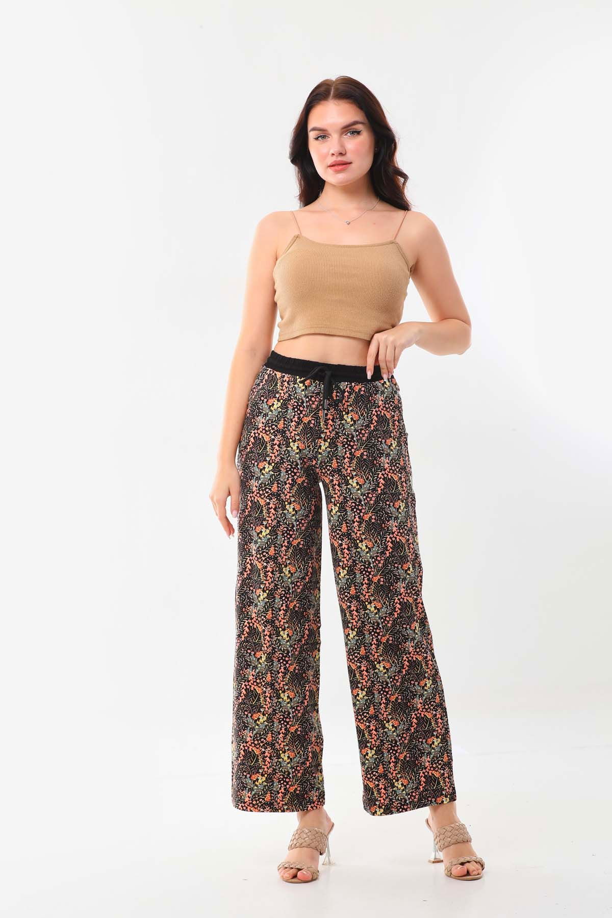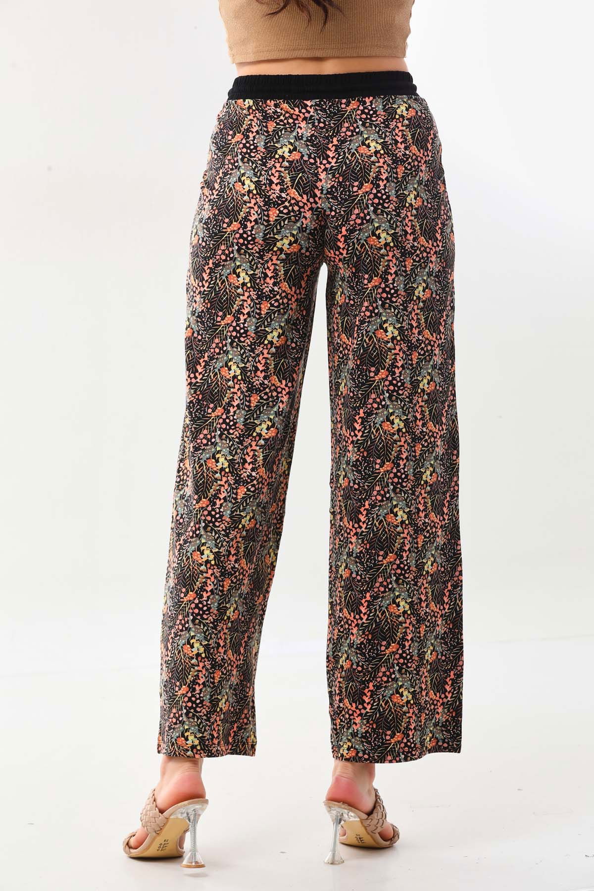Detay: Desenli, belden bağlamalı, beli lastikli, rahat form pantolon;