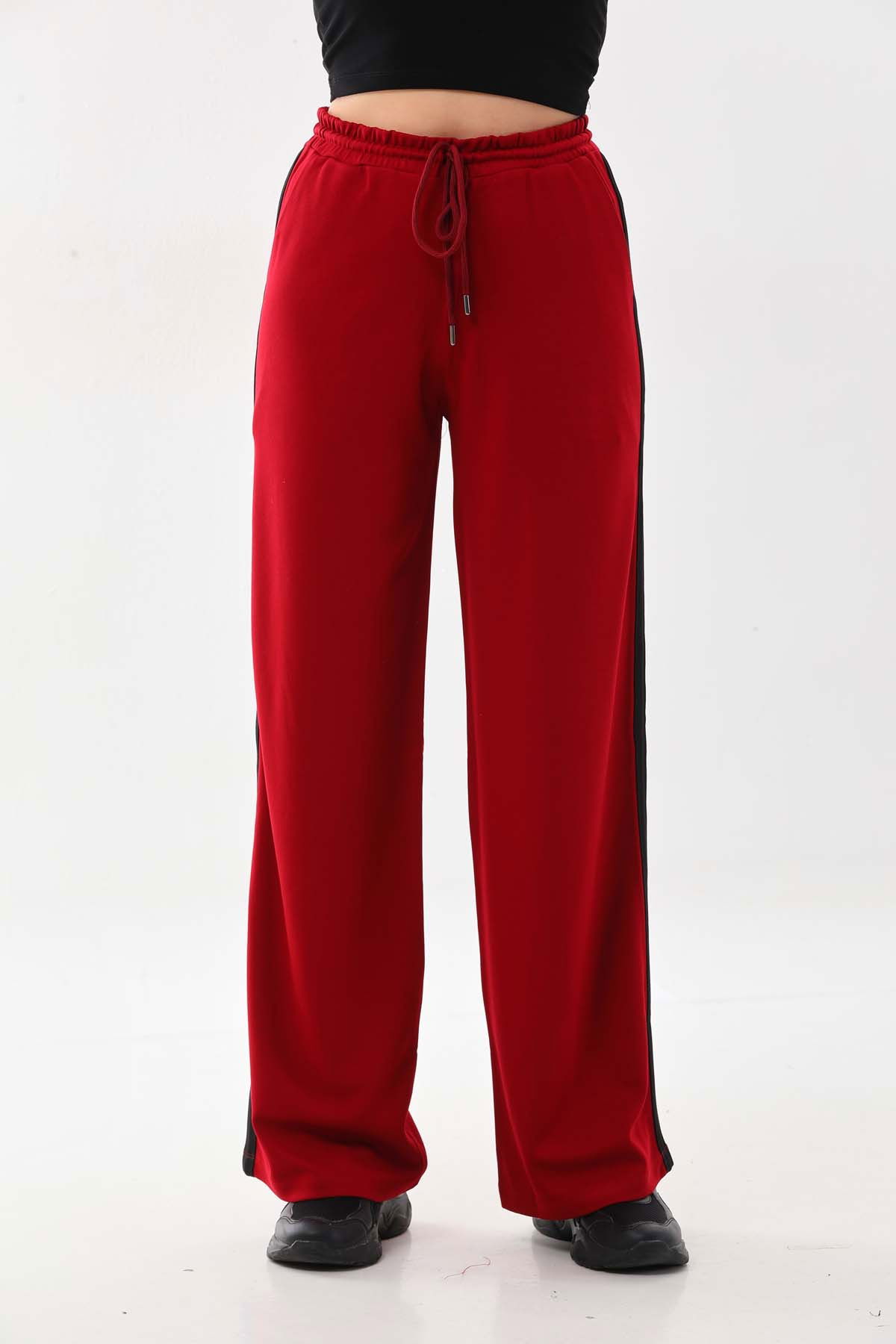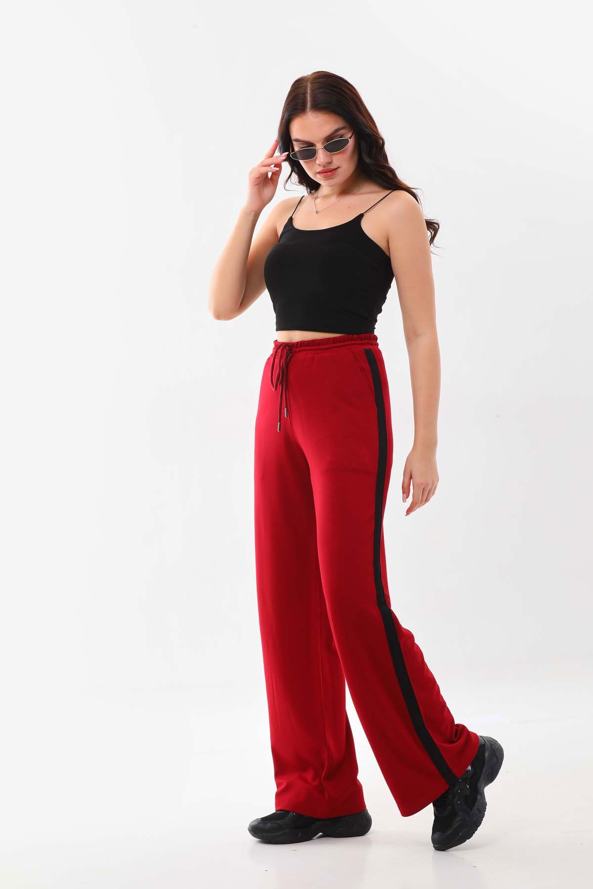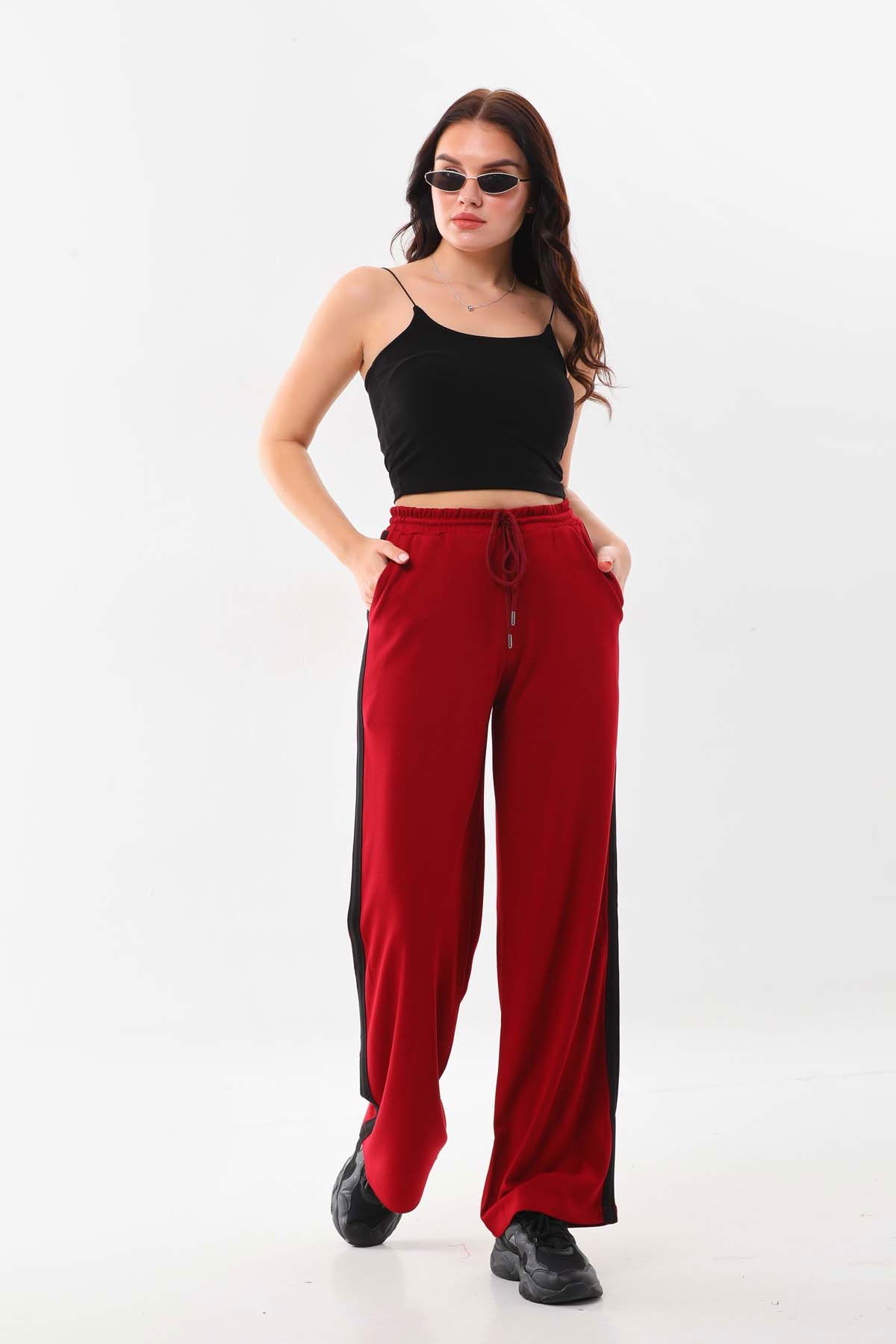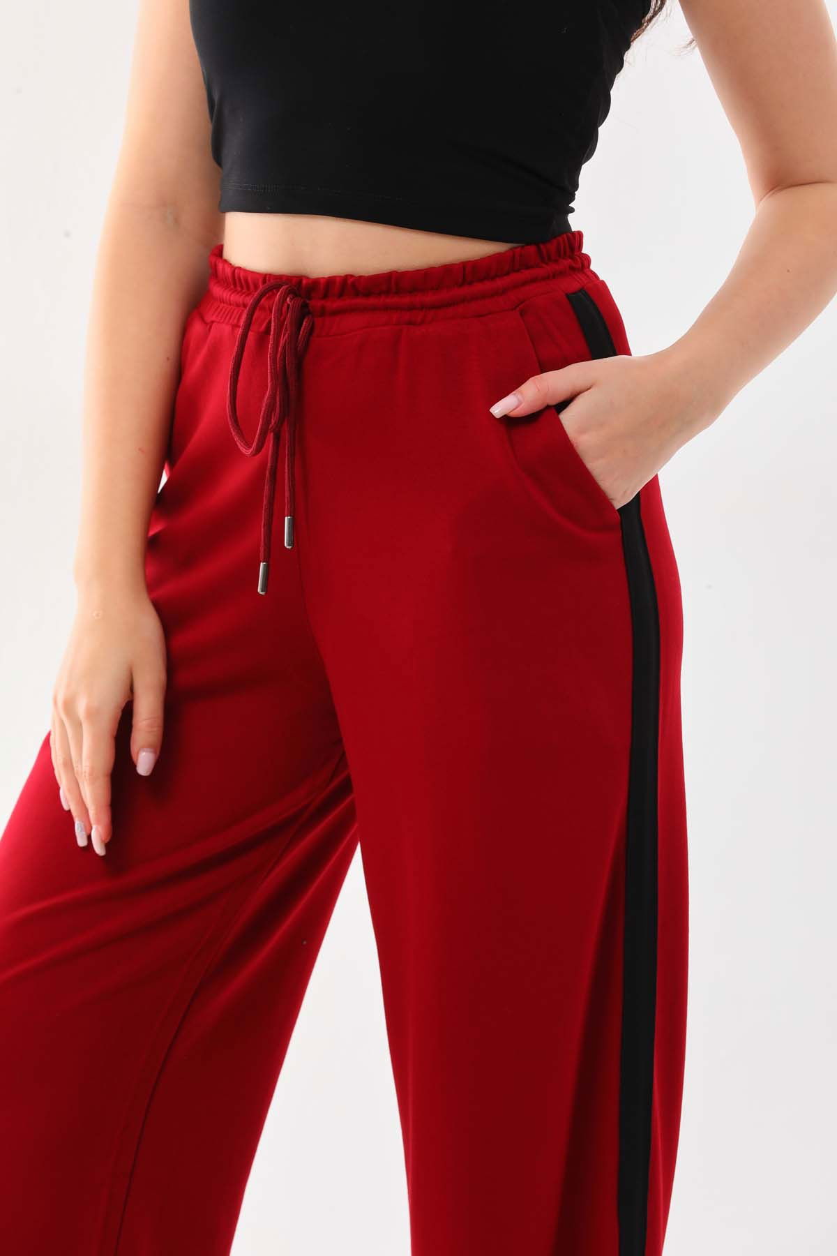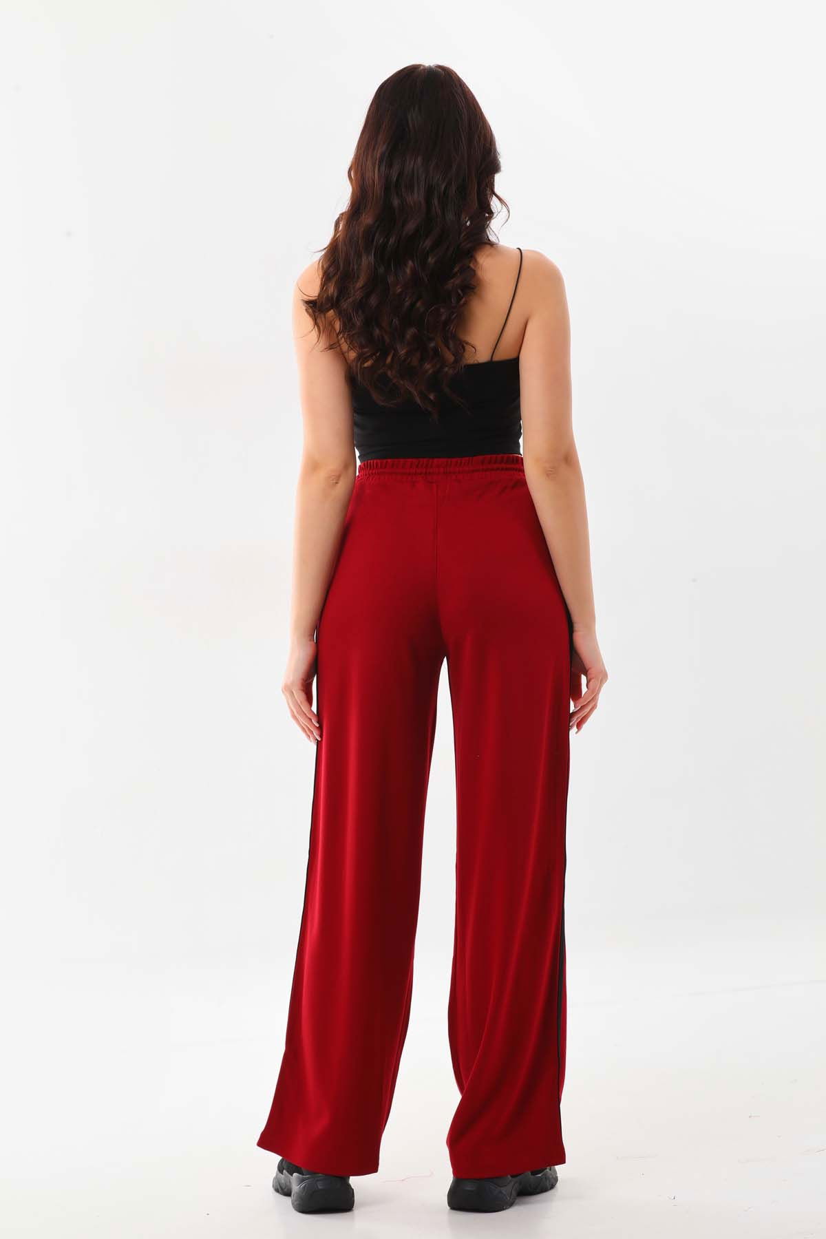 Detay: Belden bağlamalı, lastikli, kenarları şerit detaylı, rahat form pantolon;
