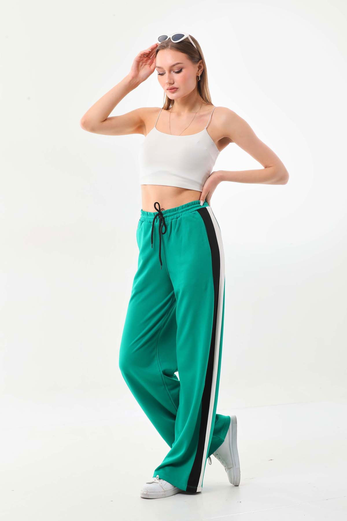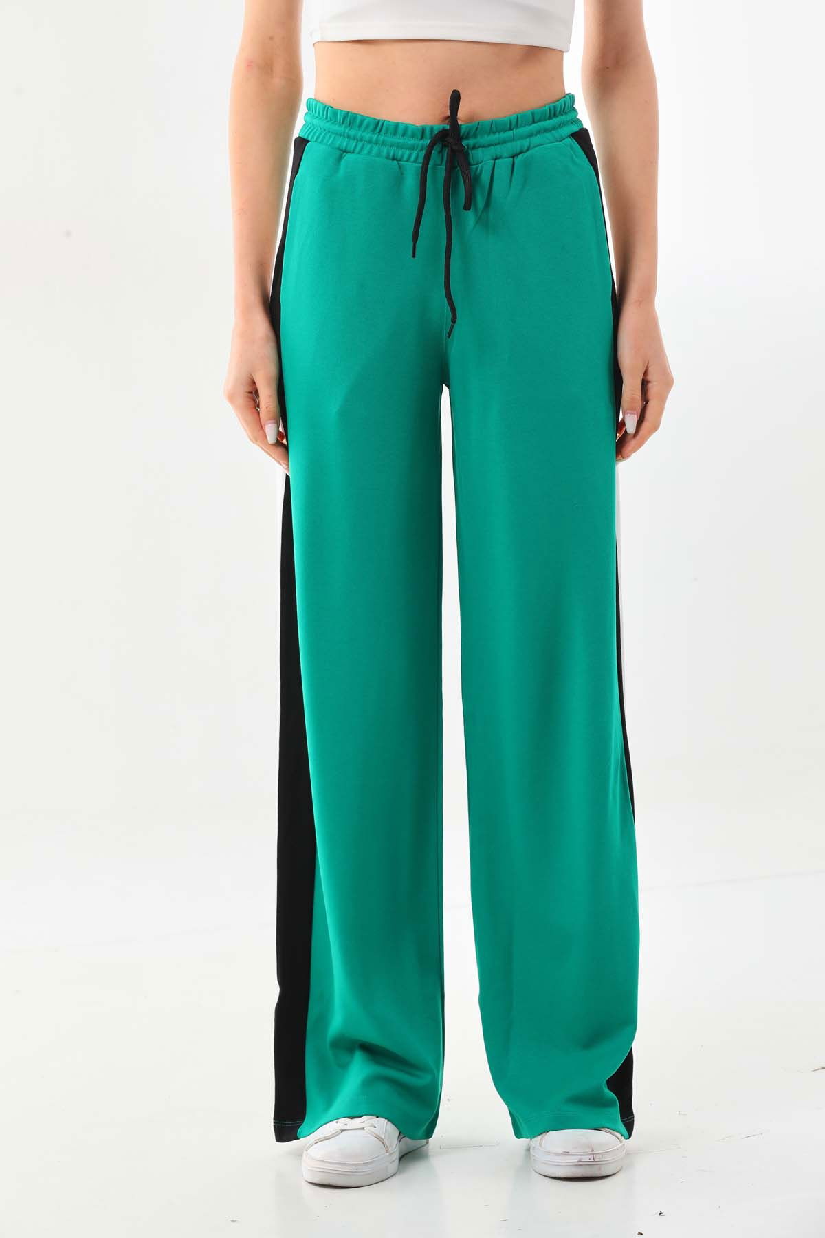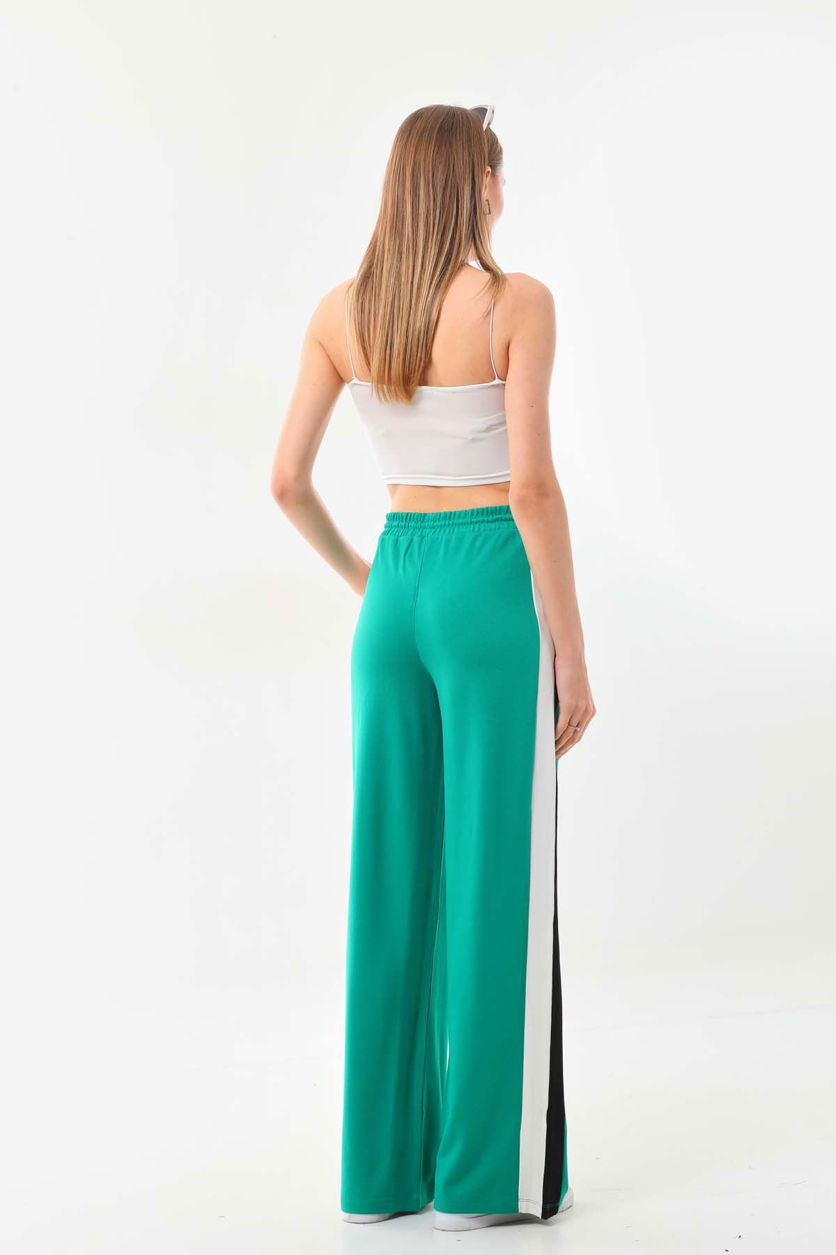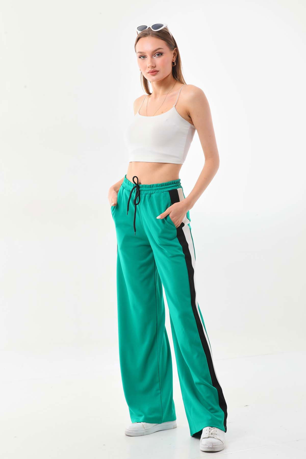 Detay: Yanları şerit detaylı, belden bağlamalı, lastikli, rahat form pantolon;
